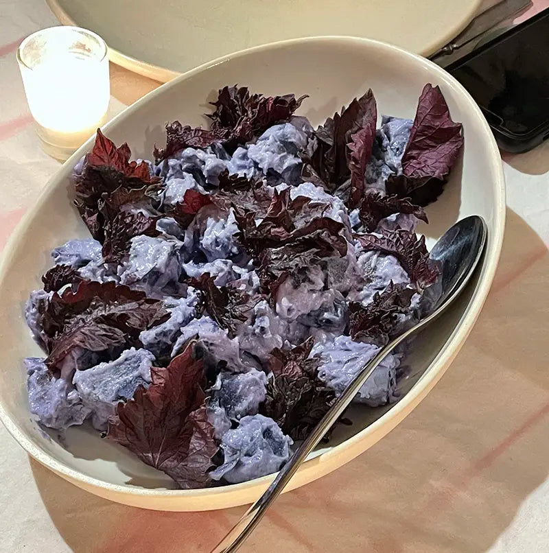 Purple potatoes with coconut yogurt in a Homa serving bowl
