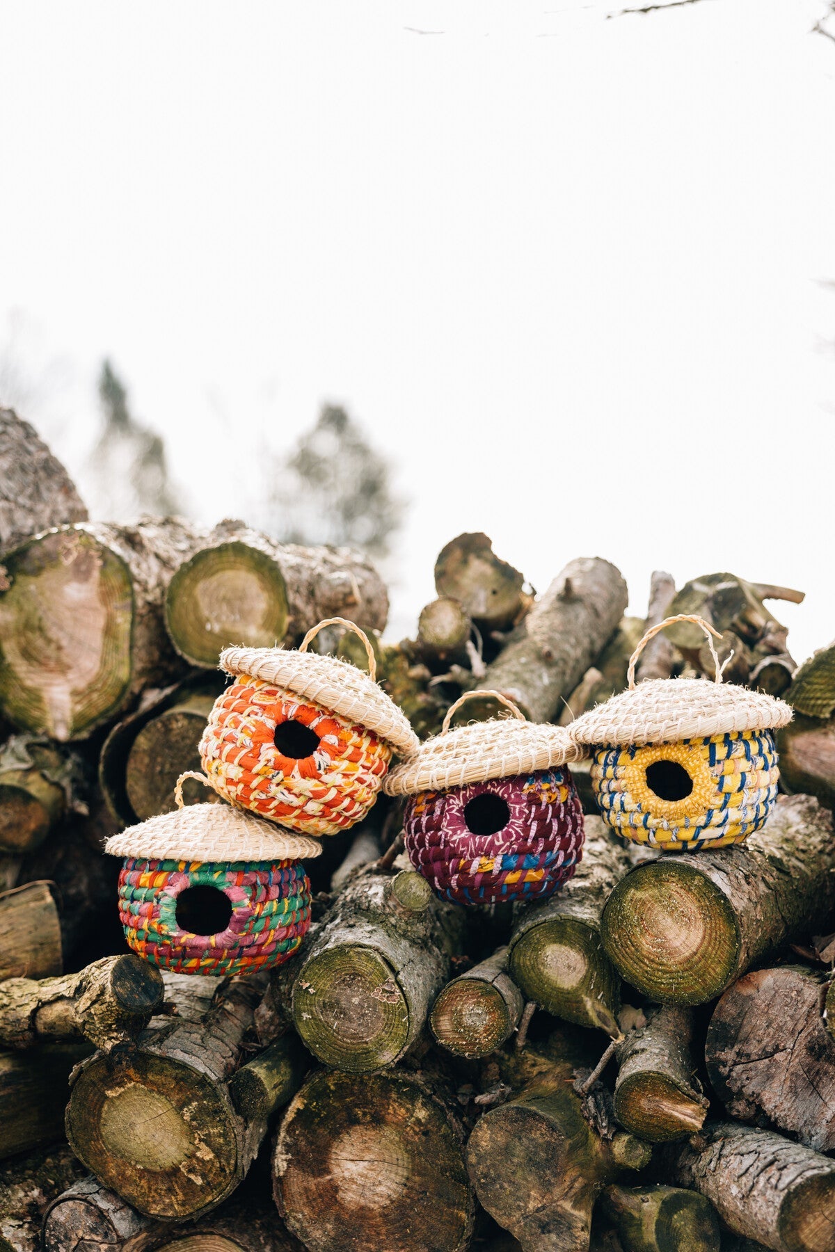 Cute as can be Acorn Sari Birdhouse makes the perfect little home for your feathery friends. Sit nearby, not too close, and watch as they fly in, take a rest, and fly off. Nut hatches. Sparrows. Who knows who may visit! Made with recycled sari and fast-growing kaisa grass, this is an eco-friendly stay! Handcrafted by artisans with Prokritee, an organization that provides jobs and skills training for women in under-resourced communities in Bangladesh.