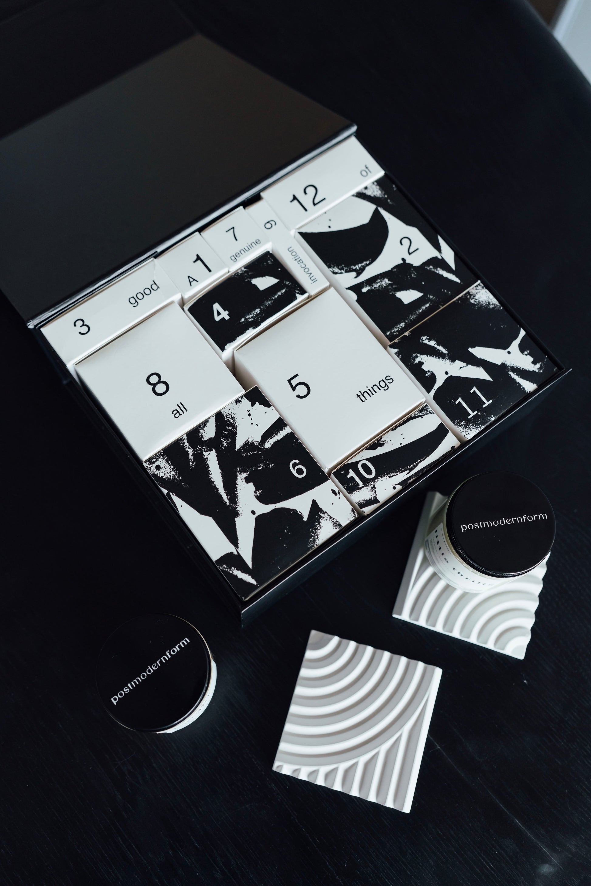The ultimate postmodernform gift, this 12-piece advent calendar contains 12 unique postmodernform items, including 3 full-size candles, limited edition discovery-sized candles, various concrete pieces, and complementary decor items to delight the most discerning of giftees. Contents valued at over $170. Advent calendar size: 11in L x 9.5in W x 4in D / 28 cm L x 24 cm W x 10cm D. Products from postmodernform are always cruelty-free and small-batch, handmade in either San Francisco or Raleigh, USA. FREE SHIPPING on all orders $50+ NOTE: Every postmodernform item is handmade, so expect possible slight variations from the making process (like: tiny air bubbles, slight color variations, etc). These variations do not impact product use. Only use as intended.