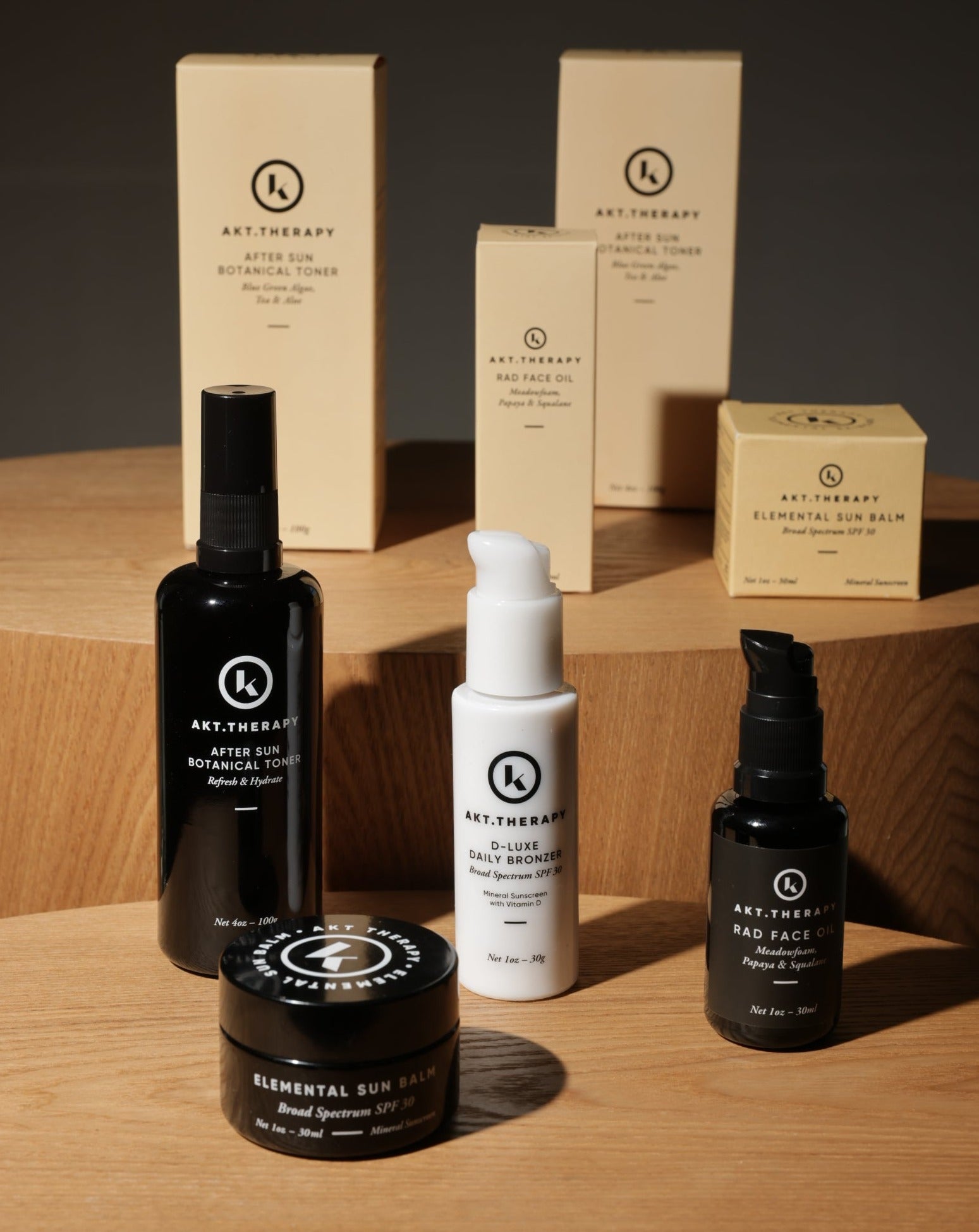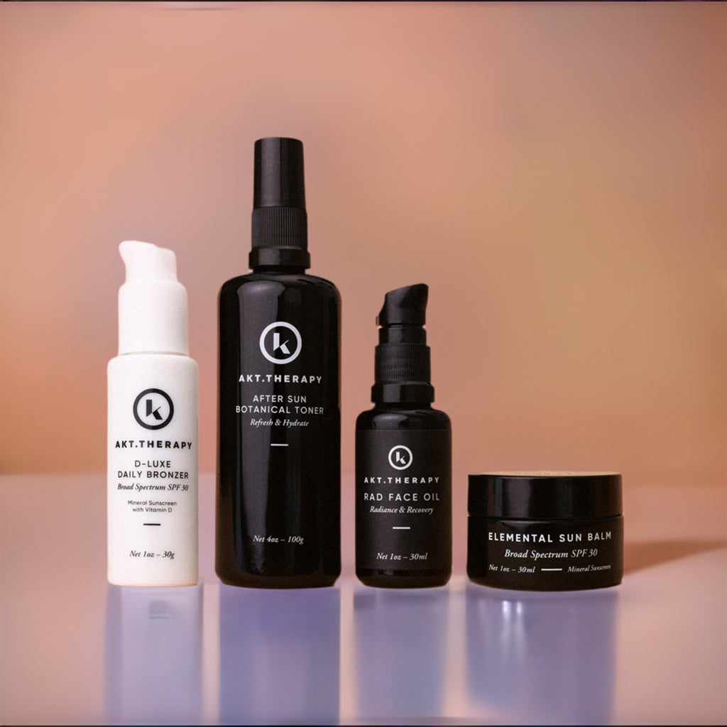 Lightweight and ultra-hydrating Akt Therapy Rad Face Oil with Squalane. Multifunctional anti-aging and cell boosting Akt Therapy After Sun Botanical Toner, with identical moisture retaining capacity as Hyaluronic acid. Lush, moisturizing Akt Therapy Elemental Sun Balm SPF 30 is a tinted multi-use face balm that provides a dewy balmy finish and effective sun protection. Silky, lightweight Akt Therapy D-Luxe Daily Bronzer SPF 30 protects skin while providing a natural bronze glow. Why— Buildable luxurious daily hydration and ultimate SPF protection for dry, sensitive, mature skin types