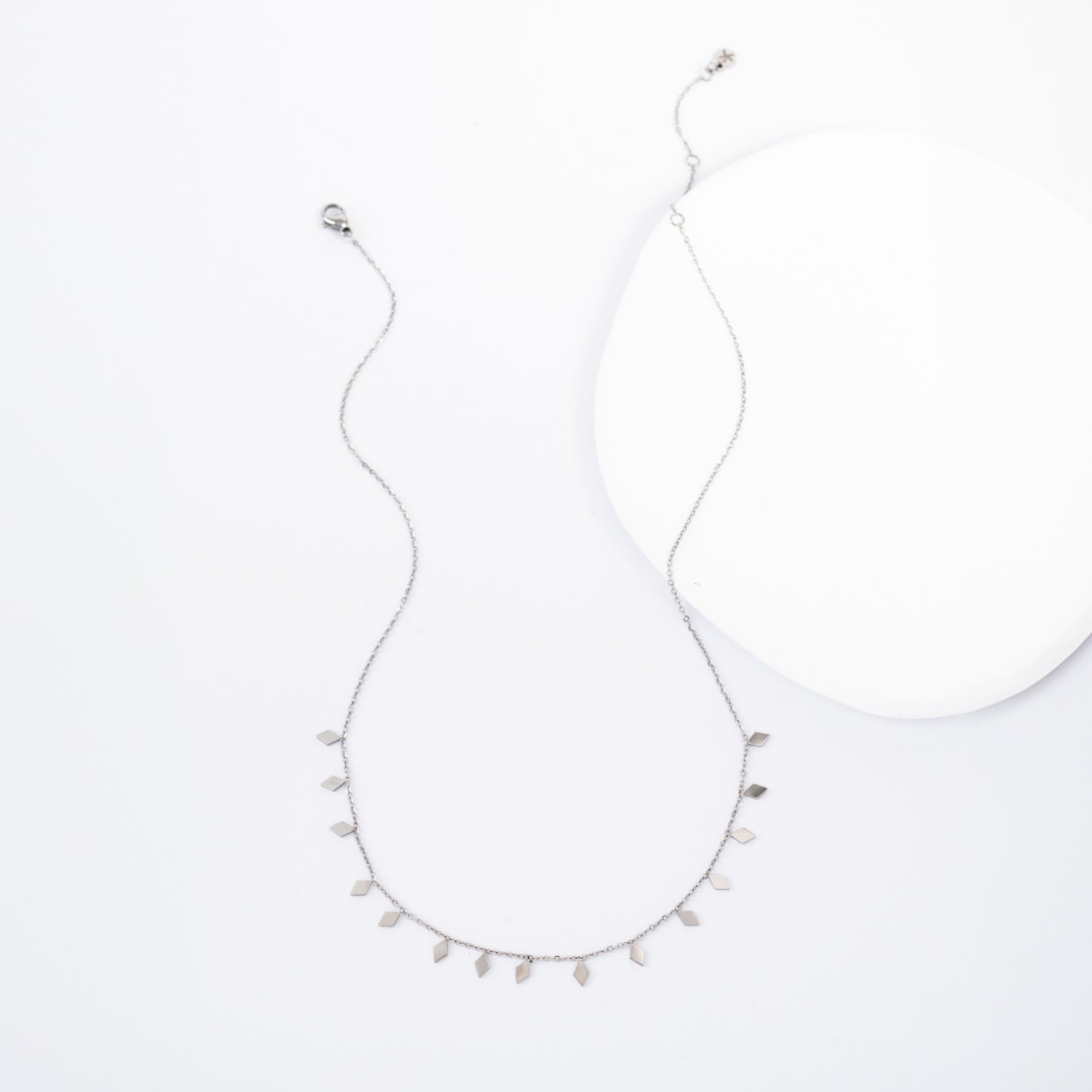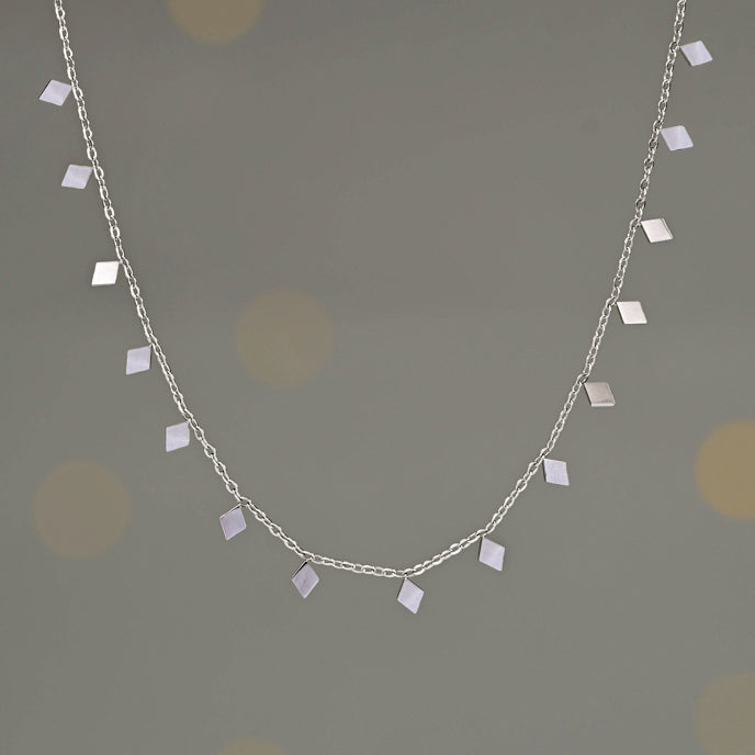 This shiny silver must-have necklace features a dainty chain adorned with chic diamond-shaped pendants. Wear the All is Bright Necklace alone or layer it up for a touch of effortless shine to any outfit! Your purchase of the All is Bright Necklace to wear or to gift, gives survivors of human trafficking and exploitation the opportunity to build a bright sustainable life of freedom! Thank you! Box size and color may vary. Materials:Stainless steel necklace Hypoallergenic; lead and cadmium free with nickel content less than 100 ppm. Size:16-18 inches