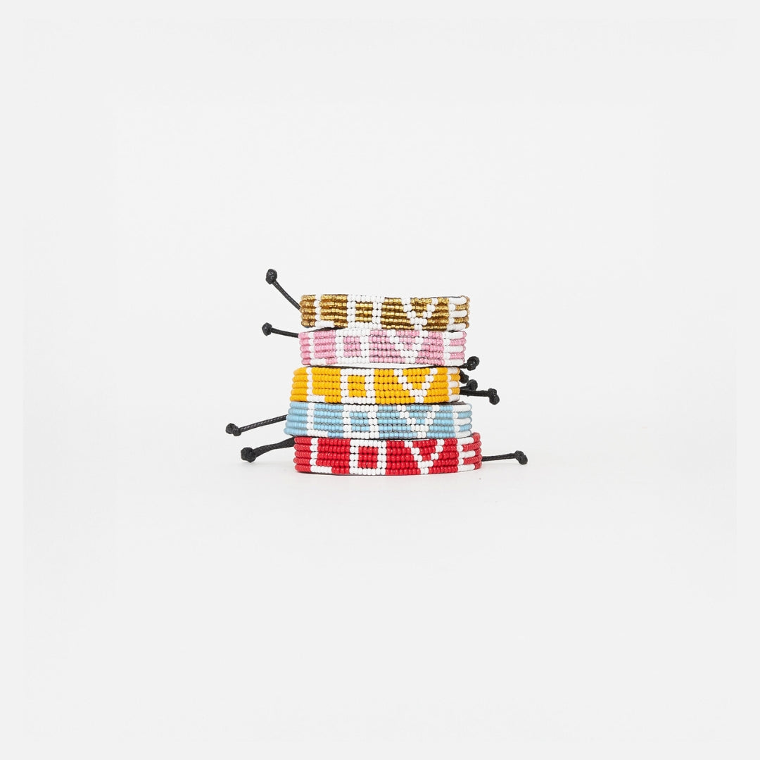 - Each bracelet features the word "LOVE" spelled out in colorful beads.
