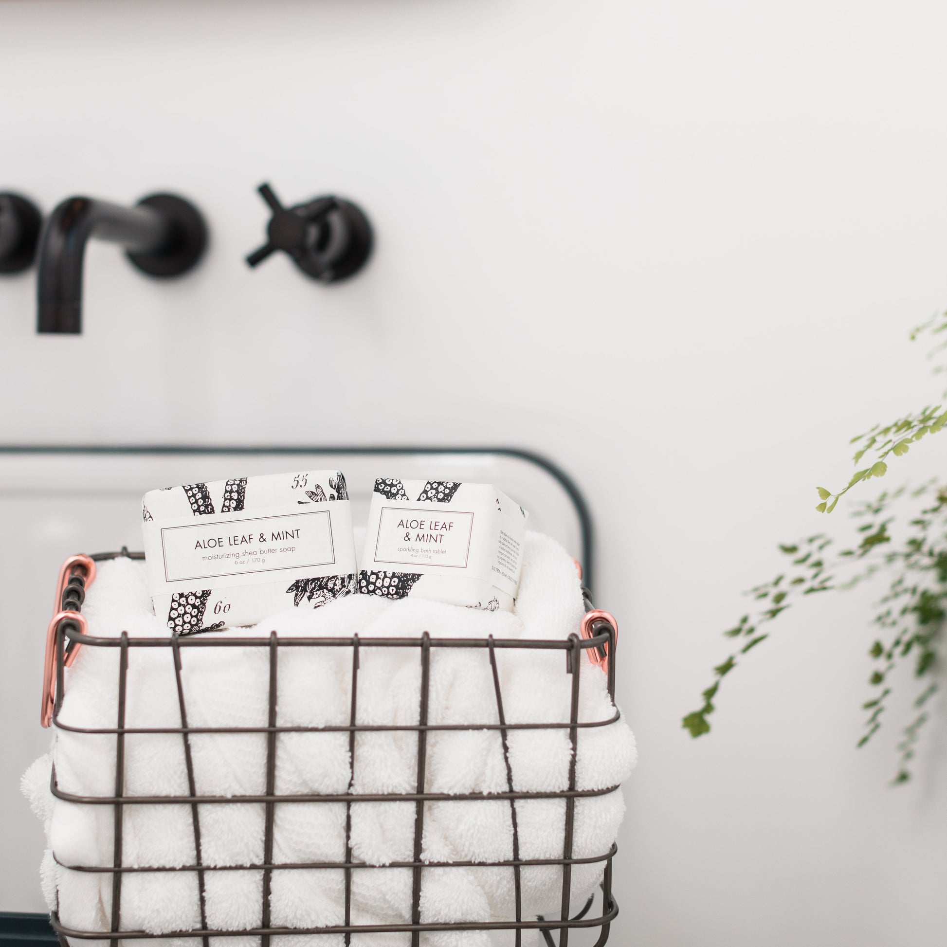 Aloe Leaf & Mint blend is our most invigorating, zesty, and "clean" scent. We blend fresh aloe leaf with cooling mint and add a touch of black pepper, creating a perfect morning pick-me-up for your self-care routine. This vegan soap bar is perfect for refreshing in the heat for a lingering, clean feeling. Its natural ingredients are gentle and nourishing to your skin, giving it a healthy boost of hydration. Enjoy a fresh shower time experience! SIZE/DESCRIPTION: 6oz. Aloe Leaf & Mint shea butter bath bar packaged in our signature botanical and vintage illustrations. DETAILS: Superfatted to be extra moisturizing and skin softening, these shea butter bath bars are long lasting and luxurious. INGREDIENTS: This handcrafted soap is made in small batches of saponified oils of coconut, RSPO-certified palm, and shea butter. Scented with our own proprietary blend of phthalate free fragrance oils and essential oils. All of Formulary 55 products are made in the USA, vegan, cruelty-free, SLS-free, and paraben free