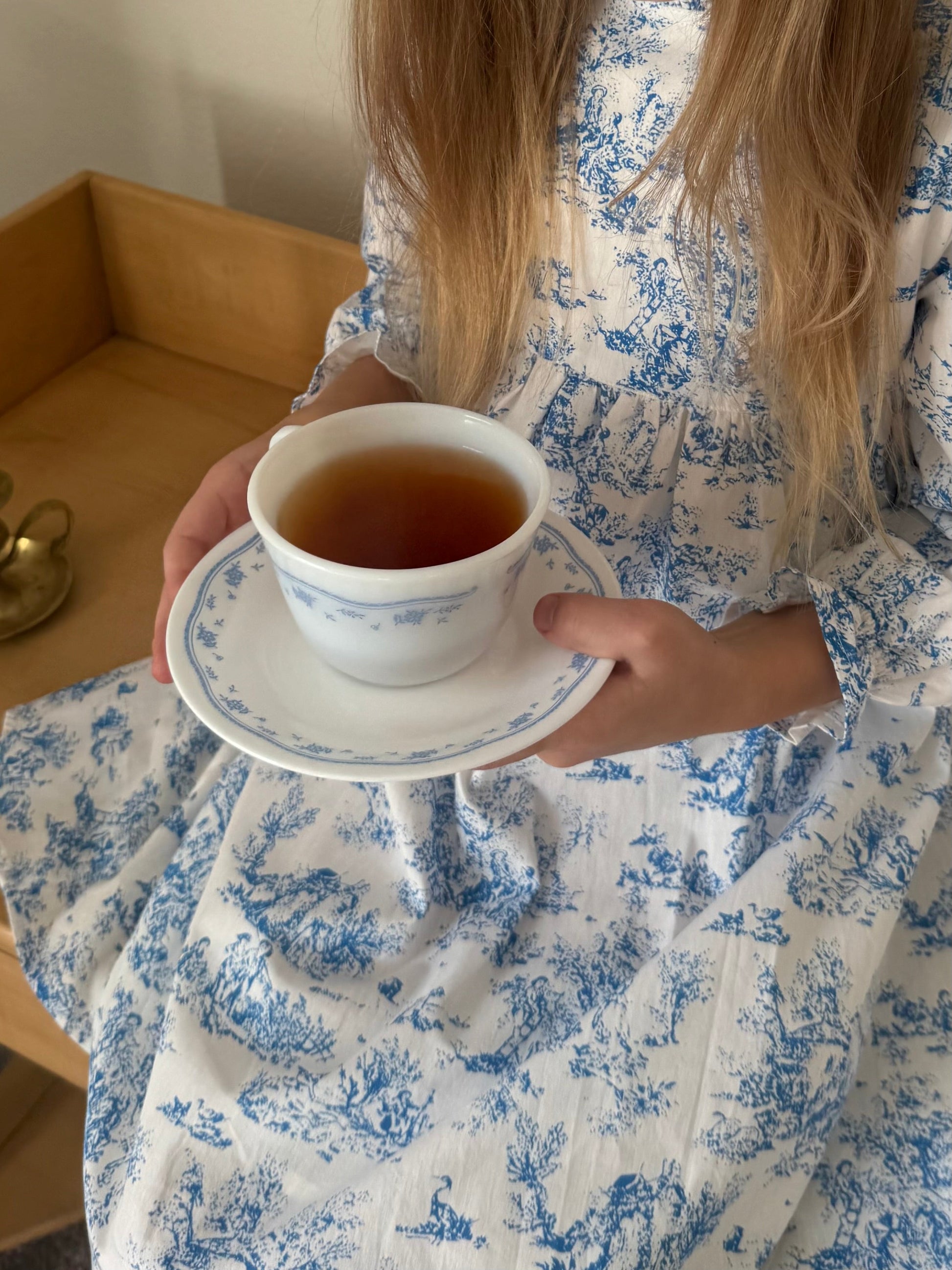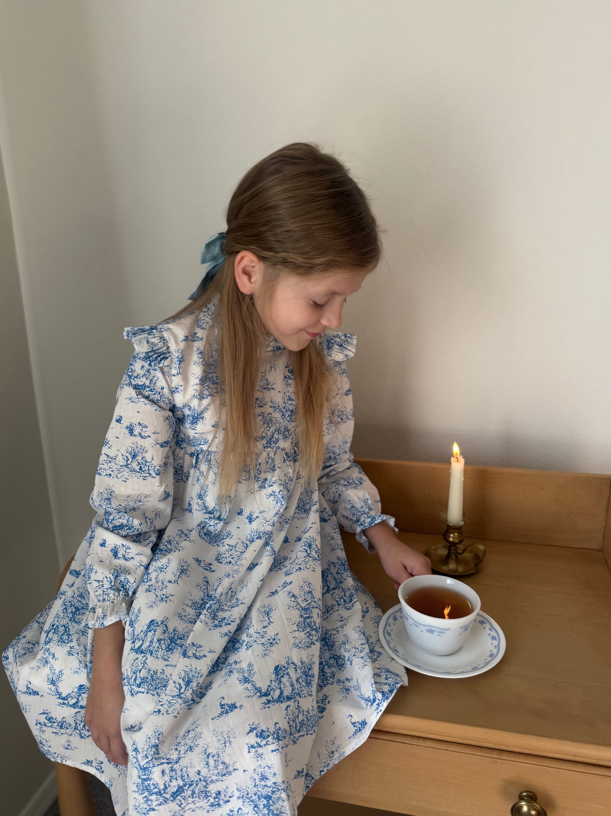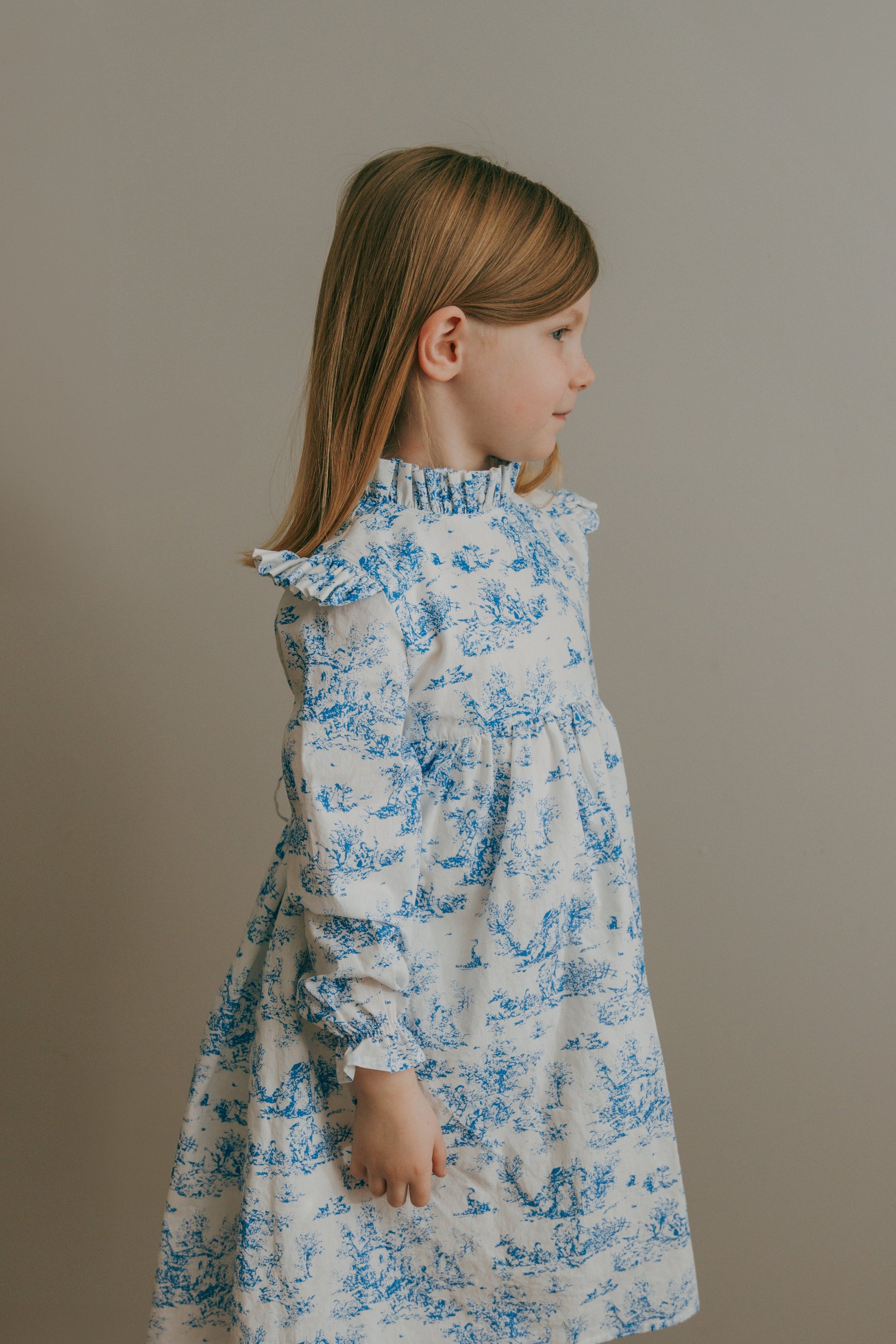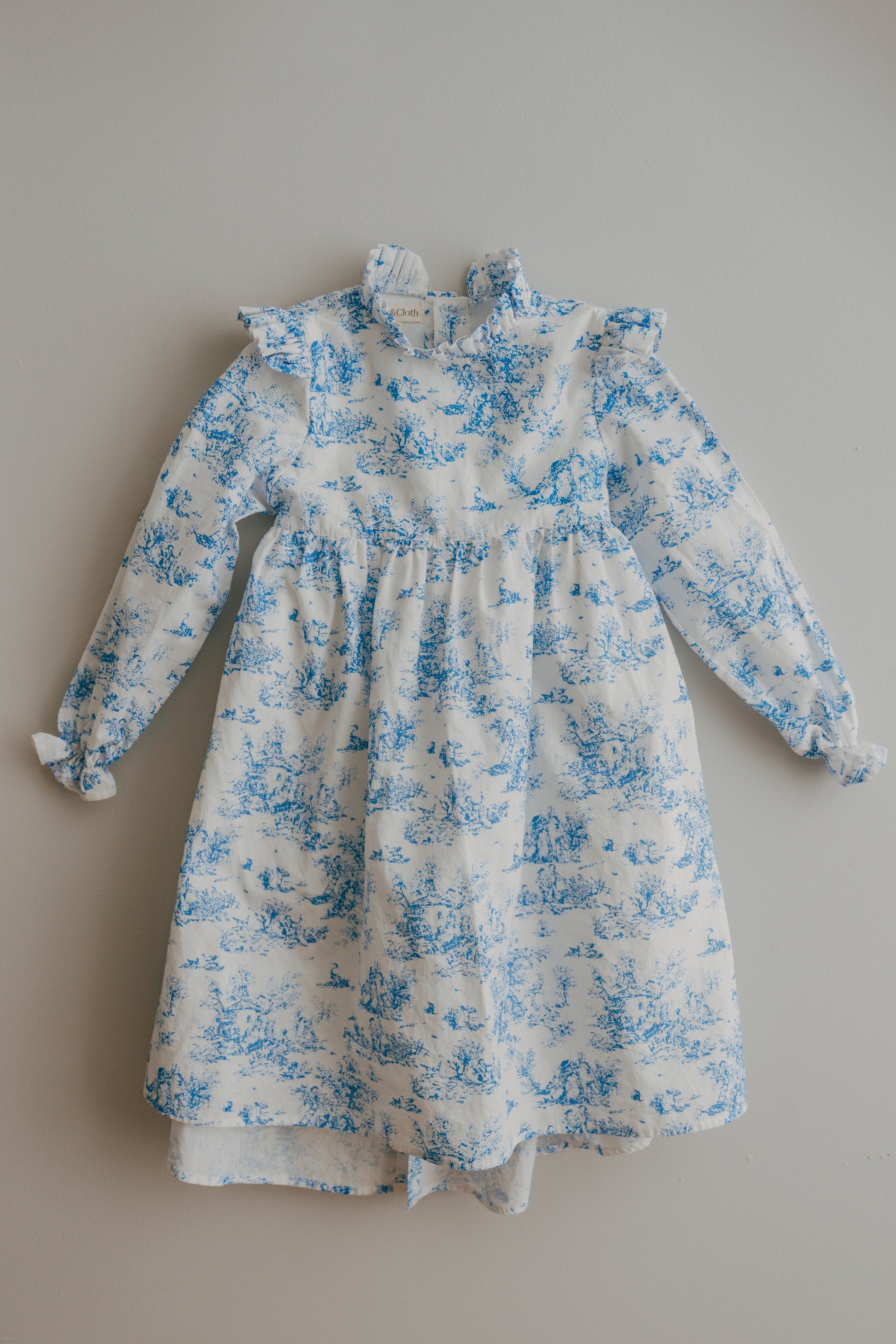 Inspired by vintage French textiles, the Aoki Dress in Blue Toile is a modern heirloom. Crafted from lightweight cotton and fully lined, it features a high ruffle collar, adjustable tie-back waist, covered buttons down the back, and soft puff sleeves with a ruffle shoulder cuff. The scenic toile print evokes timeless childhoods spent exploring gardens and stories passed down through generations. Fabric Composition: 100% organic cotton Care Instructions: - Machine wash on a gentle cycle with cold water. - Use mild, eco-friendly detergent. - Avoid bleach or harsh chemicals. - Lay flat to dry or tumble dry on low heat. - Iron on low if needed