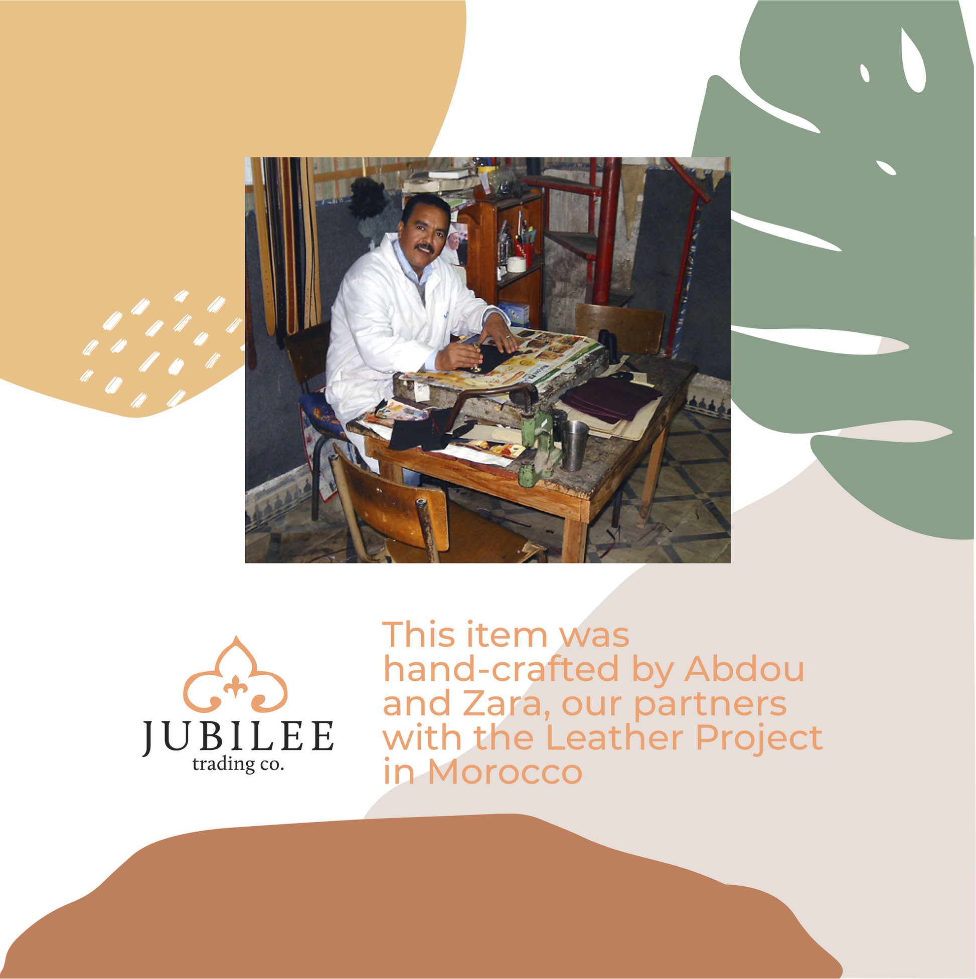 The Atlas Mountains define the Moroccan landscape, separating the Mediterranean coast from the Sahara Desert. Our totes are inspired by these rugged ranges with their simple form built from thick raw cowhide for durability. Measures approximately: 17" wide at top 11" wide at base 6.5" deep 11.5 inches tall 10.5" drop handle for 22" total length from handle top to base. Features: *exterior pocket (9.5" x 7.5") *interior pocket (8" x 5.5") *interior clip for keys, etc. *full grain leather from thick, stiff, durable cowhide *vegetable-tanned leather using traditional, centuries-old techniques Each item is handmade and measurements may vary slightly. As leather is a natural material, color tone and texture may vary slightly from item to item. Your natural leather item will develop its own unique patina and darken slightly over time. _______________________ Jubilee Trading Co. is a non-profit on mission to create life-transforming employment in our local community + beyond. We work directly with global artisans to make our goods, as well as provide support for other artisan brands through our warehouse and local team. Every product purchased starts a ripple effect of positive impact. With your purchase, you become a part of this story!