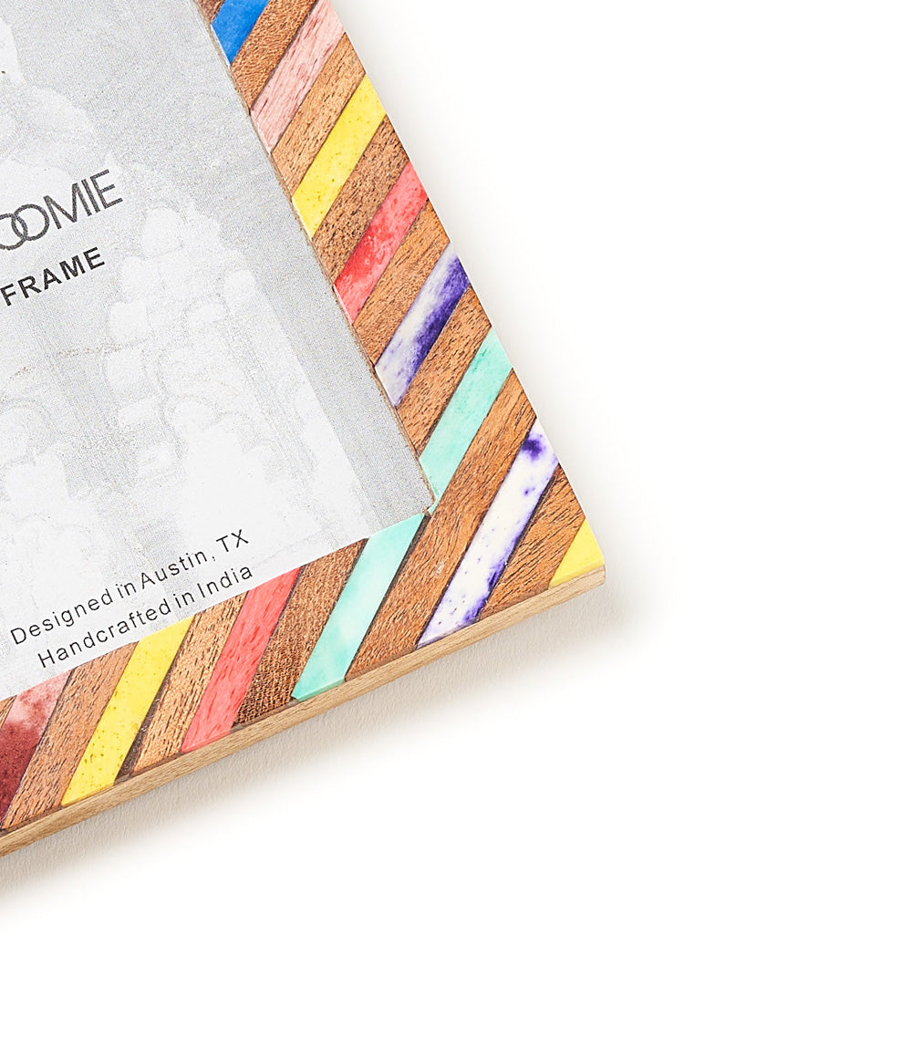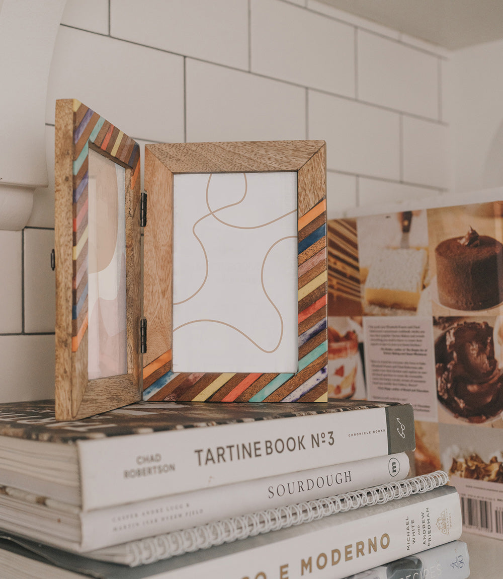 Our Banka Mundi Collection incorporates traditional Indian art forms in modern designs featuring ethically sourced bone and sustainably harvested mango wood. Master artisans in Old Delhi skillfully hand carve wood and bone elements to create unique, eye catching inlay designs. For convenient display, this hinged double photo frame features an adjustable, self-standing design and d-ring for hanging. The picture frame accommodates two 4x6 photos or prints, easily accessed with metal swivel tabs and removable backs.