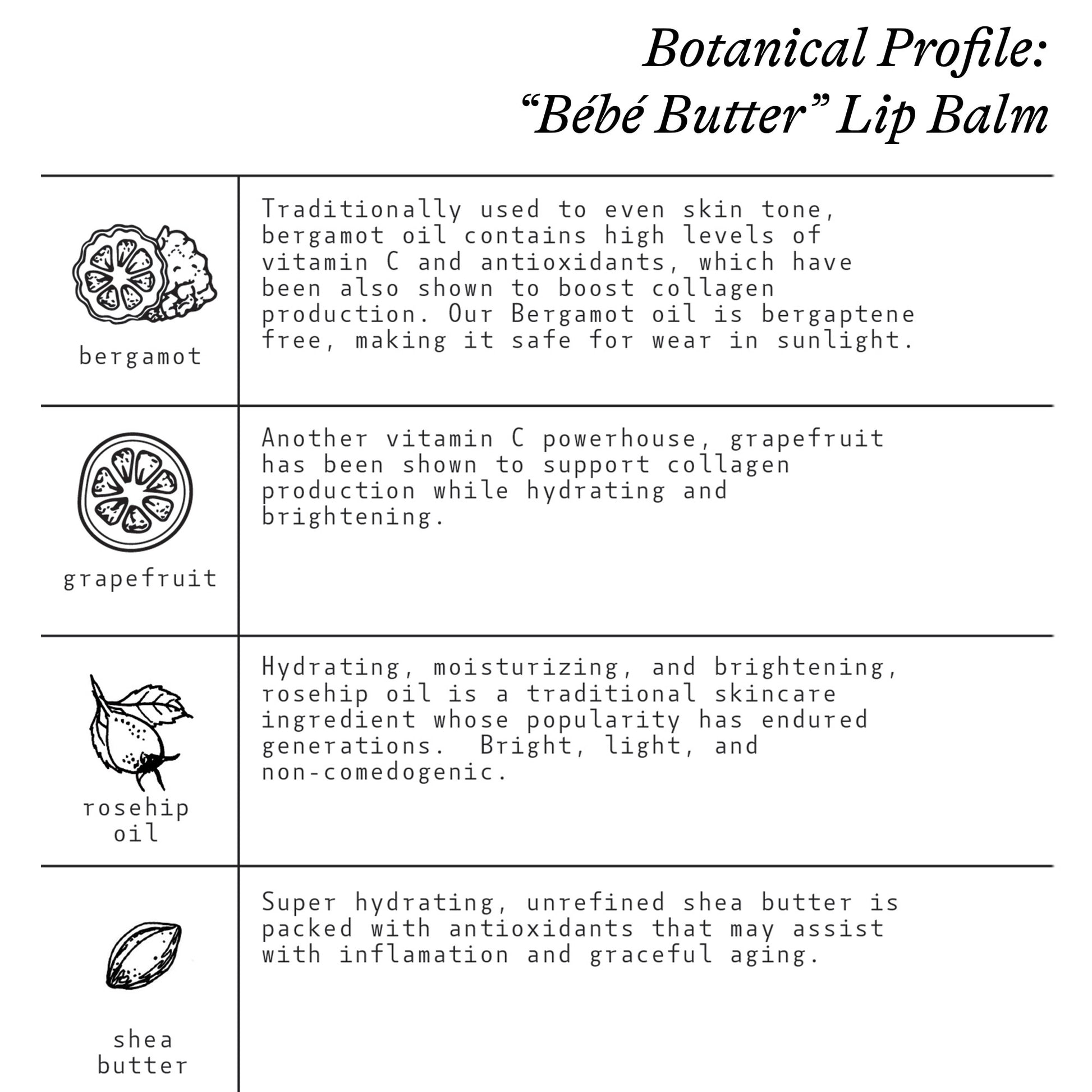YUKA score: 100/100Don't forget your lips when your go natural! As the only skincare product ingested with every application, ensure your choice in lip balm is natural, safe, and luxe. This smooth-as-silk, 100% botanical and beeswax lip balm soothes, hydrates, and softens dry and damaged lips. Made with ultra-moisturizing shea butter, smoothing and brightening rosehip oil, and a bright, citrusy scent featuring notes of grapefruit and bergamot, the concentrated formula glides on with a satiny finish that's never waxy or sticky. Apply alone as needed or as a part of morning or evening moisturizing routines. Suitable for all skin types. Made from 100% cold-pressed and steam-extracted botanical oils, combined with beeswax. Always free from synthetics, fillers, preservatives, and petroleum. Nutrient Summary: Vitamin A, vitamin C, vitamin E, zinc, calcium, polyphenols, flavonoids, tocopherols, oleic acid, linoleic acid, palmitic + stearic acids, omega acids including 3, 6, and 9. Usage and Tips: •Apply before bed for overnight hydration. •Use as a base under lipstick for a smooth application. •Dab on cheekbones for a natural highlight. •Apply frequently during cold weather to prevent chapping. •Use on cuticles for quick hydration. Get creative: Mix with a bit of sugar for a gentle lip scrub. Ingredients: BUTYROSPERMUM PARKII (shea) BUTTER*, ROSA CANINA (rosehip) FRUIT OIL*, CERA ALBA (beeswax), CITRUS AURANTIUM BERGAMIA (bergamot) FRUIT OIL, CITRUS PARADISI (grapefruit) PEEL OIL**denotes organic ingredient