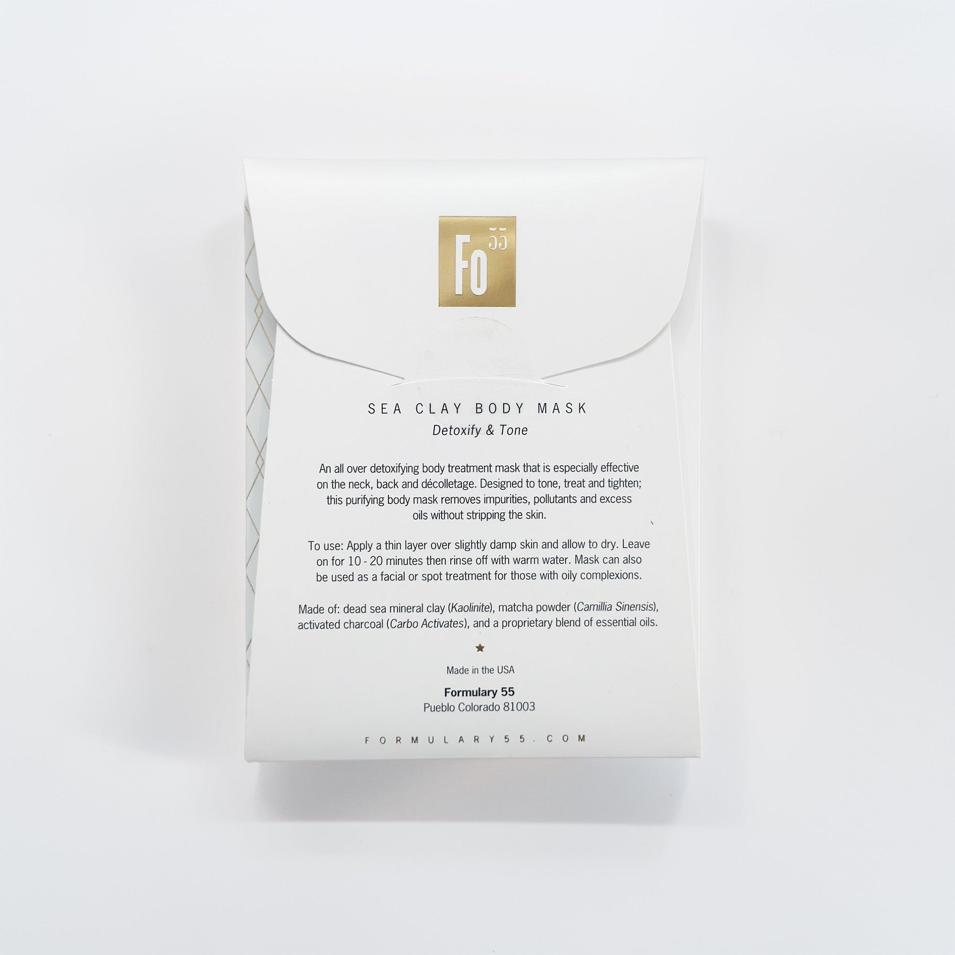 SIZE/DESCRIPTION: An all over detoxifying body treatment mask that is especially effective on the neck, back, and decolletage. Designed to tone, treat, and tighten; this purifying body mask removes impurities, pollutants, and excess oils without stripping the skin. DETAILS: To use: Mix 1/2 of a packet with water. Apply a thin layer over damp skin and allow to dry. Leave on for 10-20 minutes then rinse off with warm water. Mask can also be used as a facial or spot treatment for those with oily complexions. INGREDIENTS: Dead sea mineral clay, matcha powder, activated charcoal, and a proprietary blend of essential oils.
