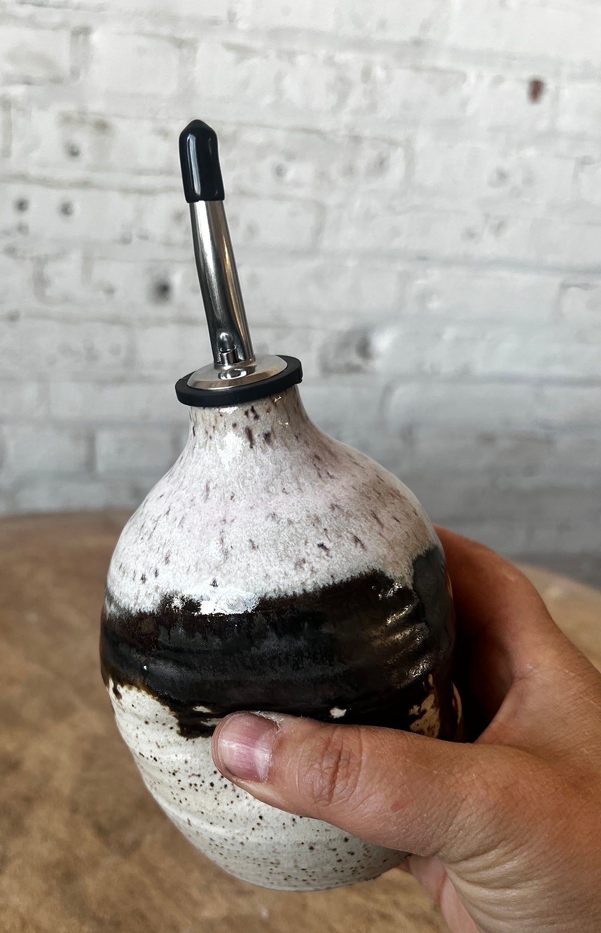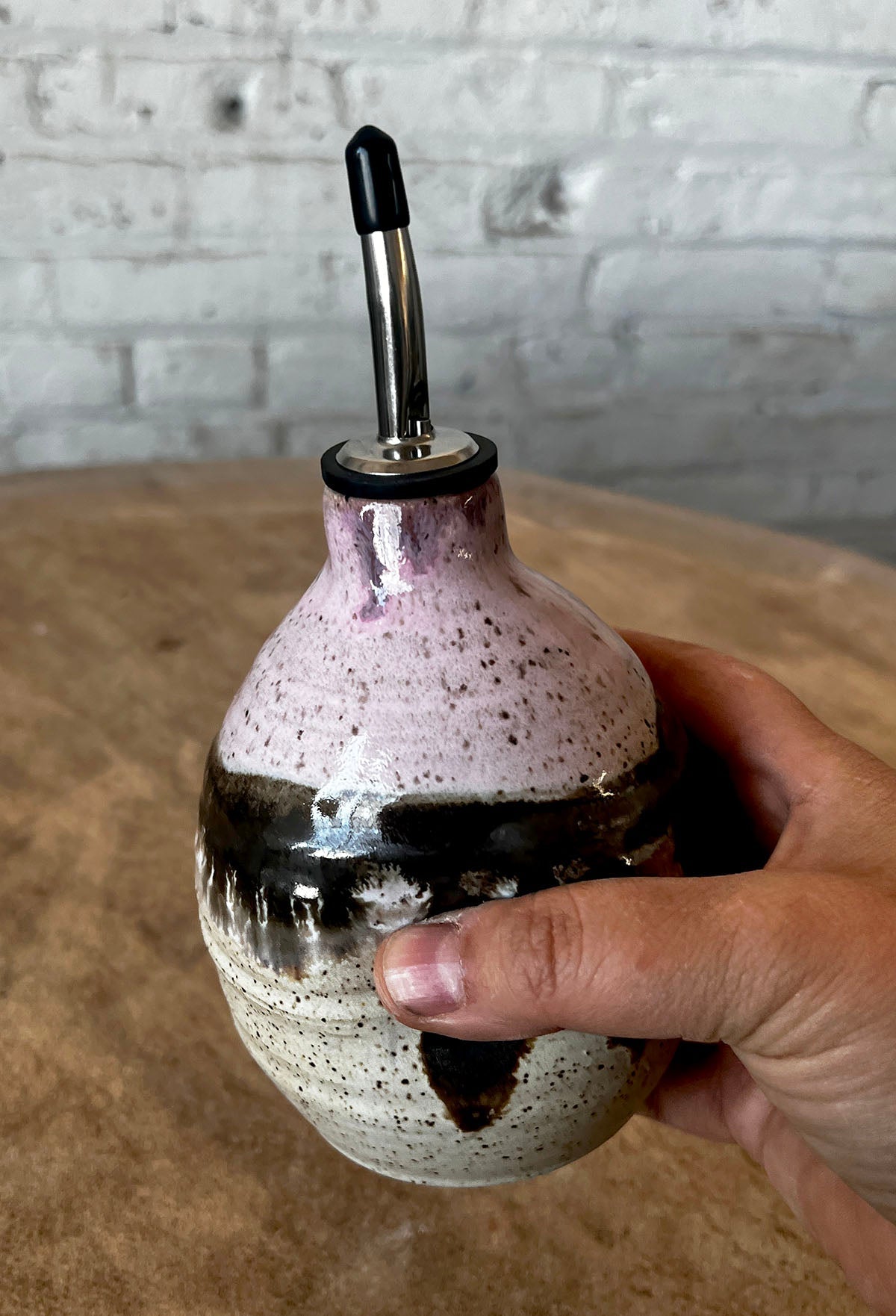 This item is a best seller! Add a touch of elegance to your kitchen with the Borealis Ceramic Oil Cruet from Gina DeSantis Ceramics. This hand-thrown cruet is not only practical but also beautifully designed with three thumbprint indentations for easy grip and a narrow neck spout for drip-free pouring. It stands 5.5 inches tall (7.5 inches with the spout) and holds approximately 16 ounces of oil or vinegar. Whether you're cooking up a storm or hosting a dinner party, this ceramic oil cruet will surely impress with its functionality and style. Dusk: Contains more bright pink tones Dawn: More of a neutral mix. The pink is subtle. *All of my products are made by hand and will vary. Each glaze firing varies as well. Please keep this and my refund policy in mind when you place your order. Thank you.