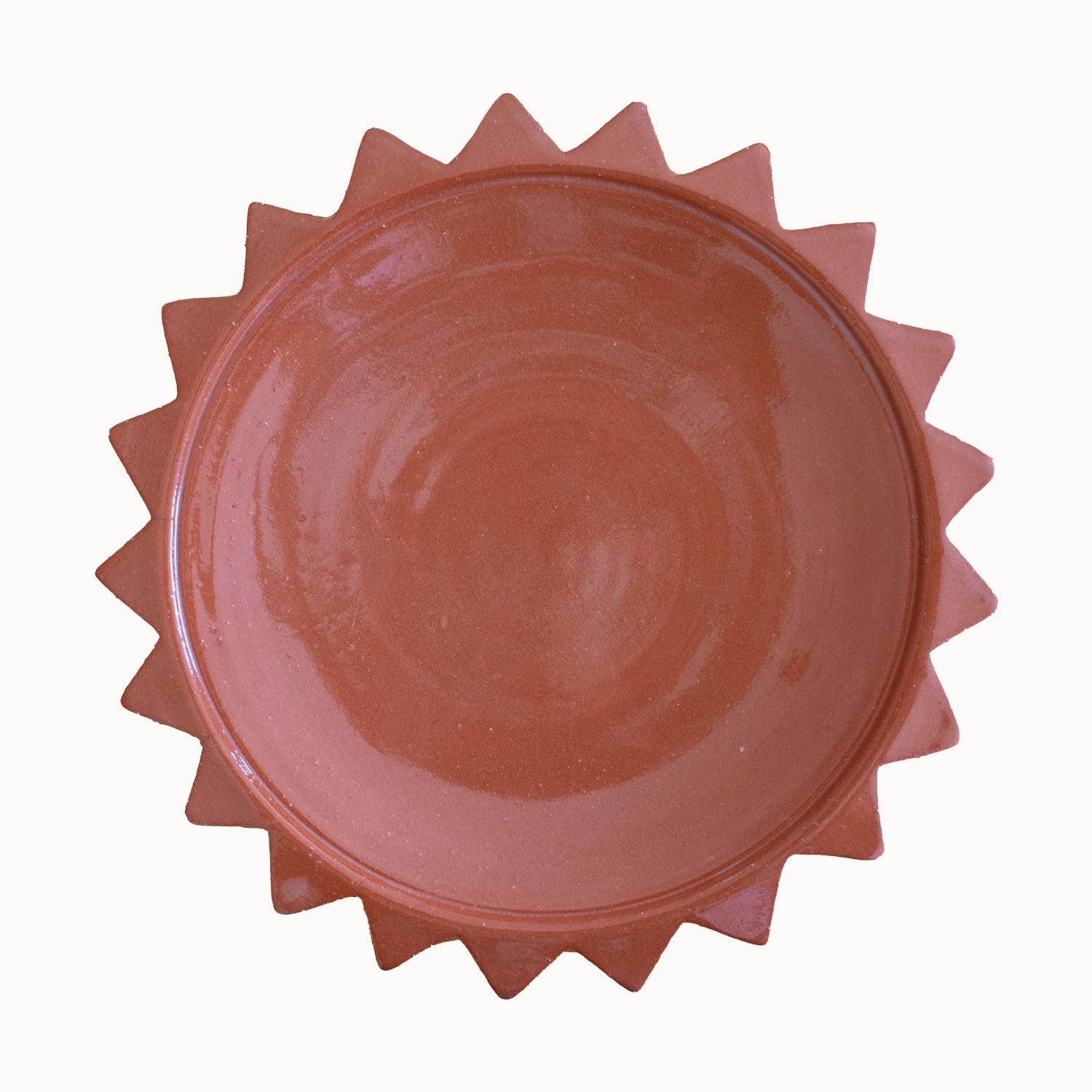 These handcrafted plates radiate warmth and joy that are sure to lighten your mood. We love using them as lunch and dinner plates, and they also double as wonderful smudge plates for your favorite bundle of intention-setting incense. Material: Ceramic terracotta stoneware Size: Small: approx. 7in diameter x 1in H Medium: approx. 8.5in diameter x 1.25in H Large: approx. 11in diameter x 1.25in H Notes: We recommend hand-washing to increase the product's longevity. We do not recommend using these in the microwave or oven. Due to the handcrafted nature of the product, slight variations in size, color and texture are to be expected, as are some slight imperfections such as fine cracks that may occur during the process of craftsmanship. We believe this authenticity adds more character to our products. Please note that due to photography and your screen settings, actual colors may vary slightly. Handcrafted by Apartment F in Morocco.