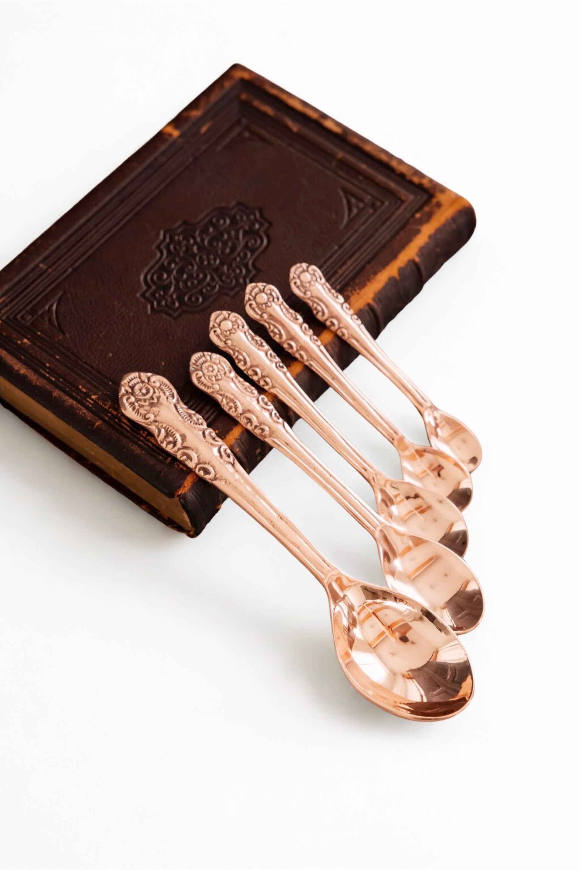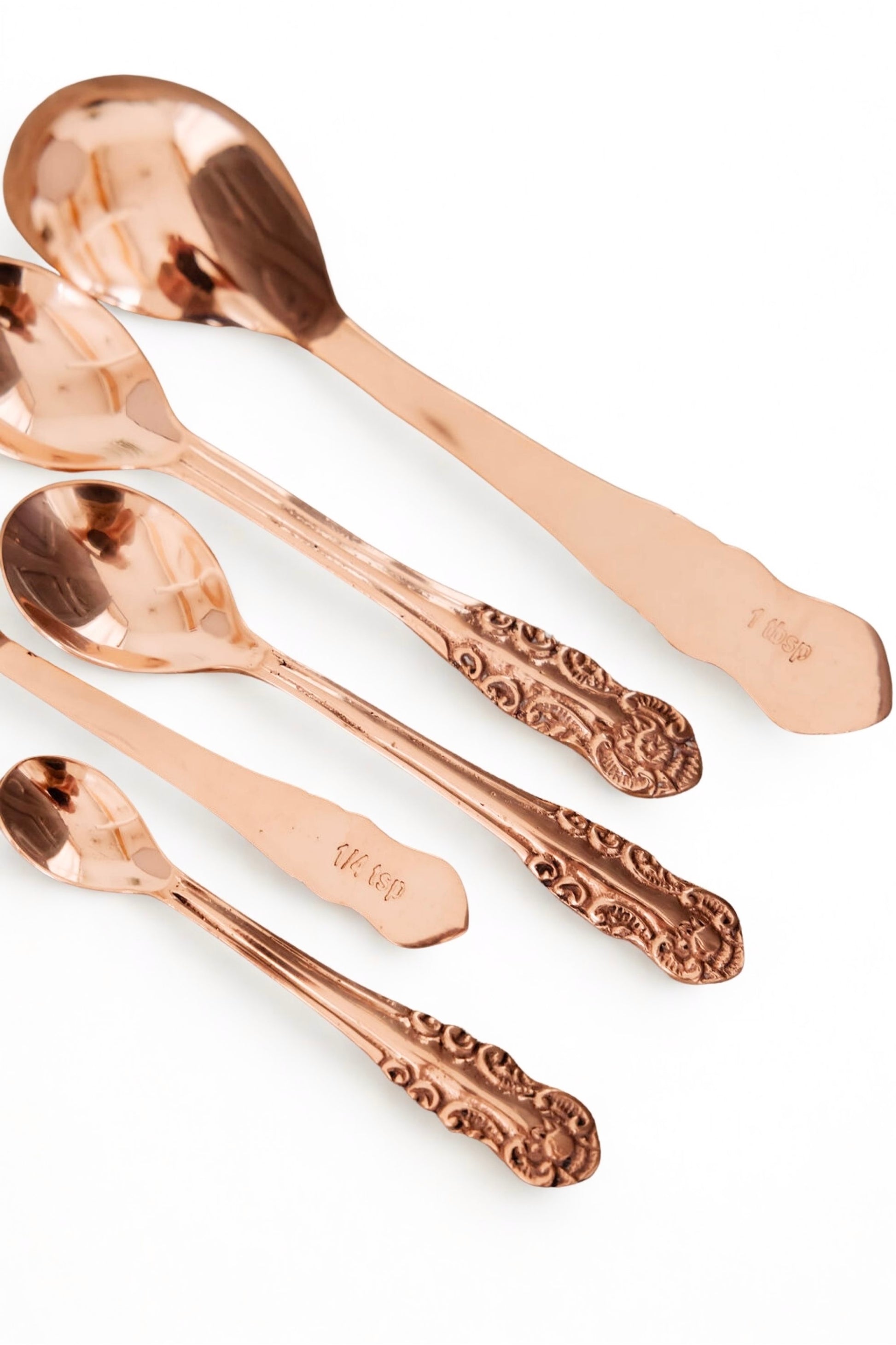 Includes: 1/8 tsp, 1/4 tsp, 1/2 tsp, 1 tsp, 1 tbsp Embossed with a custom design created by Beth Ann Infuse a dose of charm into every recipe with our Vintage Copper Measuring Spoons, a beautiful embossed set inspired by antique flatware patterns. Beth Ann created her own design for this set, and it matches the detailing on our measuring cups and tea strainer—making it part of a curated, cohesive copper kitchen set. Perfect for baking or gifting, these spoons celebrate artisan copper craftsmanship with meaningful detail. At Coppermill Kitchen, we bring together function and heritage in every copper piece, making everyday tools feel special. Display the spoons upside down in a small antique jam pot to highlight the custom handles and make them a conversation piece. Hand wash only and dry thoroughly to maintain their intricate detail and warmth.