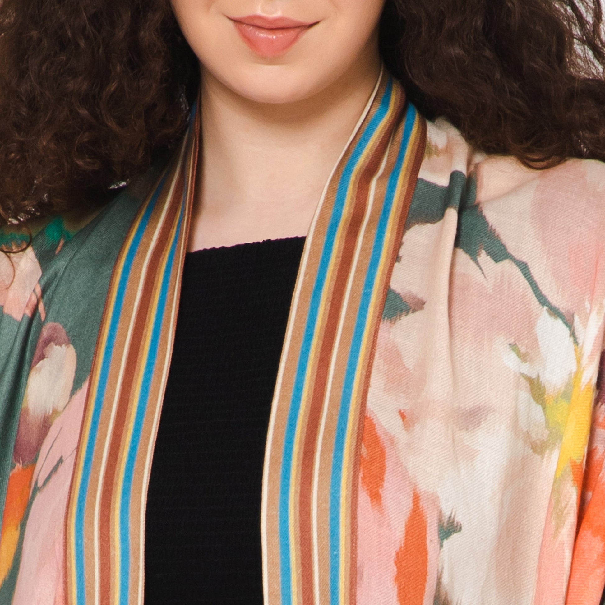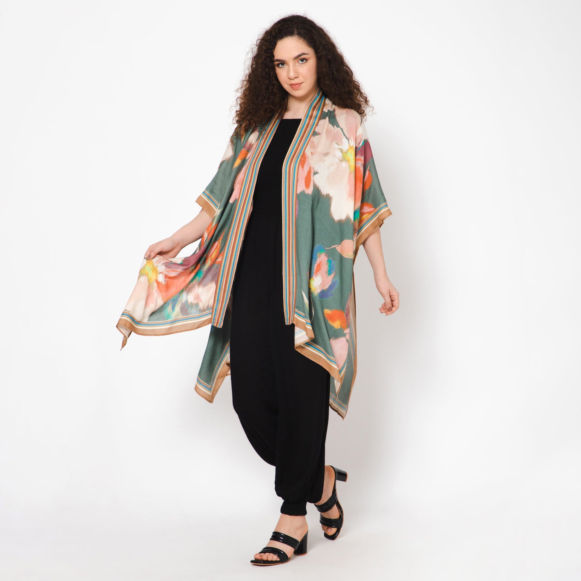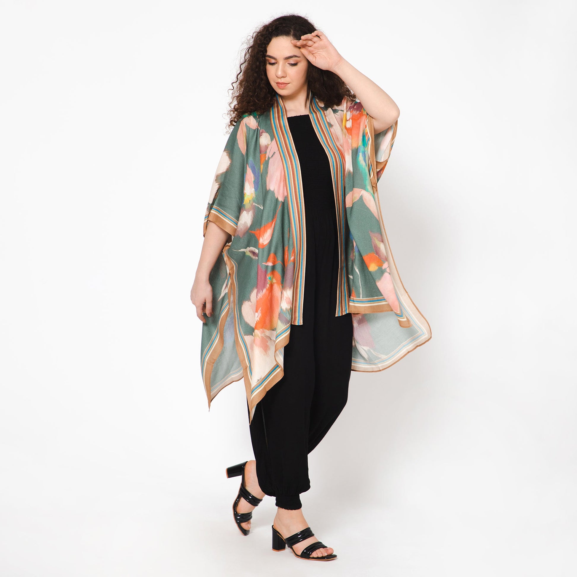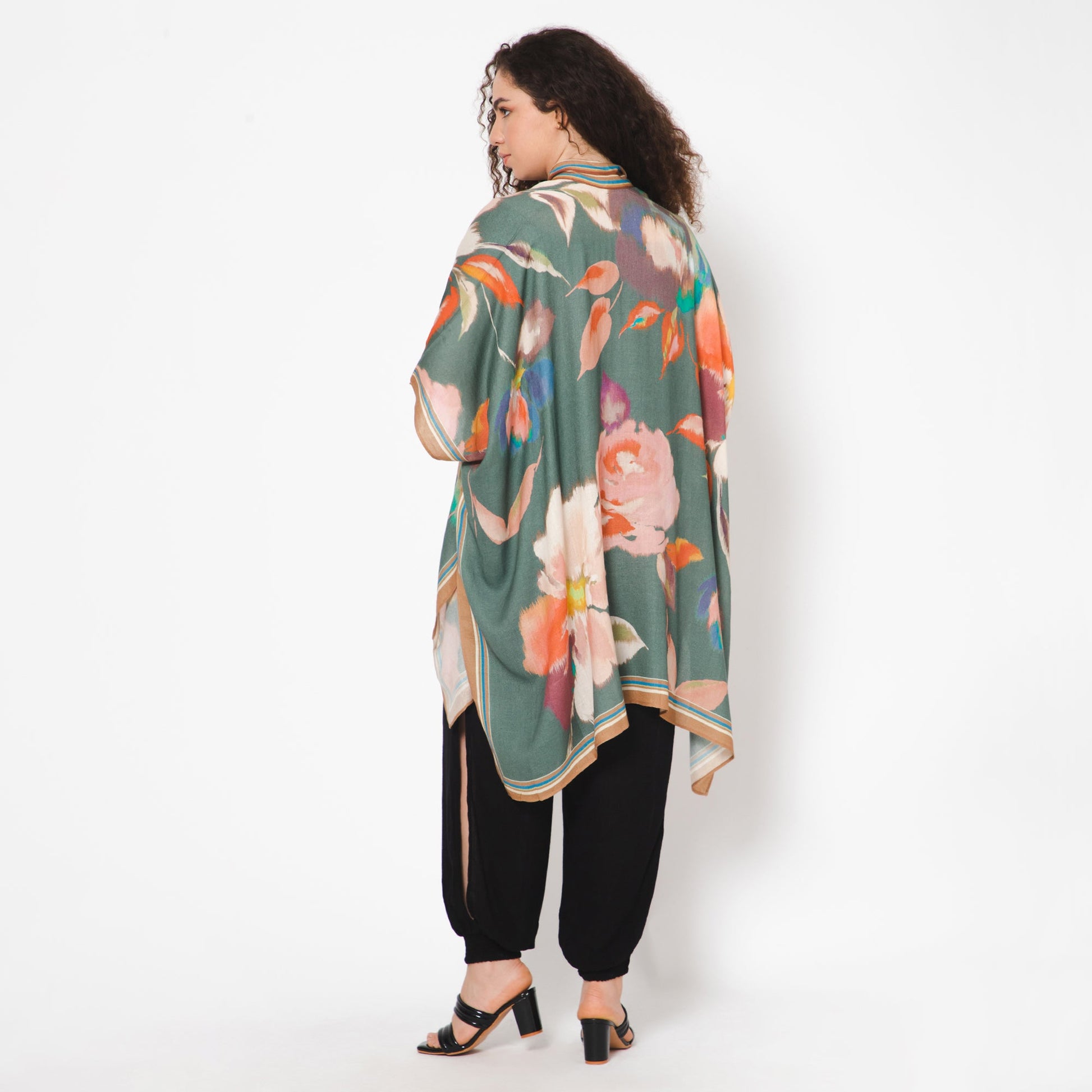 Experience lavish comfort and timeless design with the Conspicuous Floral Kimono in Sage Green. This one size fits all kimono is decorated with a watercolor floral print and contrast edging at the hems, complemented by the billowing dolman sleeves for effortless movement. Luxuriate in its elegance every day. DETAILS • Sage Green Printed Kimono • MATERIAL: 50% Modal, 40% Cotton, 10% Cashmere • SIZE: One Size • CARE: Dry clean only • Designed in Los Angeles • Made in India