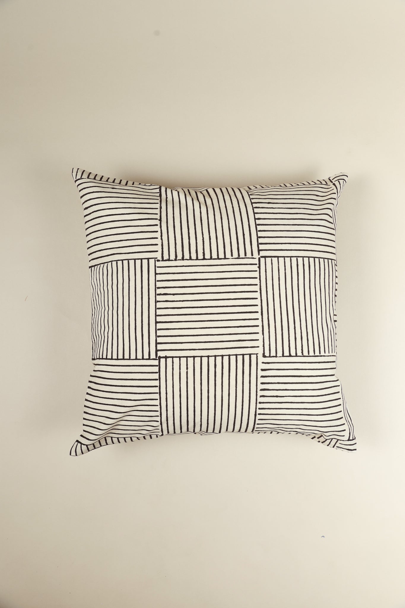 Our Desert Dunes Hand Block Print Pillow is a perfect blend of modern design meets traditional craftsmanship. Featuring a monochromatic striped pattern it is the perfect addition of a minimalist home. Fabric : 100% Cotton Dimensions : 20inch x 20inch Cover Only. Insert not included. Made in India. Each product is meticulously hand-crafted, ensuring every piece is unique. Age-old Bagru hand-block printing techniques, an art form peculiar to a small region in Rajasthan are employed by local artisans to create intricate patterns on hand carved wooden blocks, which are then transferred onto premium cotton fabric using natural colours. Finally, these fabrics are carefully sewn in-house by the skilled karigars at Ninéh, completing a beautiful process of creation.