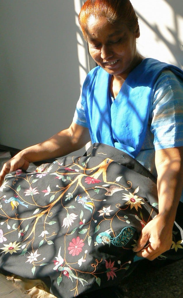 Decorating a nursery, a baby shower gift, or in a bedroom, the Dream Tree Wall Hanging is 100% cotton, beautifully hand-embroidered with the words: "Where dreams grow wild and beautiful and free" by artisans of St. Mary's Mahila Shikshan Kendra in India. This hand-embroidered wall hanging casts a dreamlike quality with birds perched, monkeys too, and a pair of elephants nearby with a majestic tree as their grand meeting spot. Imagine yourself in this world as you picture the artisans who handcrafted this beautiful work of art. Many people have hung the Dream Tree Wall Hanging in their office as a conversation starter and inspiring artwork. A Ten Thousand Villages exclusive design.