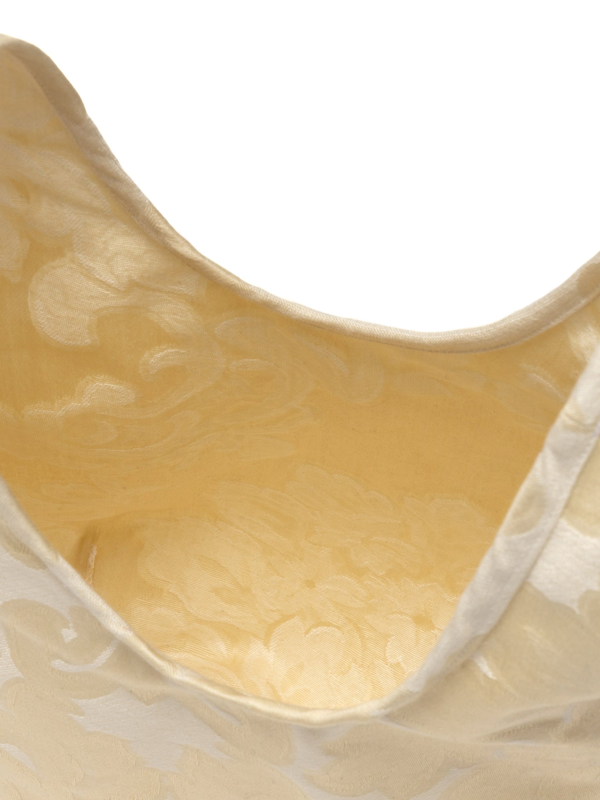 Egg shaped, bound finish, vintage jacquard wristlet tote. Feels like: structured, textured jacquard