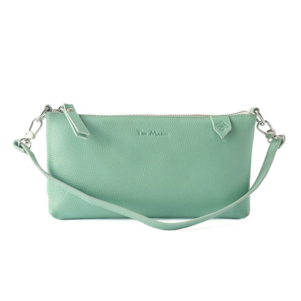 Inside, the fabric-lined interior features six built-in credit card slots for added convenience, eliminating the need for a wallet. A secure zipper closure keeps your belongings safe, while the adjustable and detachable leather strap offers flexibility in styling.