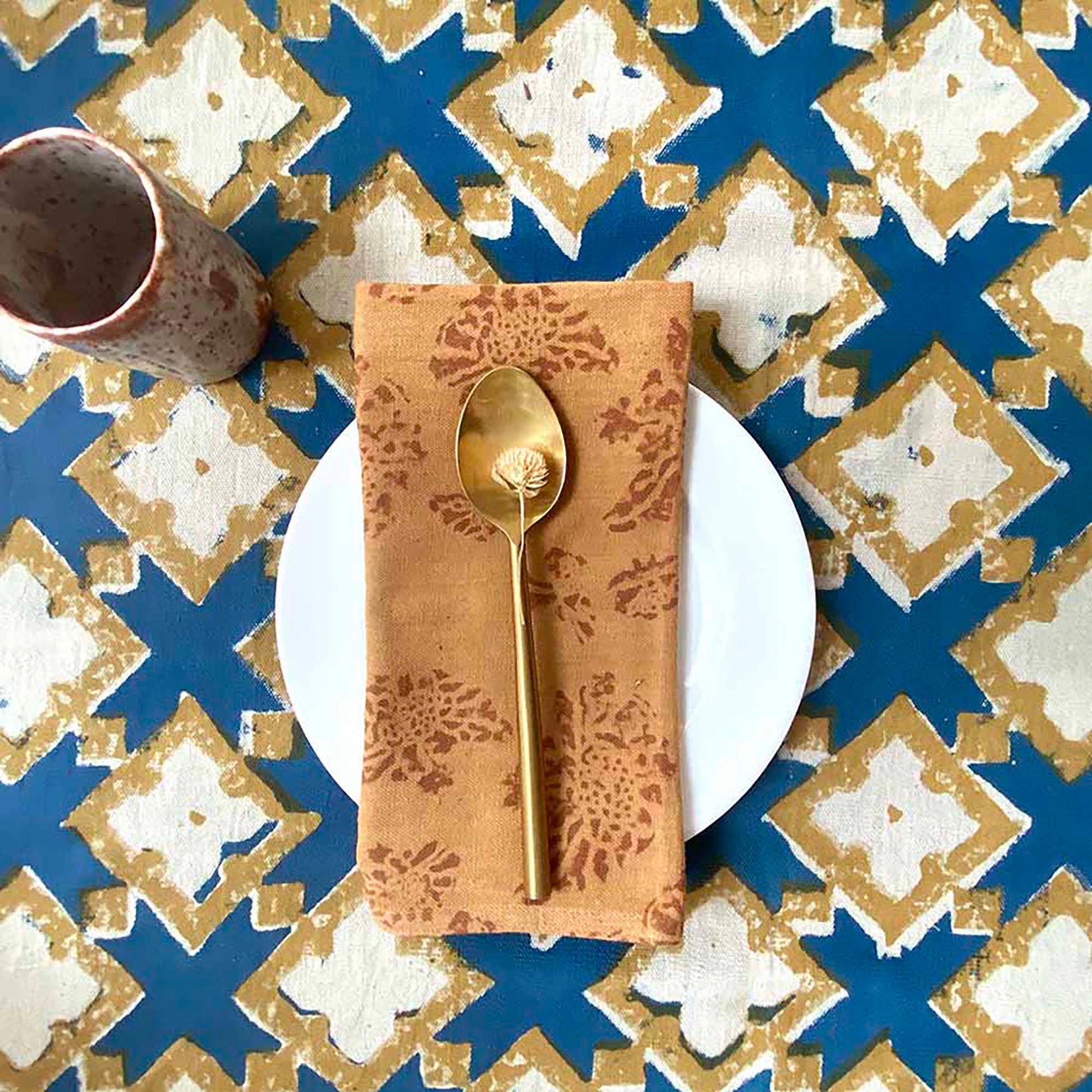 These cloth napkins are hand block printed using carved wooden blocks on handwoven organic cotton fabric. The design features the marigold flower, which symbolizes brightness, warmth, and celebration. It is printed in a rich red on a warm golden background. Hand dyed using natural plant-based colors, these napkins add a festive yet grounded tone to any table setting. Perfect for everyday use or gatherings that call for something special.