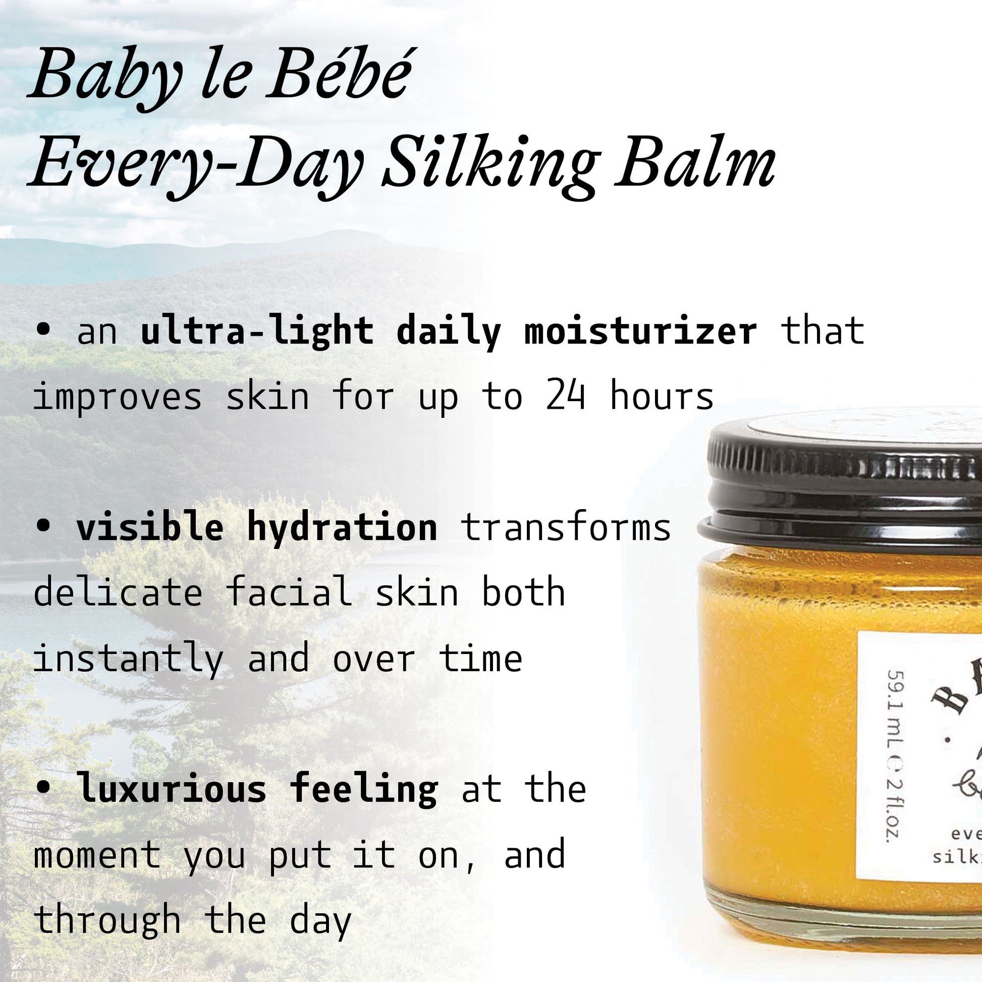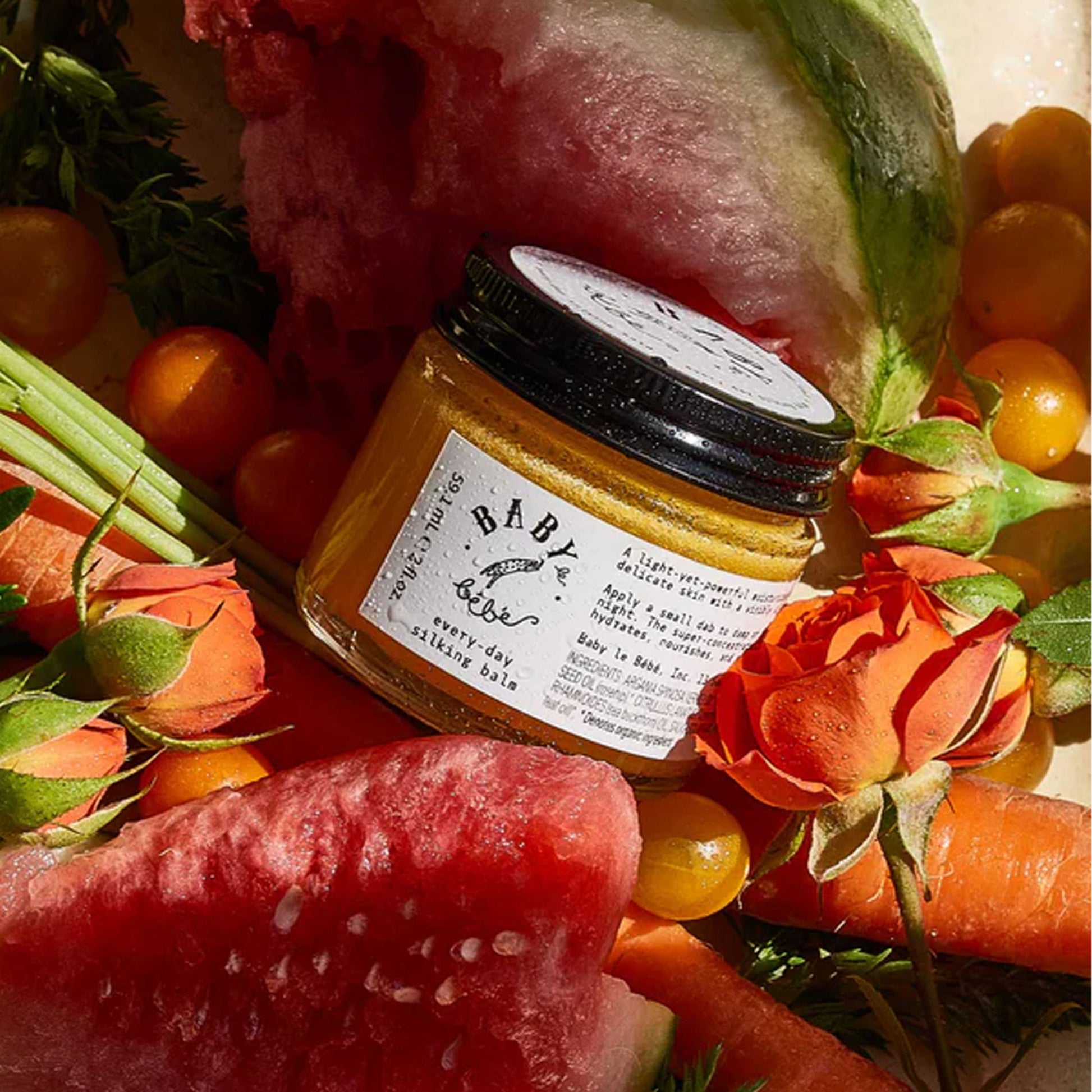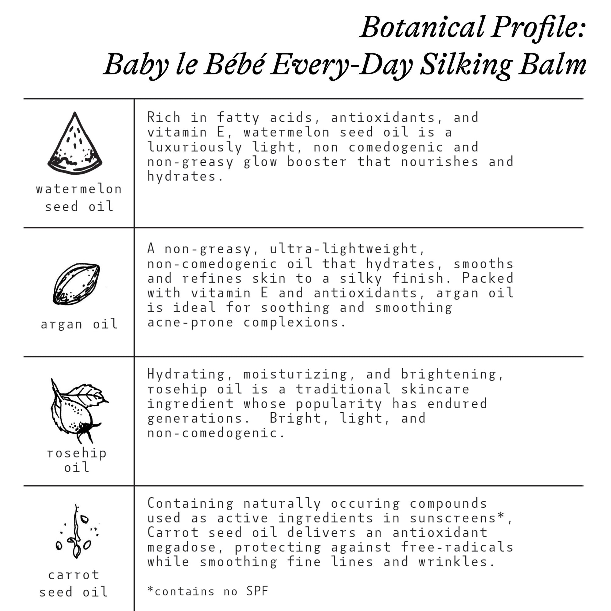 YUKA score: 100/100A featherlight daily, one-step facial balm that melts on contact and vanishes into a sun-loving silken finish. Made with a blend of nourishing botanicals including watermelon seed, carrot seed, rosehip, and sea buckthorn oils, this balm weightlessly hydrates and fully absorbs, leaving your skin soft, supple, and subtly sun-kissed. Designed for daily use, Every-Day Silking Balm is rich in antioxidants and natural essential fatty acids to support radiant skin through all seasons. Whether swiped on the face, shoulders, or cuticles, it delivers a warm, luminous sheen and a soft herbal finish, thanks to clary sage and rosemary. Nutrient Summary: Vitamin A, vitamin C, vitamin D, vitamin E, vitamin K, zinc, magnesium, calcium, iron, silica, beta carotine, polyphenols, flavonoids, tocopherols, oleic acid, linoleic acid, palmitic + stearic acids, omega acids including 3, 6, and 9. Usage and tips: • use as a makeup primer for smooth application • massage into cuticles for a quick burst of hydration • define curls and soften ends with a small amount massaged into hair • massage into neck and chest for added care for delicate skinIngredients: BUTYROSPERMUM PARKII (shea) BUTTER*, CERA ALBA (beeswax), DAUCUS CAROTA SATIVA (carrot) SEED OIL, CITRULLUS LANATUS (watermelon) SEED OIL*, ARGANIA SPINOSA (argan) KERNEL OIL*, ROSA CANINA (rosehip) FRUIT OIL*, HIPPOPHAE RHAMNOIDES (sea buckthorn) OIL*, LECITHIN*, SALVIA SCLAREA (clary sage) OIL*, ROSMARINUS OFFICINALIS (rosemary) LEAF OIL**denotes organic ingredient