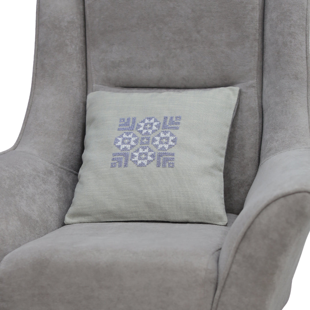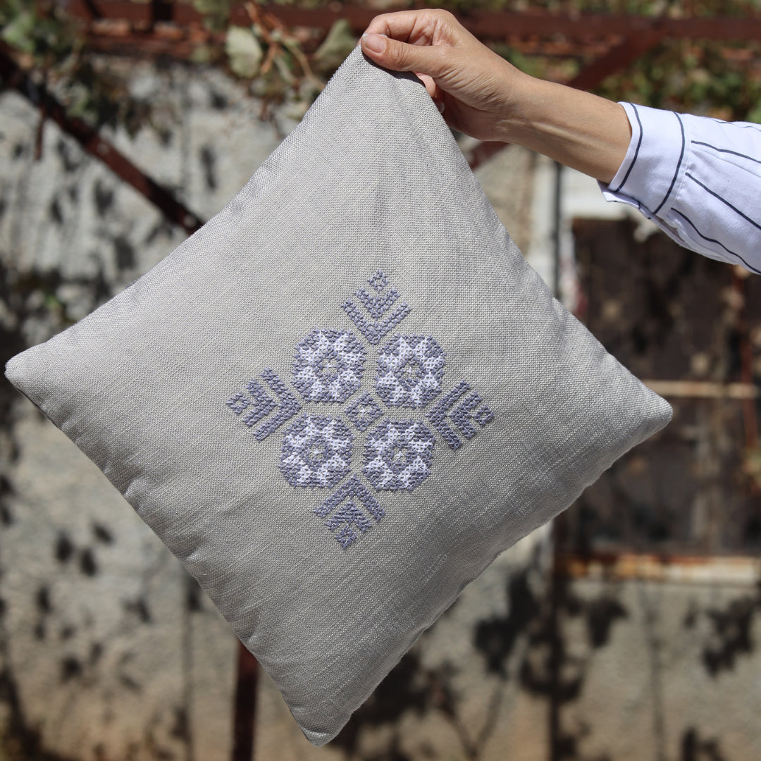 Gray Pillow Cover is a great way to add a pop of color to your living space. Embroidered with a beautiful tatreez design, you can share your Palestinian heritage with all your guests. The tatreez motif on this pillow is called "Cow Eyes" (Eyoon Al Baqar in Arabic) tatreez motif. Our products are hand-crafted by a small community of women artisans from the West Bank. When you buy from us, you can feel good knowing that a real pair of hands was behind every stitch of fabric. Shop with us to support the real women behind the products. Product Details: Pillow Cover measures 18” x 18” Machine wash on delicate cycle Locally sourced cotton blend fabric Pillow insert not included
