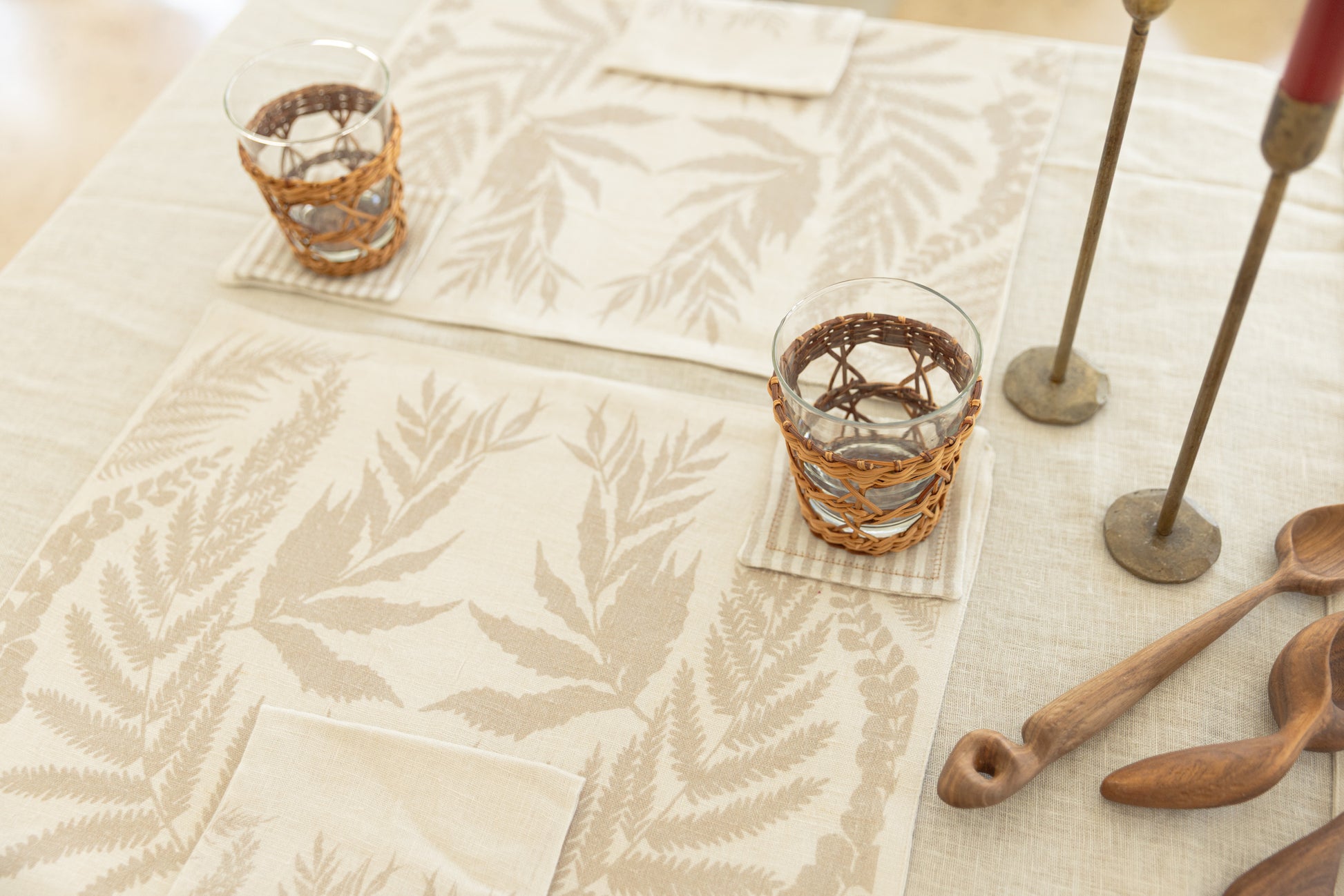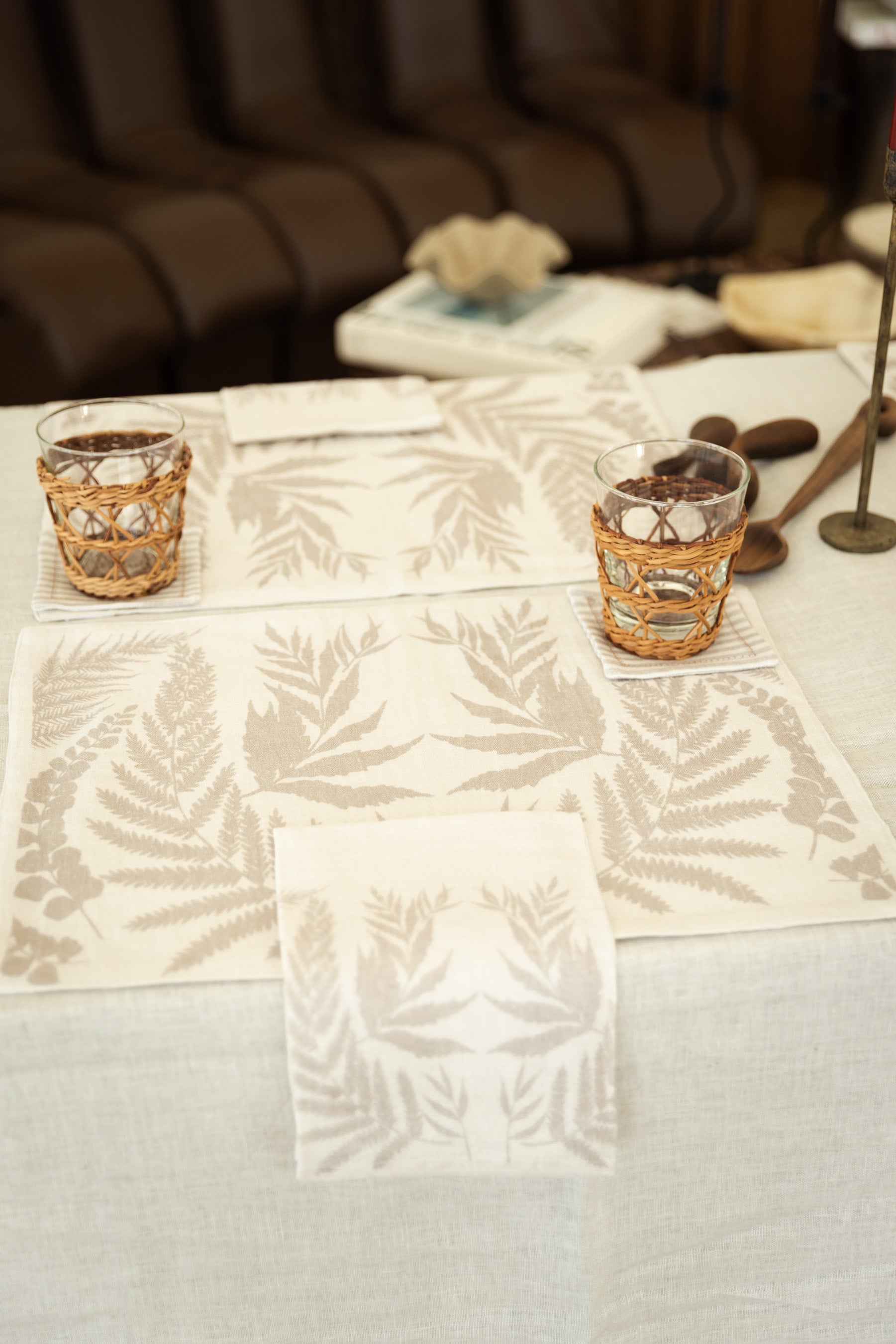 Elevate your family's dining experience with the natural beauty of our Forest Ferns Placemats. Imagine the soft, natural feel of 100% linen under your fingertips as you set the table for a cozy weeknight dinner or a festive gathering. These unique, handmade placemats bring the serene charm of a forest garden right into your home, transforming everyday meals into moments of refined comfort. The delicate fern motif, rendered in a calming earthy tone, adds a touch of understated elegance that complements any décor. Say goodbye to drab tabletops and hello to a dining space that feels both inviting and sophisticated. These placemats are designed to protect your table from spills and scratches, offering a practical yet beautiful solution for busy families who appreciate quality and style.
