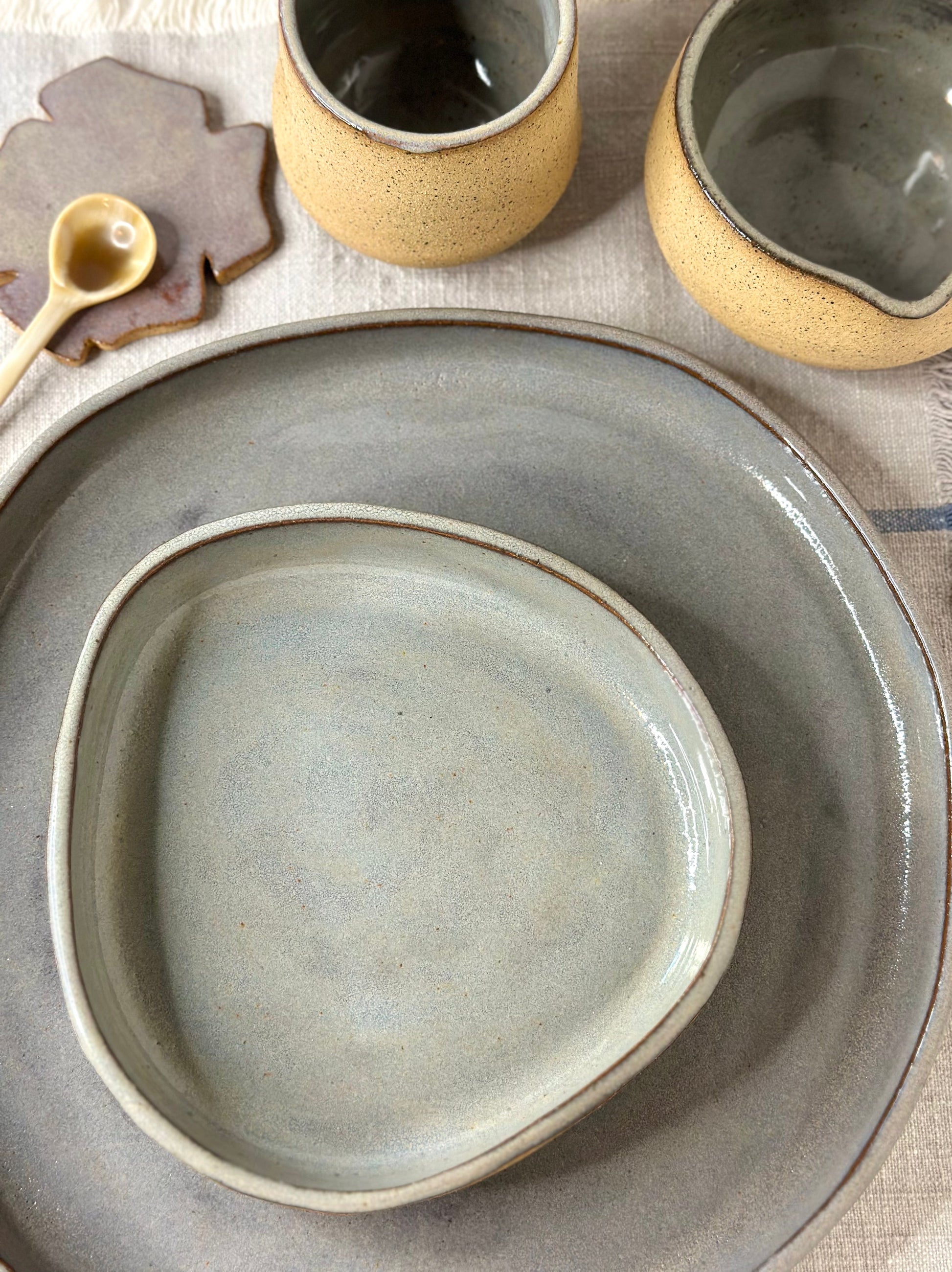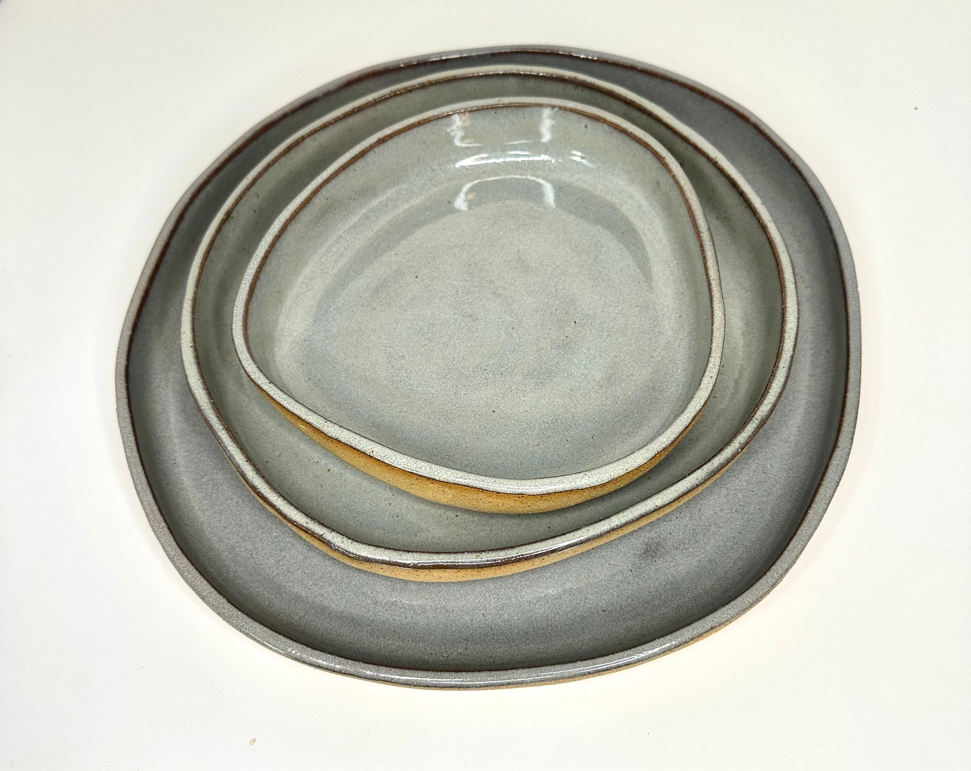 Set of three handcrafted plates, one of each size. Large (11" diameter), medium (8.5" diameter), and small (6 "diameter), all 1" tall. Due to the artisanal nature of these pieces, slight variations in height and size are to be expected, a charm of handmade craftsmanship. These versatile plates/bowls are perfect for various uses. Mix and match with the medium and small FRECKLES collection of plates and cups to create your unique combinations. CLAY: Light brown with black speckles. GLAZE: Glossy Mushroom color. Handcrafted from USA-sourced clay. Unique, mold-free, small-batch production. Glazed finish (not microwave-safe). We recommend handwashing to prevent surface decay and scratches. Please note that slight variations in size may occur due to the clay's natural behavior during the drying and firing process.