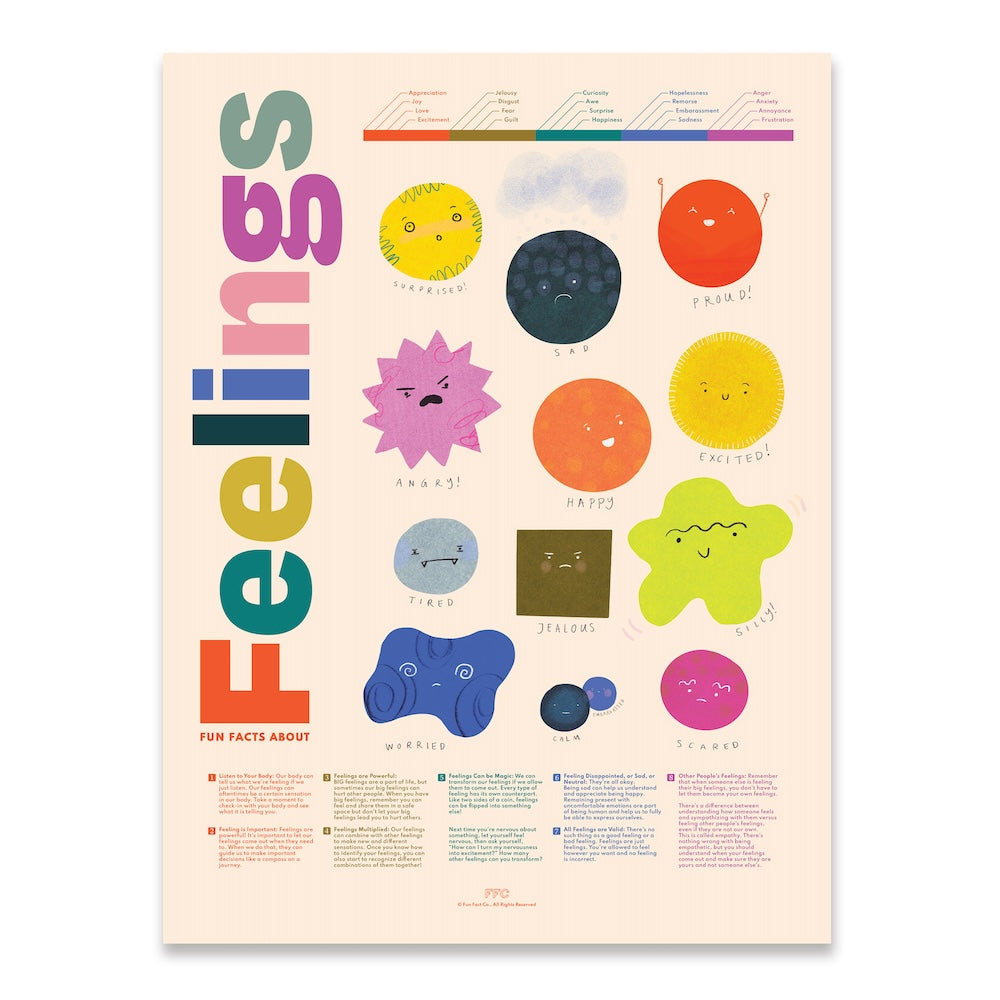 The Fun Facts About Feelings Print is a silly-serious infographic about emotions. Ideal for early childhood educators, parents, and therapists, it serves as a dynamic visual aid for discussions about feelings with younglings. Each emotion is captured through cute, expressive faces, making it a vibrant and educational addition to any space. Whether it's adorning the walls of a classroom, brightening up an office, or adding a touch of insight to the bedroom of a discerning emo kid, this print is a perfect blend of fun and functionality.