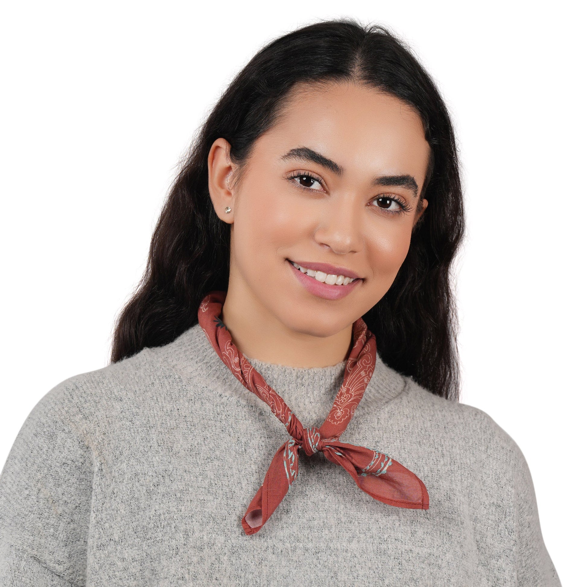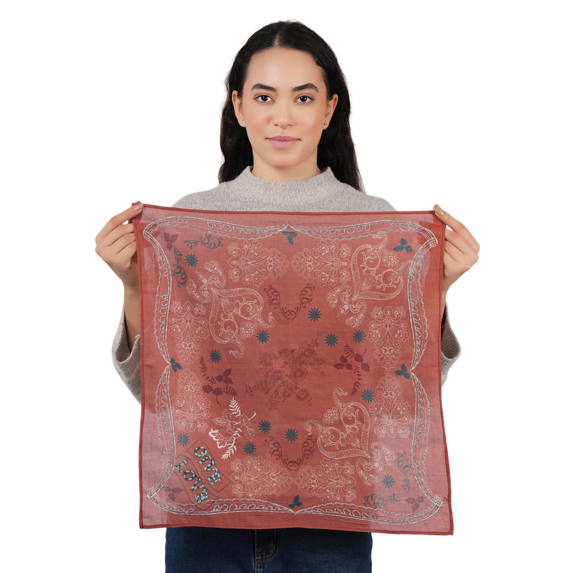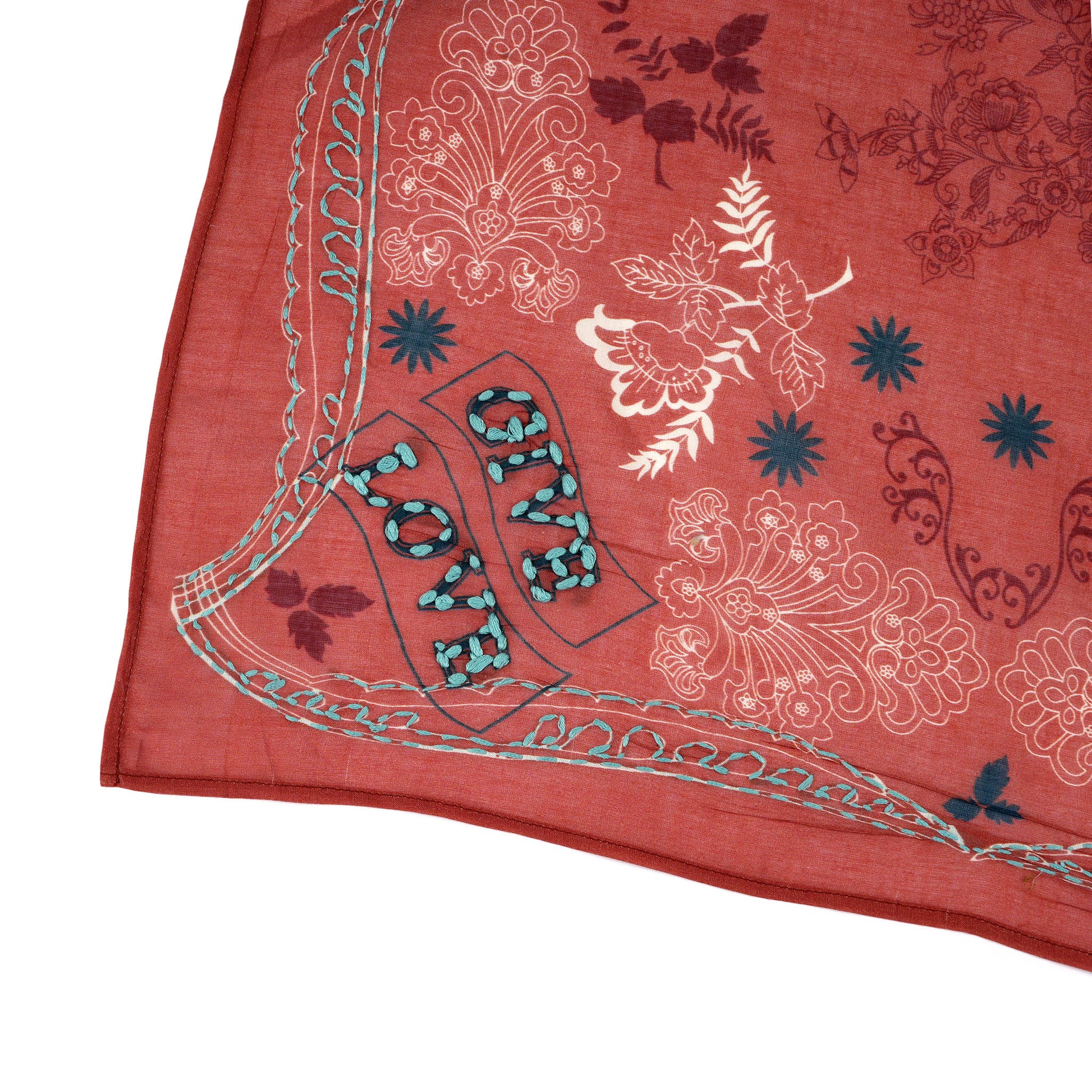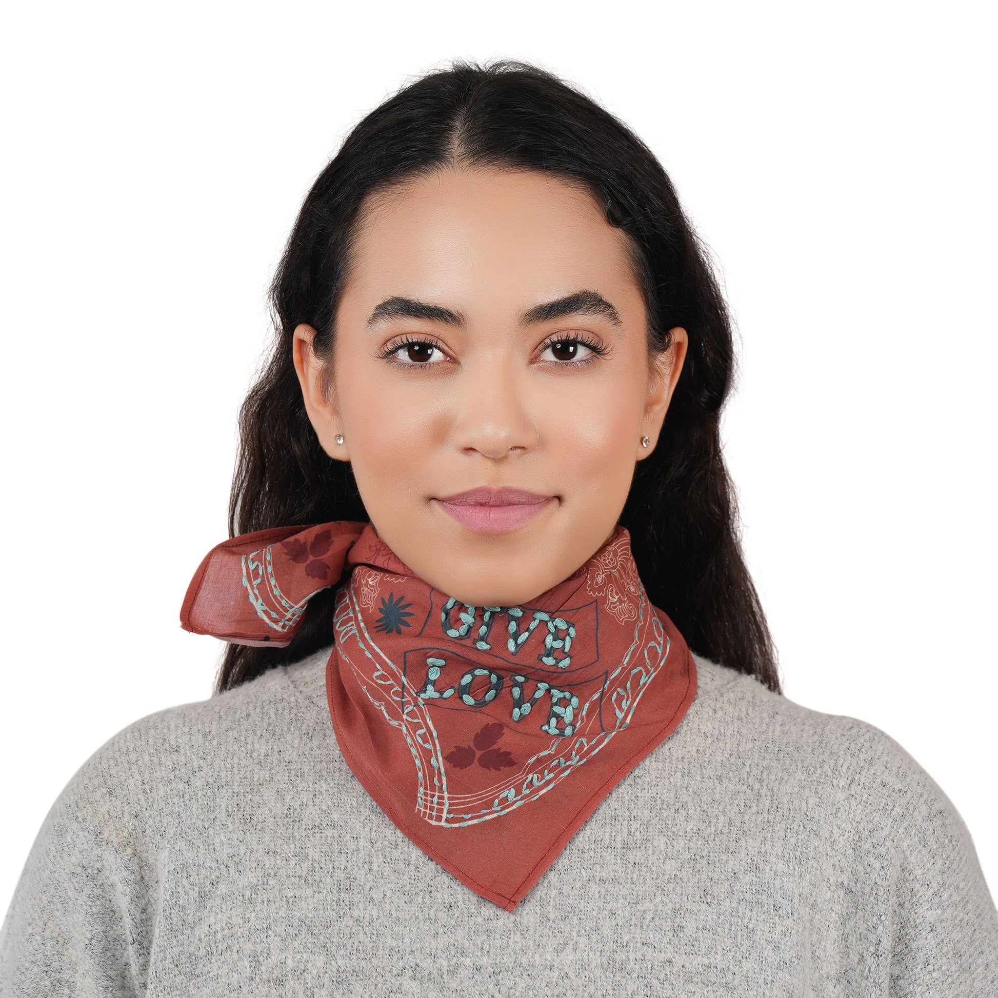 Spread positivity and style with the Give Love Paisley Embroidered Bandana in Terracotta. This lightweight accessory features a unique design centered around intricate, swirling paisley and lace-like motifs in a delicate white outline, set against a earthy terracotta background. The inspiring message "GIVE LOVE" is artfully integrated, adding a meaningful touch, complemented by pops of deep blue and maroon accents. The printed motifs are subtly enhanced with hand-guided machine embroidery, providing texture and a gentle charm. A scalloped lace-style border frames the design with polished finesse, elevating the accessory’s refined appeal. Incredibly versatile, this bandana can be effortlessly styled as a classic neck scarf, a fashionable headscarf, or tied to a handbag for a chic accessory accent. Perfect for adding a touch of warmth, color, and personality to both casual and polished outfits, this scarf is a timeless piece that blends everyday practicality with effortless, artistic elegance. Key Features: Lightweight, comfortable fabric for versatile wear Intricate paisley and lace motifs with hand-guided machine embroidery Inspirational “GIVE LOVE” detail Scalloped lace-style border for refined elegance Multiple styling options: neck scarf, headscarf, or handbag accent DETAILS • Terracotta Embroidered Bandana • MATERIAL: 100% Cotton • SIZE: 20" X 20" • CARE: Hand wash cold, do not bleach, dry flat, low iron or dry clean • Designed in Los Angeles • Made in India