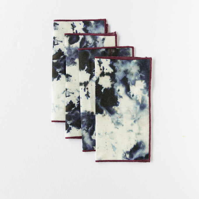 These cocktail napkins add a touch of elegance to any gathering. Choose from a grey, plum, or chartreuse trim. The marble pattern is cool + sophisticated, making them the perfect accessory for your next cocktail party. Designed to be as versatile as they are beautiful. Lay them flat for the perfect aperitivo napkin or fold as a lunch napkin. Sold as a set of 4 100% Linen 8x8 inches Machine wash cold, machine wash gentle cycle, or lay flat to dry
