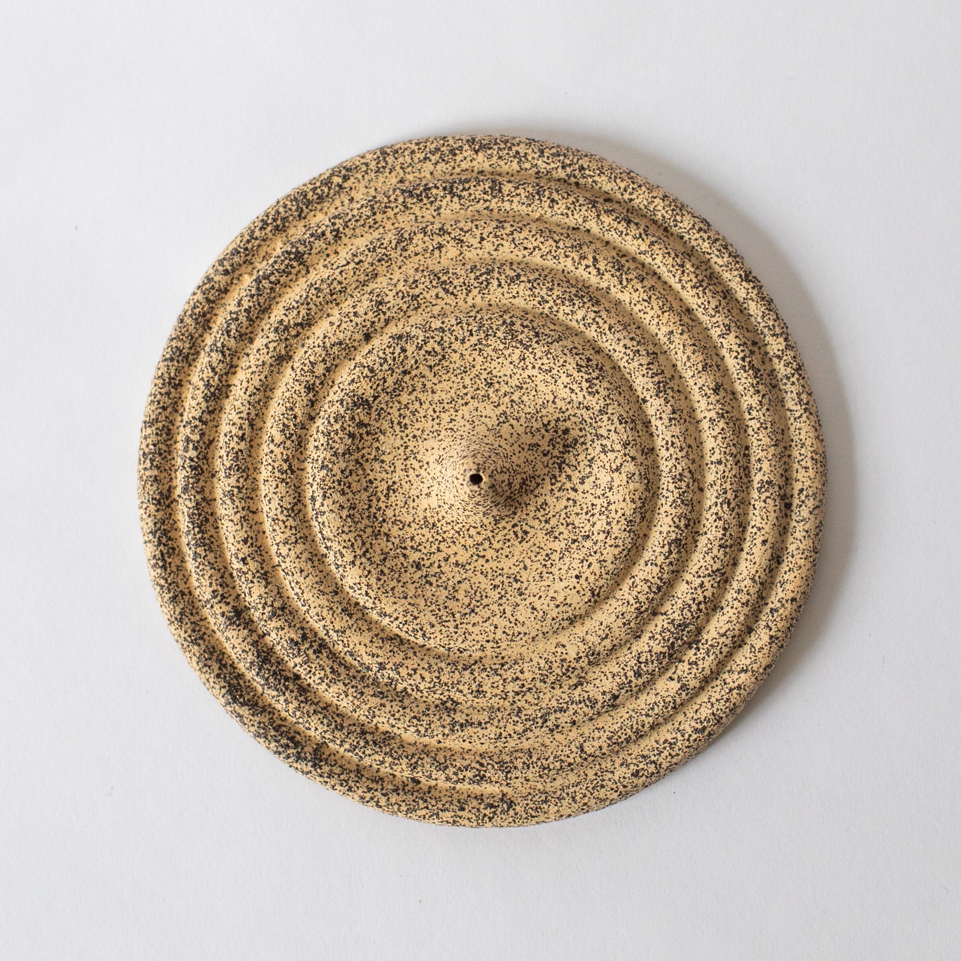 Handmade ceramic incense holder made with white ceramic clay and a combination of different sands, giving it a freckled appearance and rough texture.