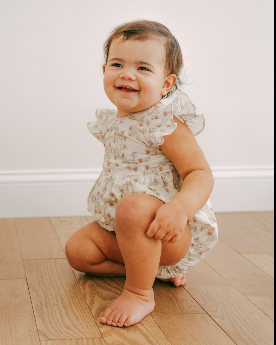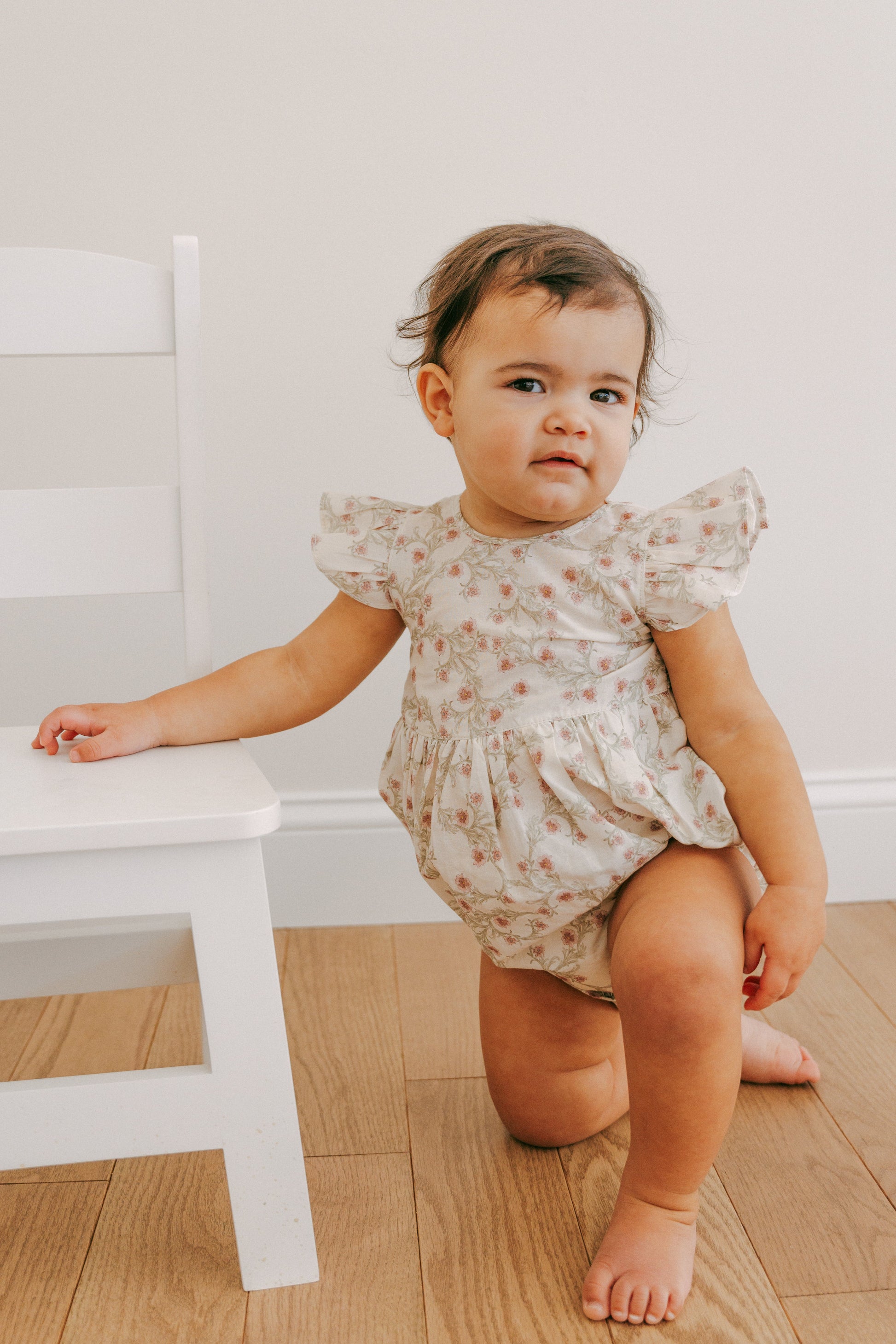 The Josie Bubble in a Lavender Field print is a sweet and airy romper designed for all-day comfort and charm. Delicate flutter sleeves frame the shoulders, while the open back is tied with a generous bow for a touch of whimsy. An elasticized waist and leg openings ensure a comfortable fit, and hidden snaps at the bottom make diaper changes quick and easy. Made from breathable cotton in a muted lavender floral print, this bubble is perfect for warm-weather outings, birthdays, or simply enjoying sunny days in style. Machine-wash cold on gentle cycle and hang or tumble dry low. Warm iron if needed; do not bleach, dry-clean. Discover more dreamy prints in the Josie Bubble Collection, including Golden Blossom, Soft Petals, Blue Meadow, Pastel Confetti, and Garden Blossom.