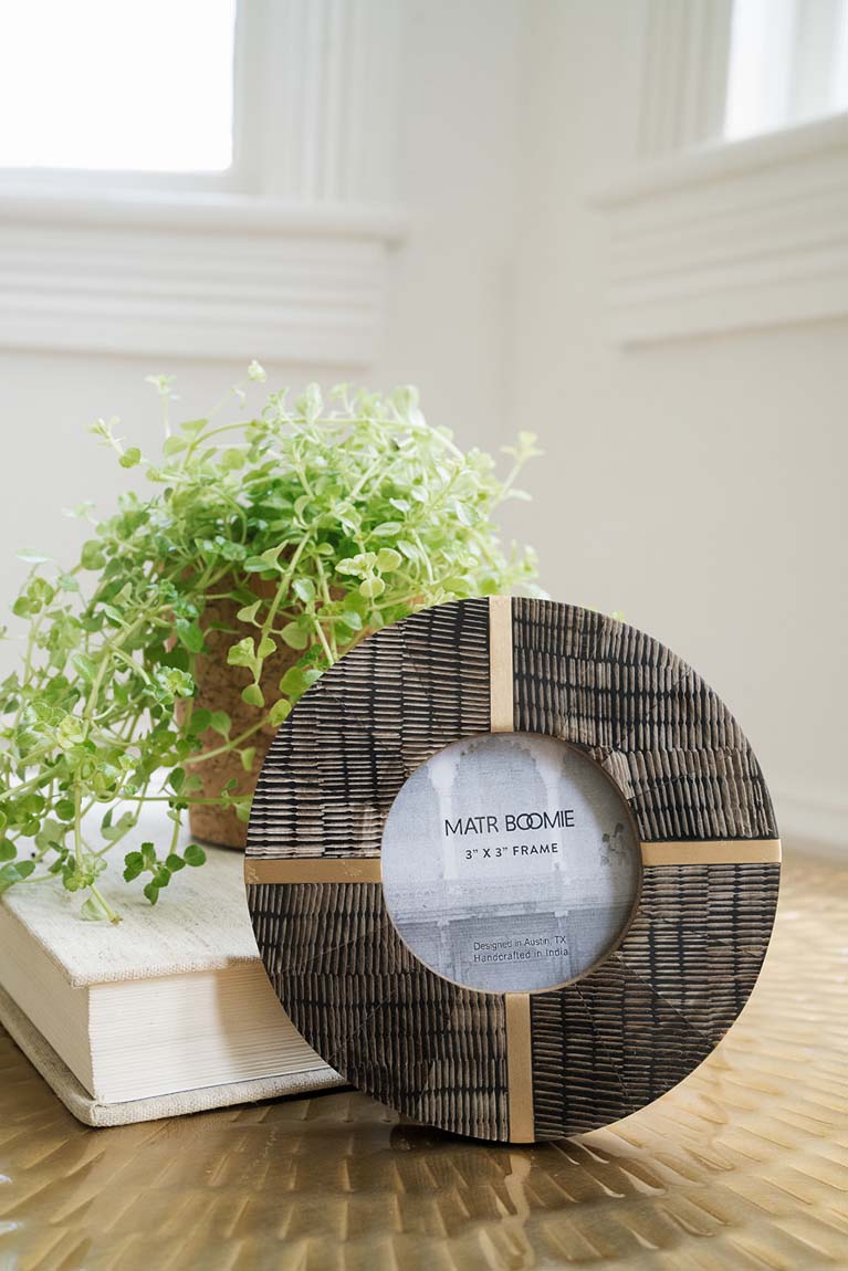 Reminiscent of the architecture of traditional houseboats of Kerala, this picture frame features a carved horn design in beautiful dark colorways. Variation is expected in each piece, making it truly one-of-a-kind. Handcrafted by master artisans in India, this frame accommodates a 2.5x2.5" photo or print, easily accessed with metal swivel tabs and a removable back. Display together with frames and boxes from our Kerala and Andhera collections for a coordinated tablescape that highlights the unique beauty of this natural horn material.