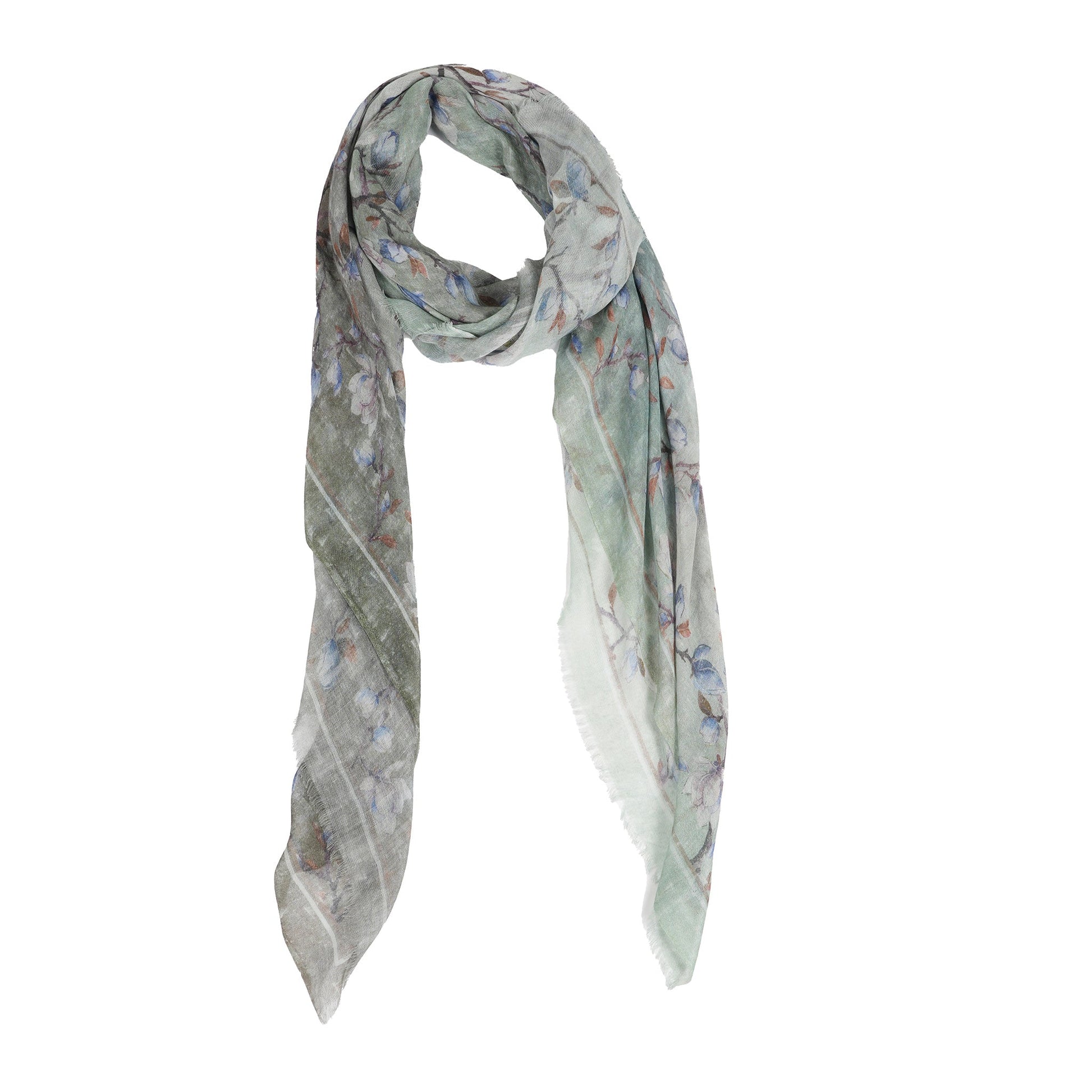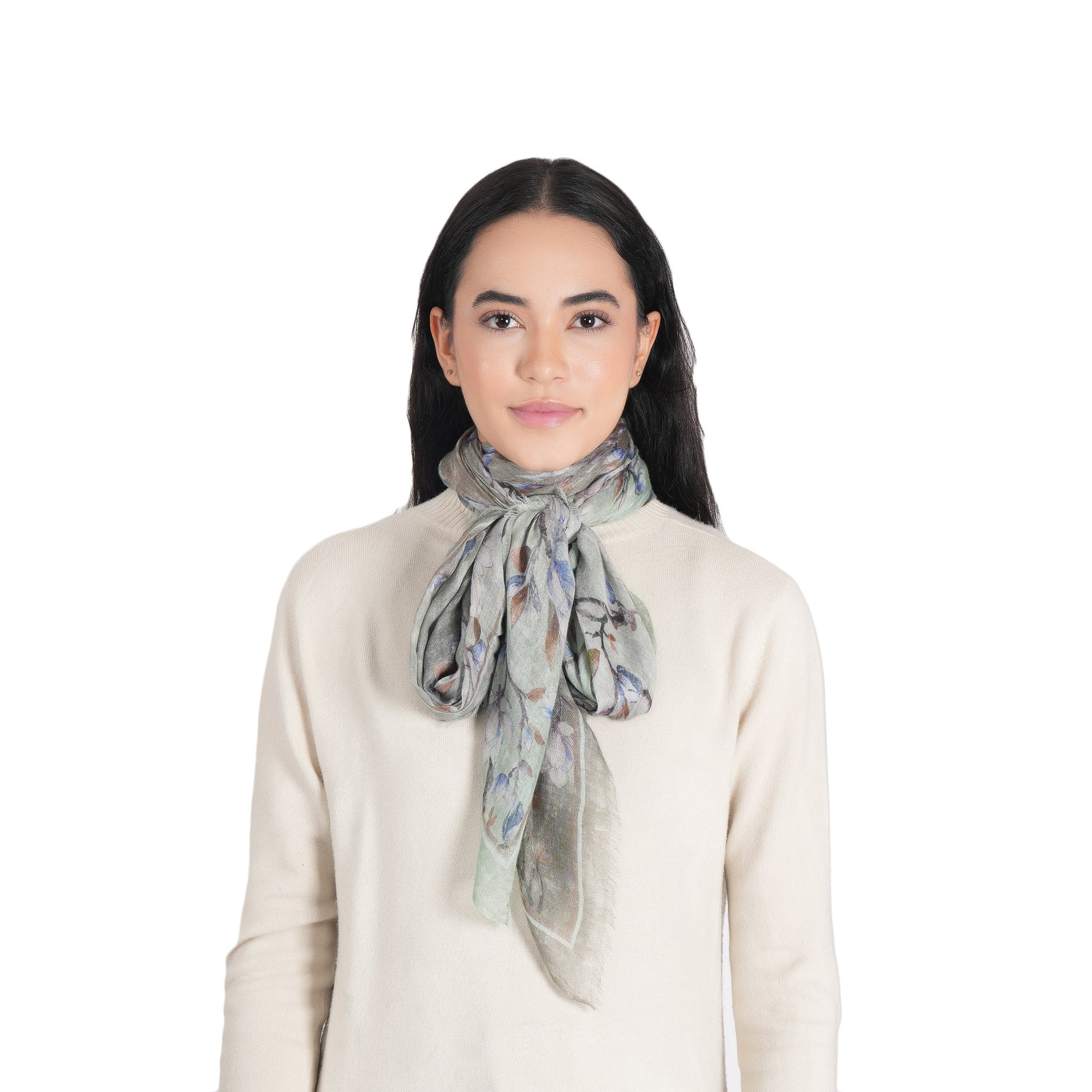 Embrace timeless elegance with the Magnolia Blossom Gradient Wrap – Mint Grey, a piece that captures the tranquil beauty of spring in bloom. Adorned with soft violet and white magnolia blossoms delicately intertwined with slender branches, the design rests on a soothing mint grey gradient, evoking a sense of calm sophistication. Crafted from soft, lightweight fabric, this wrap drapes effortlessly, offering year-round versatility. Its generous shape allows for multiple styling options—wear it as a chic wrap, layered over casual outfits, or draped elegantly to enhance evening attire. Subtle fringed edges add a touch of casual sophistication, making it a perfect accessory for both everyday wear and special occasions. With its harmonious blend of artistry, color, and comfort, the Magnolia Blossom Gradient Wrap transforms any outfit into a refined statement of style. Lightweight yet luxuriously soft, it is an essential addition for those who appreciate detailed design, versatile elegance, and nature-inspired beauty. Key Features: Soft, lightweight fabric for all-day comfort Elegant magnolia floral design on a mint grey base Subtle fringed edges for a refined finish Versatile square shape for multiple styling options DETAILS • Mint Grey Square scarf • MATERIAL: 90% Modal 10% Cashmere • SIZE: 52" X 60" • CARE: Hand wash cold, do not bleach, dry flat, low iron or dry clean • Designed in Los Angeles • Made in India