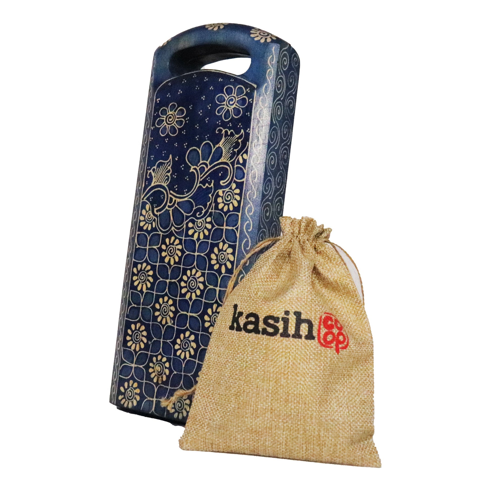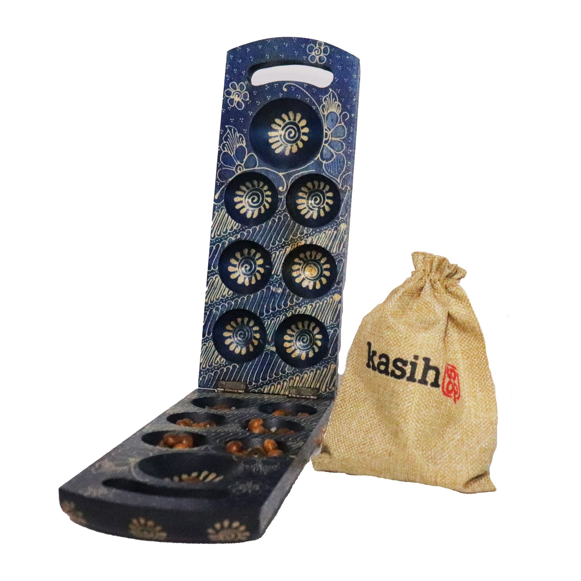 Handmade Albacia wood mancala, dakon, congklak made by our artisans in Indonesia. Sold with wooden beads in our branded Kasih Co-op pouch jute bag along with an instruction on how to play our mancala board game set. One congklak mancala wooden board game The mancala board has hinges and it is stored folded in half and expands when played All natural Albacia wood Handmade by artisans in Jepara, Central Java, Indonesia Handmade shelving shelves display piece Sold as wooden board game and include wood beads in a jute bag and instruction to play Size: the mancala went fully laid out is 25” and 4.75”. When folded it is 12.75” and 4.75”. Each of the hole is less than 2” and the store hole at each end is 2.25”. The board comes with ~100 small wood beads to play and each bead is about 0.3”. Our mancala board is handcrafted from albacia wood; which our artisans then hand-drawn using canting tool with hot wax; before submerging the whole wood to dye and color the pattern. Congklak is a two player game where opponents compete to get the most shells into their storehouses. The game is similar to mancala. Take a look at the link here for instructions for how to play congklak or dakon or mancala board from Indonesia. How to play mancala, see our blog post https://www.kasihcoop.com/blogs/news/how-to-play-dakon-congklak-indonesian-mancala-board-game