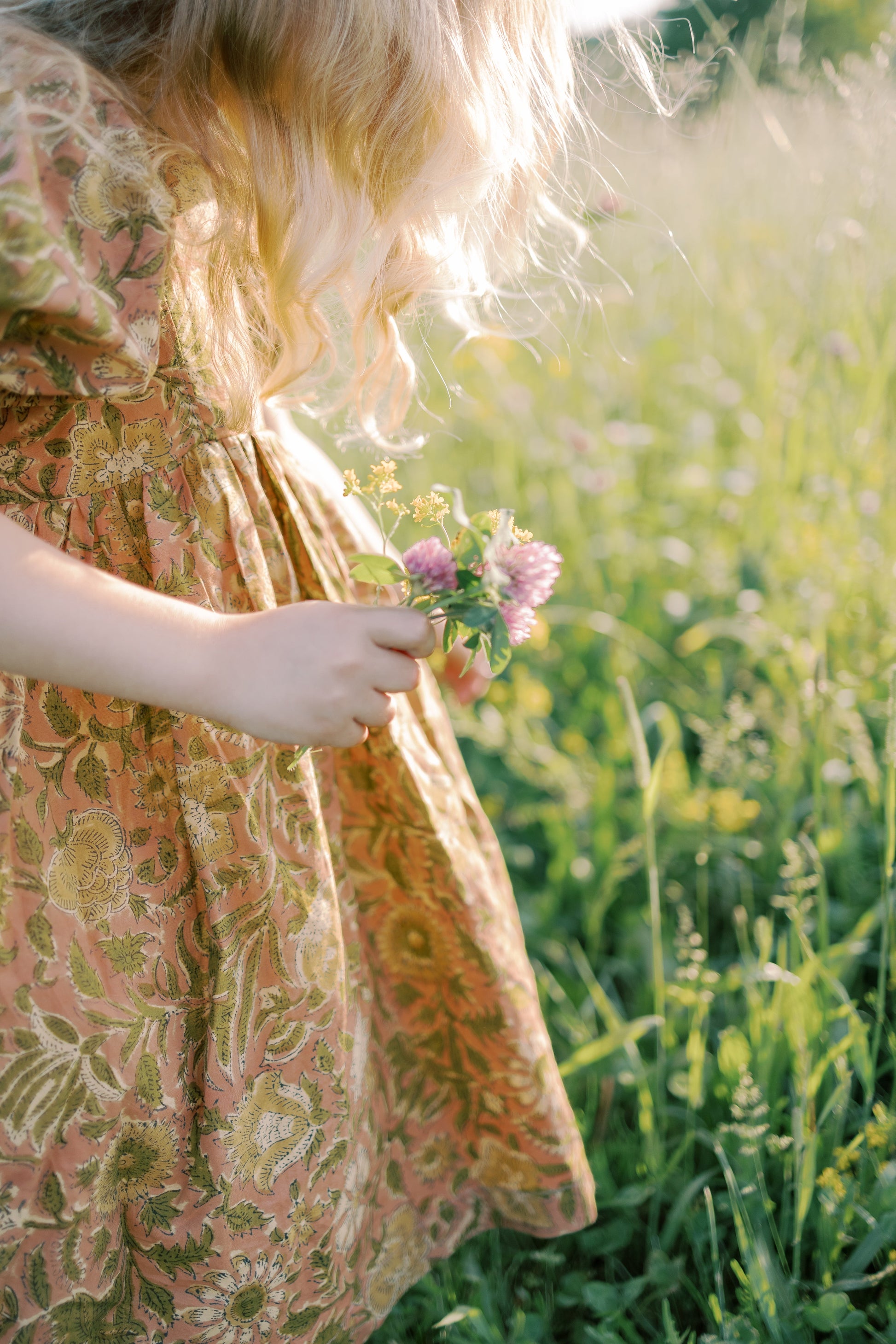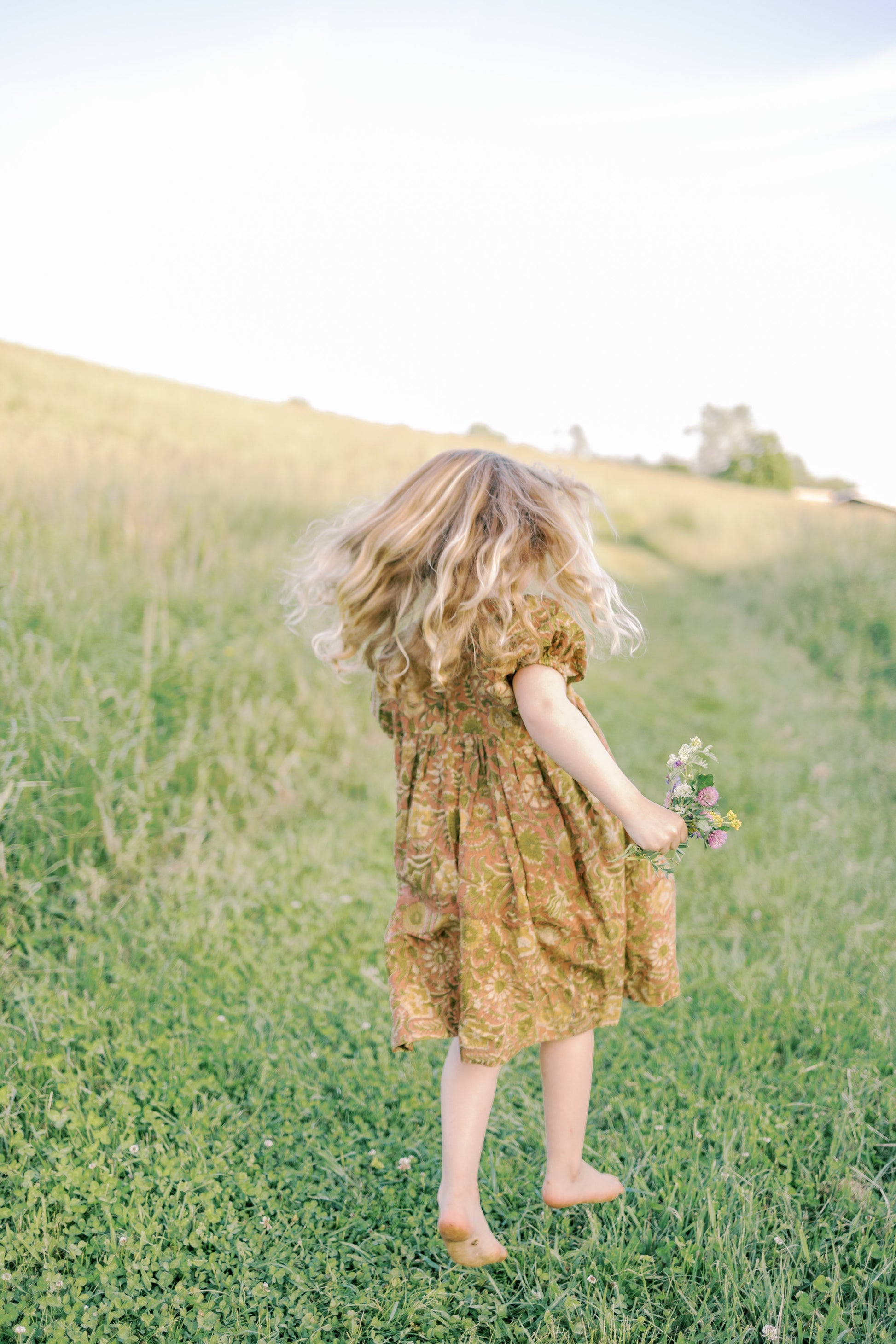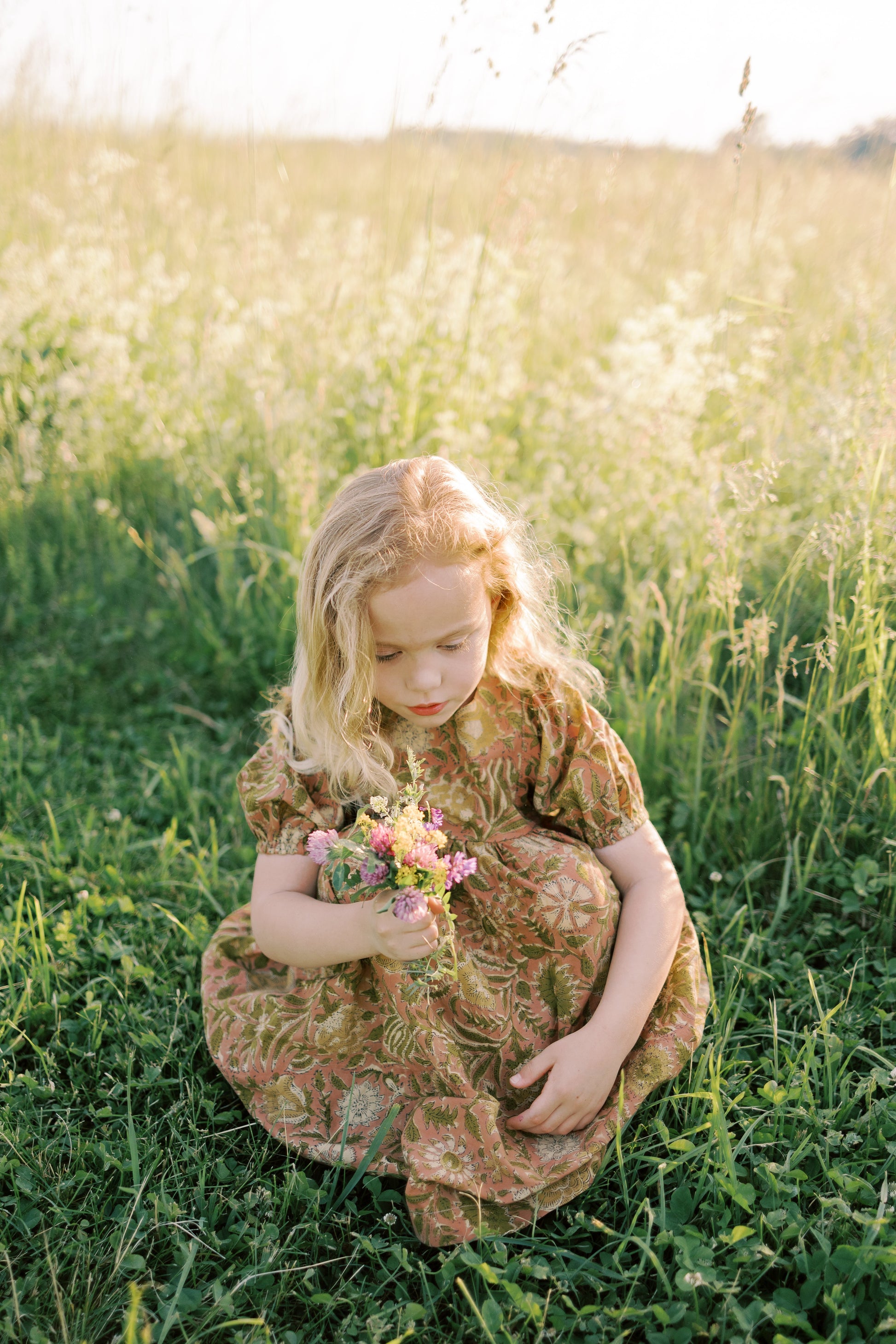 The Mio dress has a relaxed fit with a gently gathered waistline, creating a timeless silhouette that's both comfortable and stylish. With its short puff sleeves and elegant knee-length hem, this dress is ideal for twirling in the fields or attending family gatherings. The natural hues make it versatile for any season, pairing beautifully with sandals in summer or cozy tights and boots in fall. Crafted from 100% Organic Cotton