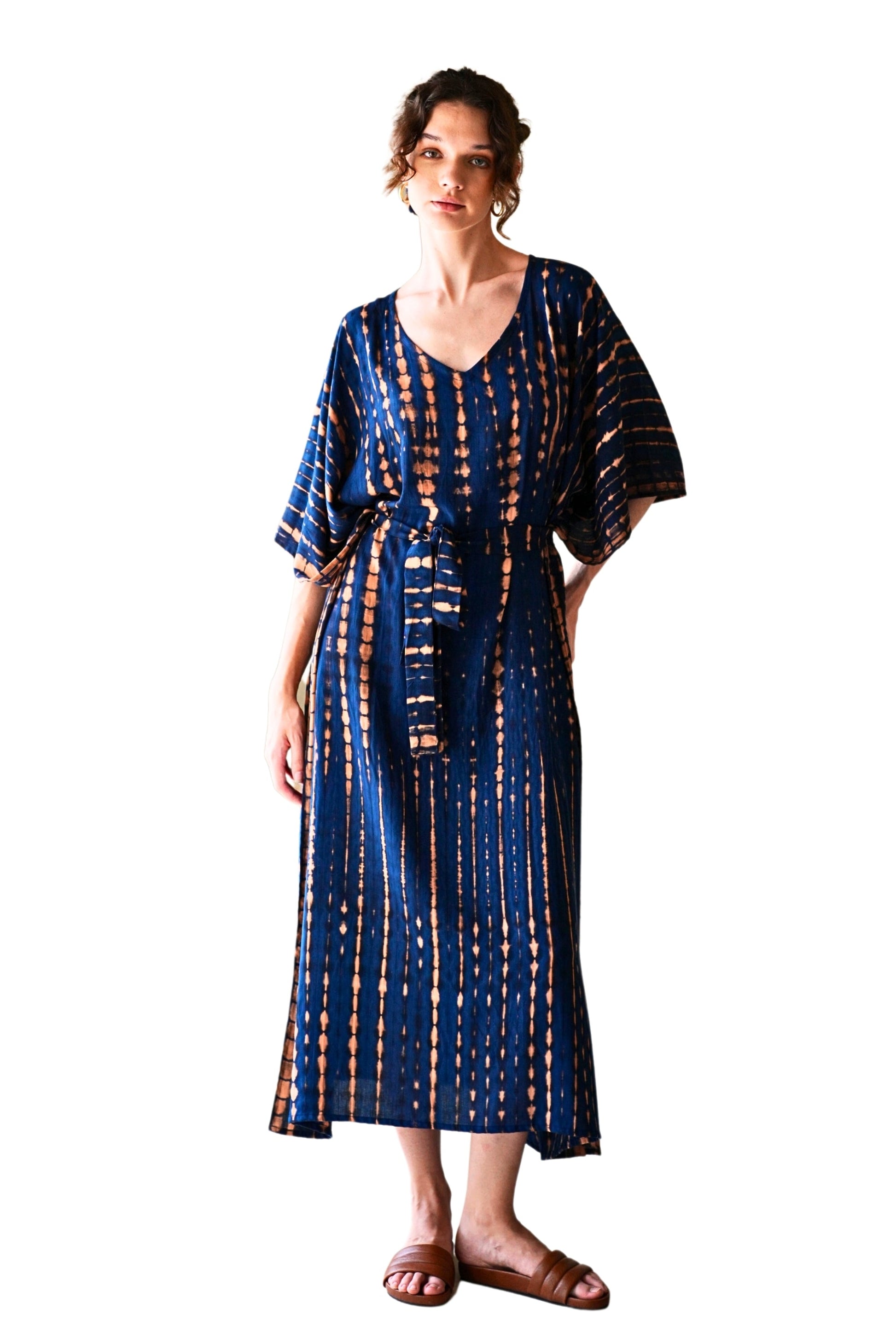 Stand out with this head-turning V-neck sweeping silhouette, this kaftan dress calls to mind dreamy days spent at home or going to a yoga class. We created garments that are meant to last season after season. Each garment is carefully tailored made by our small team of women artisans in Bali from the comfort of their own homes. Our model is 5’9” Size S and is wearing One Size. Lay flat measurement: Shoulder to hem 50”. Handwash cold. Lay flat to dry. 100% Rayon. Handmade with love in Bali. Shipping & Returns: Return accepted for store credit only. Please see our Shipping & Returns page for more details.