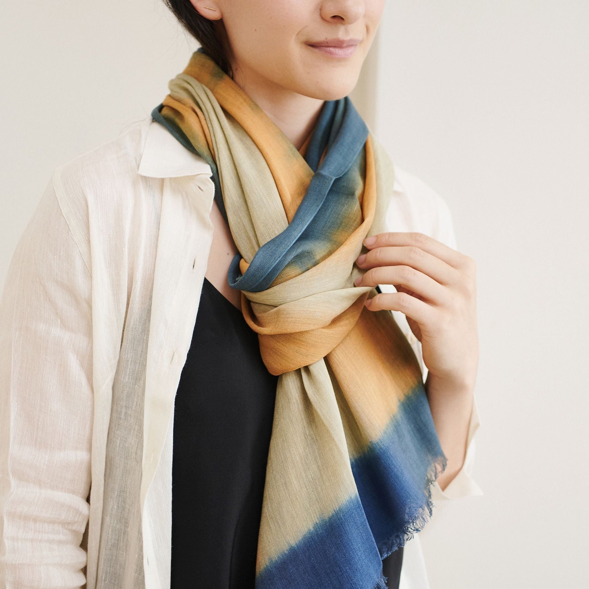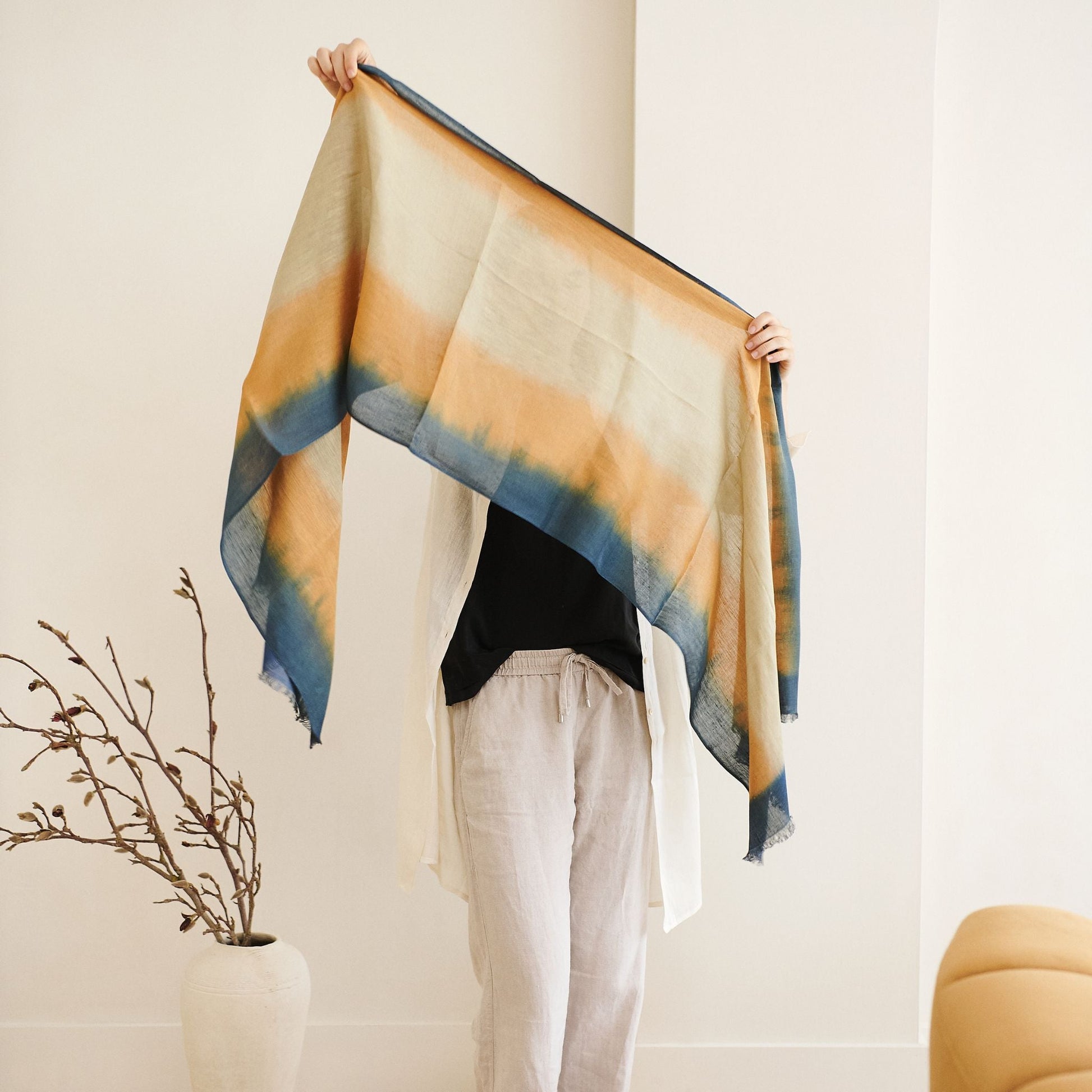 Oceana is a timeless scarf handwoven by weavers in Nepal with whom we directly collaborate without any middlemen. Soft in hand feel this classic scarf has been hand dyed in ombre effect to give it a soothing look that also makes it a unisex piece. This scarf can be worn all year around, suitable for travel, freezing offices or a full day drape that can be easily styled with multiple outfits. Plant based pure linen with pure silk blend makes this scarf naturally textured and breathable as a textile. Linen keeps it cool in summer and silk adds a gentle warmth when it's chilly outside. A thoughtful gift or a personal purchase, this softly textured scarf is a sustainable purchase supporting artisan communities ethically. Material: Linen Silk blend Size: 56 cm x 200 cm Color: Sand, Cream, Indigo Blue Artisan base: Ethically and responsibly handwoven by artisans in Nepal. Wash care: Gently hand wash using gentle detergents. Hang dry in cool shaded place or delicately dry clean only. What Makes Your Purchase Sustainable ? Eco-Swiss dyes. Support employment of handloom weavers. 100% handmade manufacturing process by artisans. Use only 100% natural responsibly sourced materials. Small batch production ensures higher quality & less wastage.