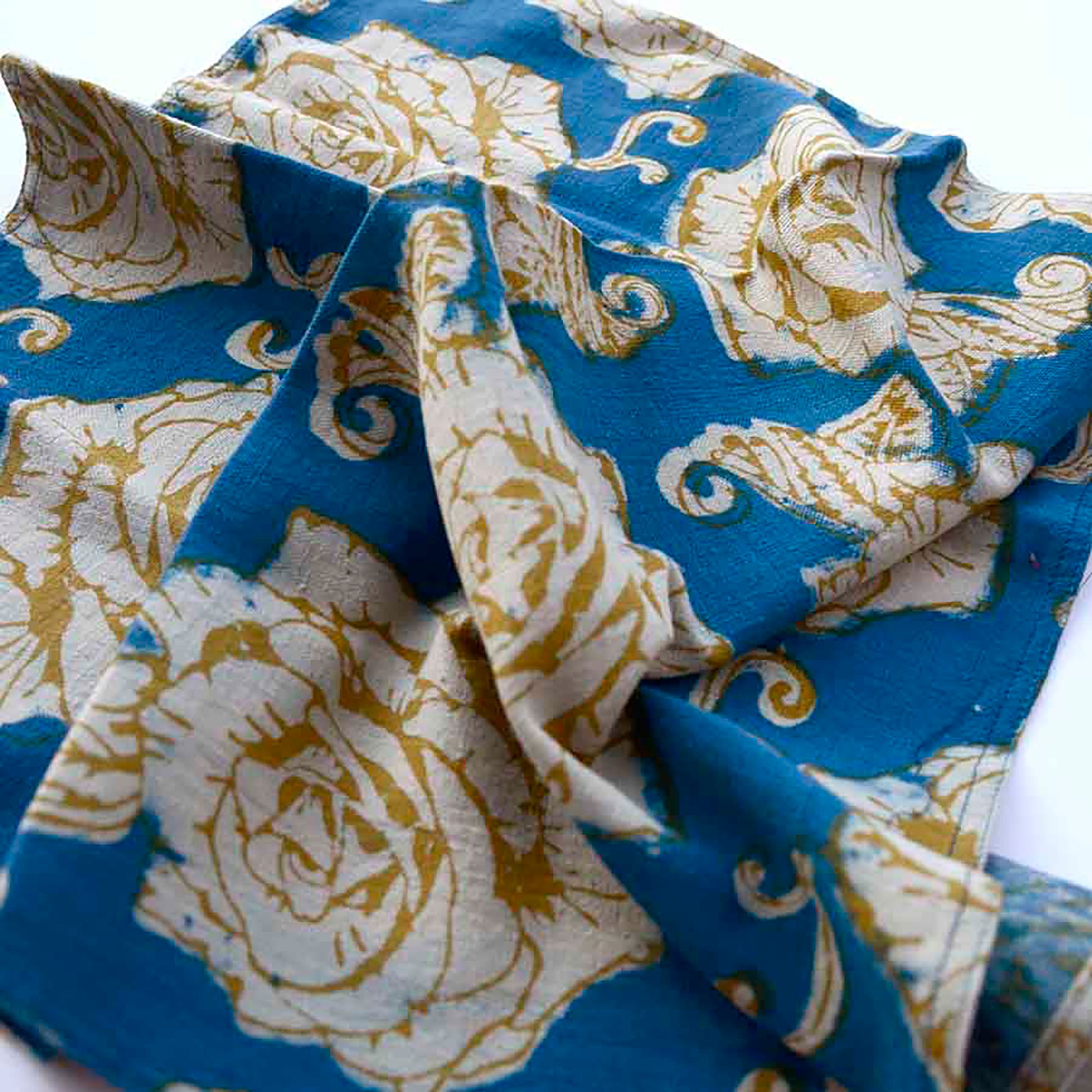 These floral napkins are inspired by the Rose flower. This large rose pattern in gold and dipped in indigo - is printed by hand using a carved wooden block, one rose at a time. It's unique and beautiful and definitely will be the talk of your party. You can also take it to your picnics, or use it as dish towels. They are easy to wash and re-use! Pair them with our Yan Table cloth and Golden Rays table runner and you've got a great setting.