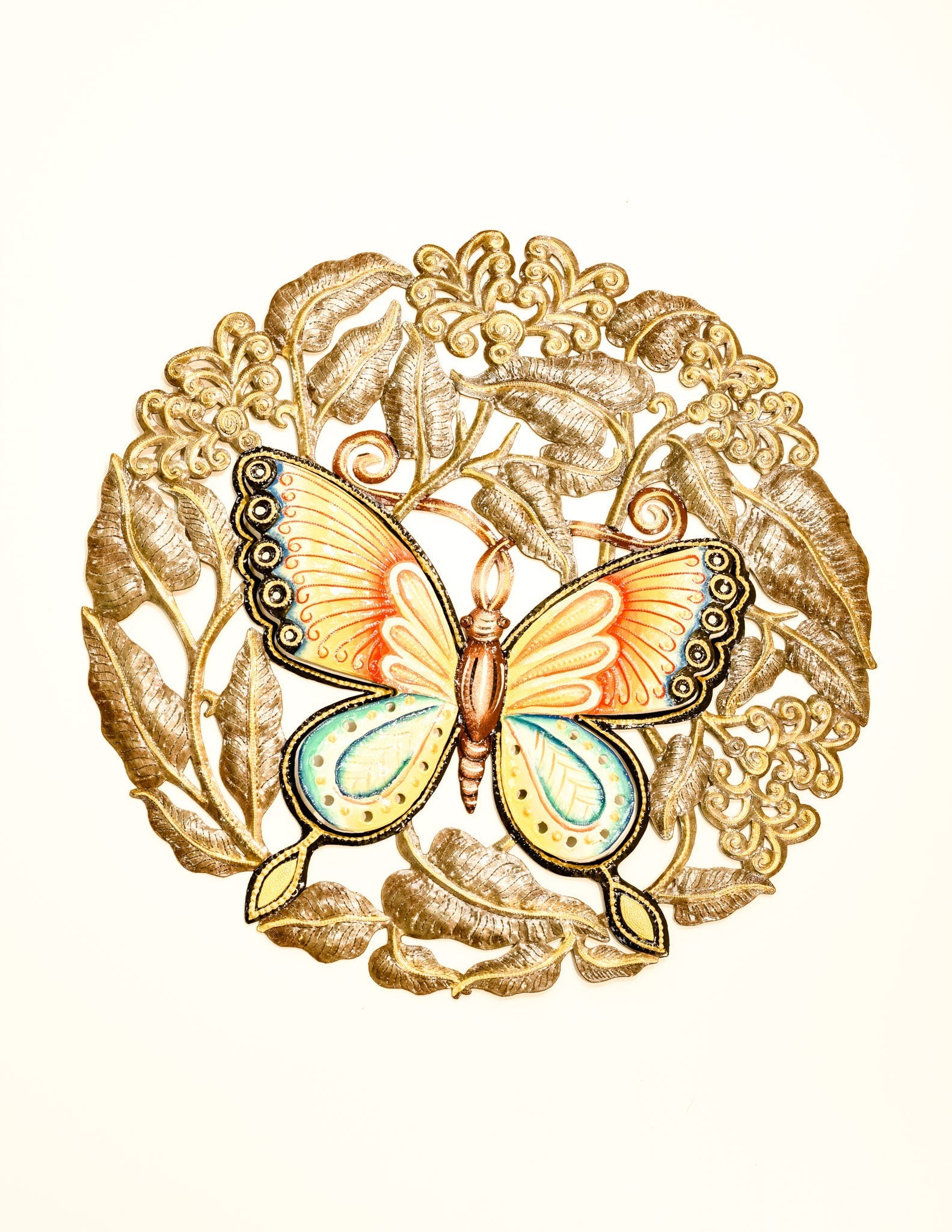 Painted 3D Hiding in the Leaves is a‚ one-of-a-kind Haitian metal art masterpiece made for indoor and outdoor decorative use. Gorgeously‚ detailed and vibrantly painted, Painted 3D Hiding in the Leaves features a unique 3D butterfly design that‚ will make a visual statement in any home, patio, or garden area.