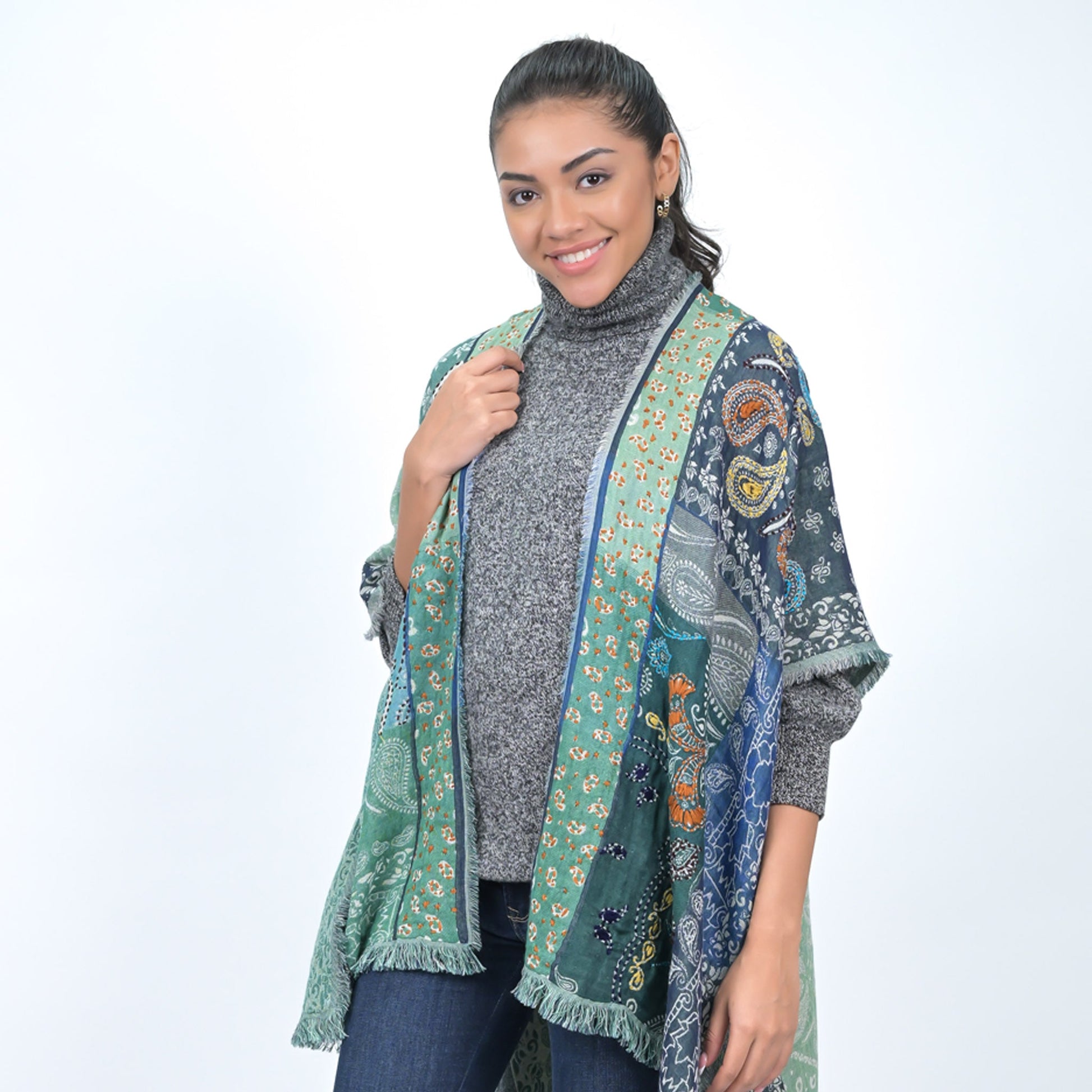 The Paloma Paisley Poncho in Green is set to become the most worn topper in your rotation. This stunning, versatile piece that adds a touch of bohemian flair to any wardrobe. This poncho features a vibrant multicolor patchwork design, blending delicate ditsy floral and classic paisley prints for a charming, eclectic look. The frayed edges provide a relaxed, laid-back finish that complements its artistic design. Crafted from a lightweight blend of cotton and wool, the Paloma Paisley Poncho offers both comfort and style, making it perfect for layering in any season. Whether worn over dresses in spring or layered with cozy sweaters in fall, this poncho is the ideal topper to complete any outfit. Stay chic and stylish year-round with this beautifully crafted poncho that effortlessly combines elegant prints and lightweight warmth. DETAILS Gold Flake Kimono with Embroidery MATERIAL: 88% Cotton 12% Wool CARE: Dry-clean SIZE: • Length: 33" • Across shoulder front: 38 1/2" • Waist: 38 1/2" • Chest measured 1" below armhole: 38 1/2" • Bottom width: 39" Designed in Los Angeles Made in India