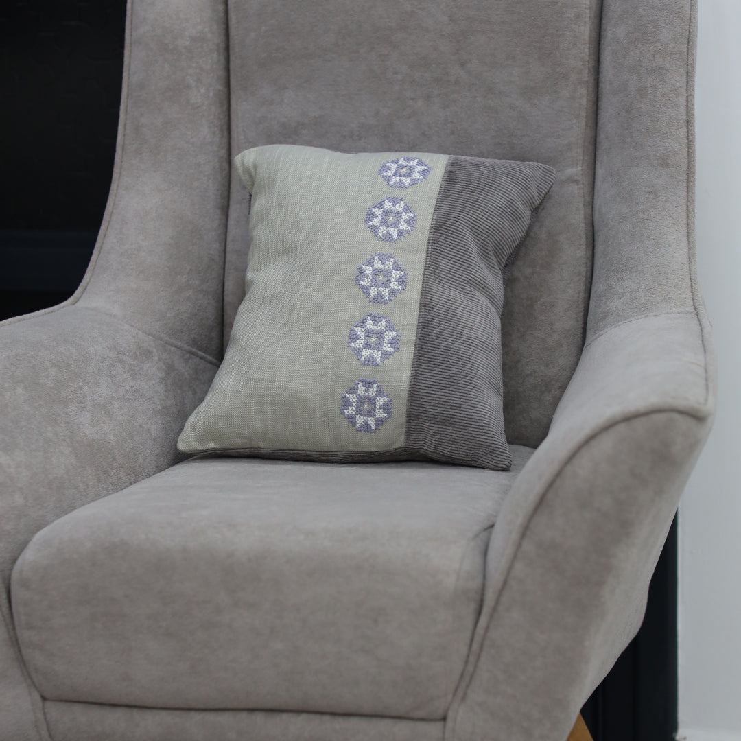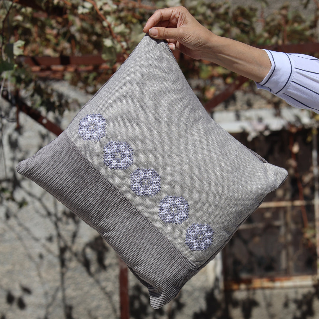 Gray Shaded Pillow Cover is a great way to add a pop of color to your living space. Embroidered with a beautiful tatreez design, you can share your Palestinian heritage with all your guests. The tatreez designs embroidered on this pillow are pieces abstracted from the "Maha" tatreez motif. Our products are hand-crafted by a small community of women artisans from the West Bank. When you buy from us, you can feel good knowing that a real pair of hands was behind every stitch of fabric. Shop with us to support the real women behind the products. Product Details: Pillow Cover measures 18” x 18” Machine wash on delicate cycle Locally sourced cotton blend fabric Pillow insert not included
