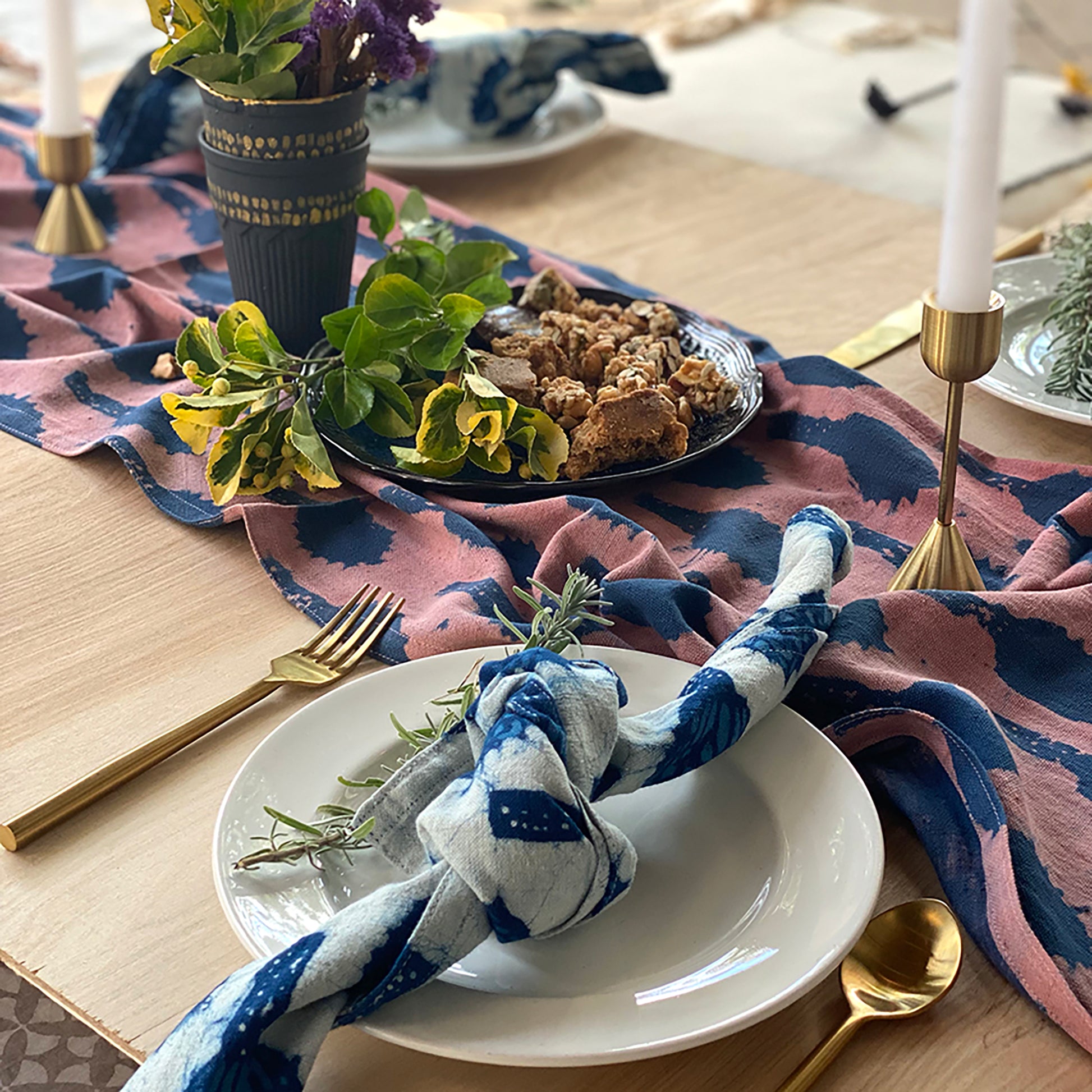 These organic cloth napkins are inspired by the Magnolia flower. The pattern is printed by hand using a carved wooden block and then dyed in Indigo. The cracks in the white space looks like batik printing and comes from the cracking of mud paste. When the mud dries and cracks, the Indigo takes the opportunity to freely seep in and celebrate!