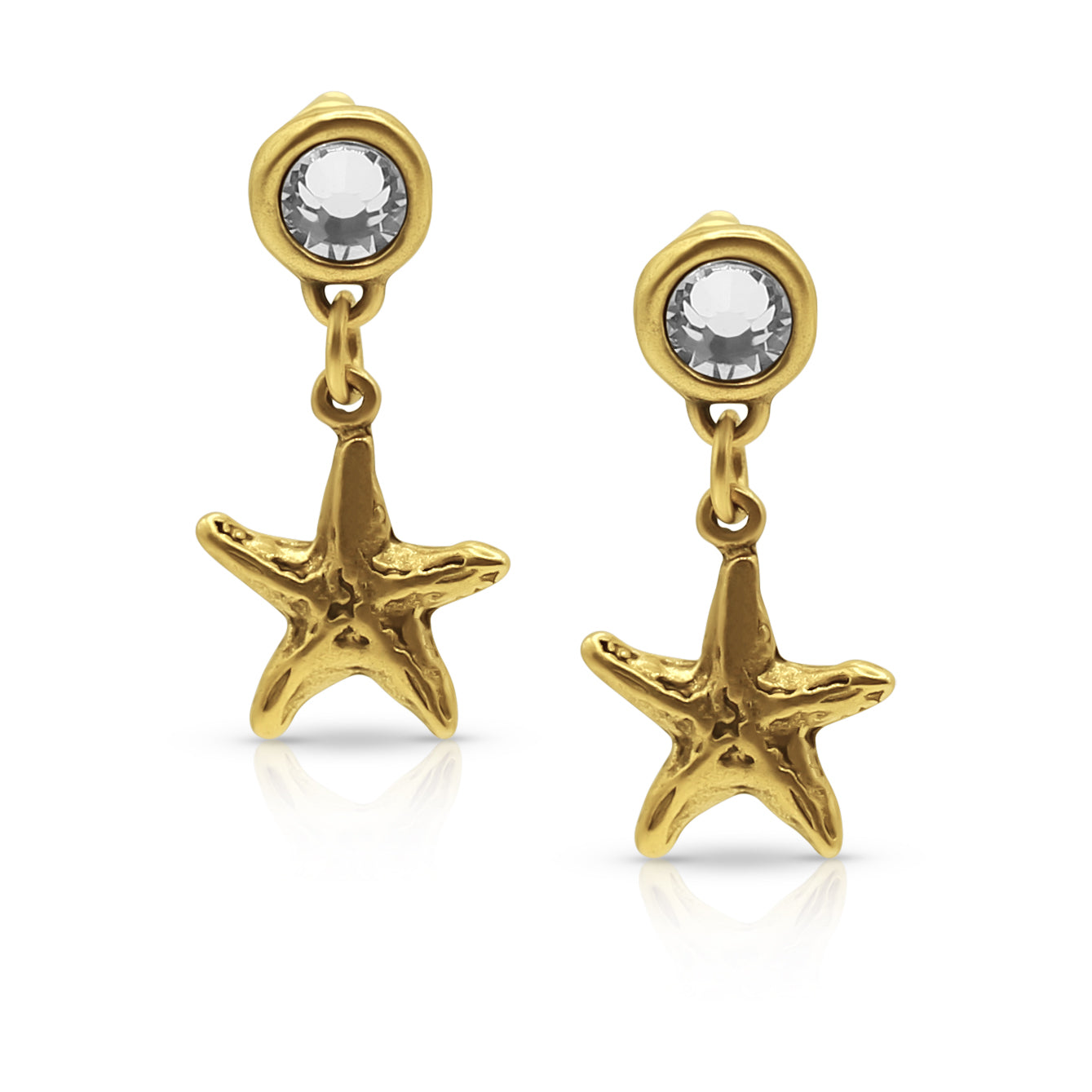 The Serene Earrings combine subtle sparkle with coastal elegance. Each earring showcases a radiant cubic zirconia stud paired with a delicate starfish charm that glimmers with movement. Finished in 12k gold plating and inspired by sun-drenched beaches, these lightweight earrings offer comfortable wear for daily use. As a key piece in our Sun + Salt Collection, they add a refined, ocean-inspired glow to your summer accessories.
