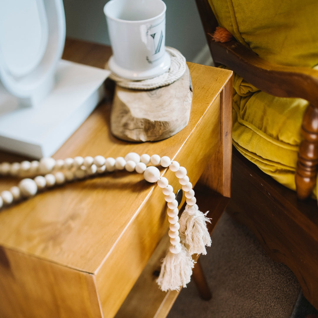 Add a touch of calm to your most sacred spaces with the handmade, fair trade Serenity Bead Garland. The hand strung blonde wood beads and 100% cotton tassel bring interest and texture, while neutral enough to blend seamlessly into your existing home décor style. Try the garland coiled inside your favorite bowl or basket on a coffee table, or hang the strand above your bed for a tranquil accent to your sleeping space. Wherever you place this beautiful piece, let it be a reminder to prioritize peace in your daily life. Material: Cotton Rope Size: The garland measures approximately 55" from end to end (including tassels)