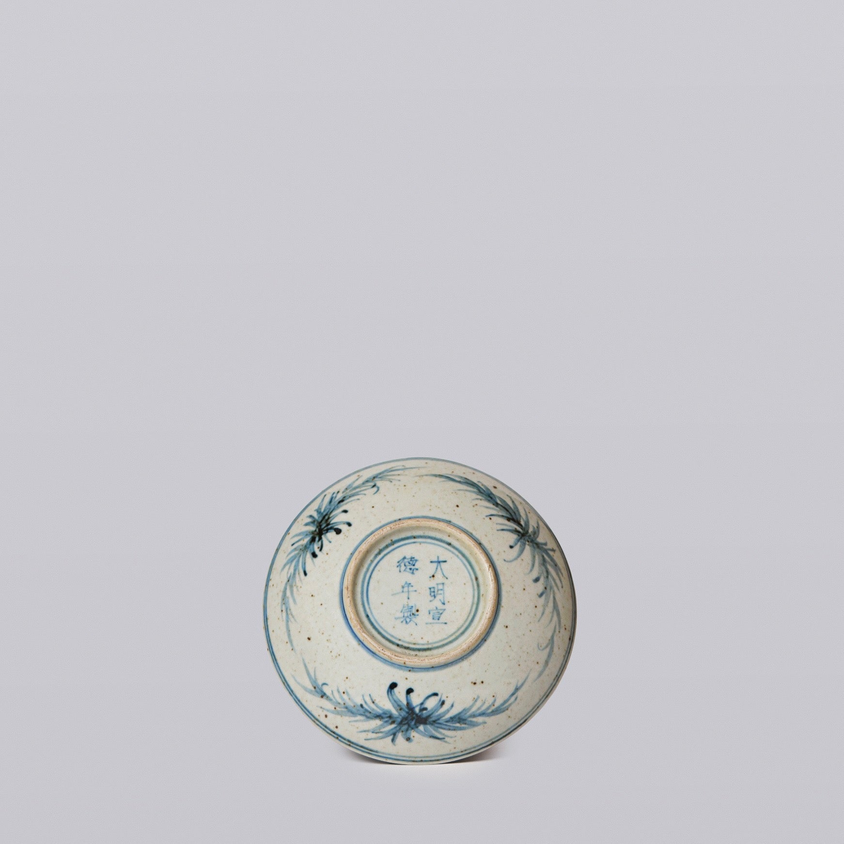 Cobalt Guild offers an assortment of blue and white porcelain vessels from the antiques markets of Jingdezhen, a town long distinguished by imperial patronage. This piece is a small hand painted dish with an auspicious red-crowned crane motif, which symbolizes fidelity, 6 3/8" x 1 3/8"