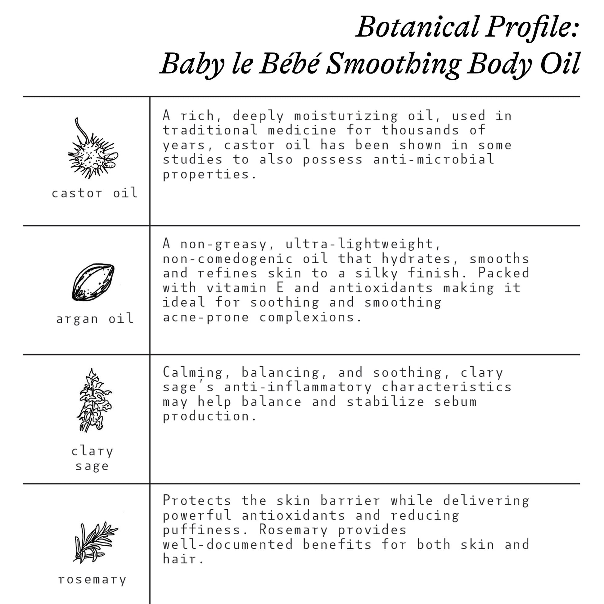 YUKA score: 100/100Forget everything you think you know about body oils, and get your best glow ever – naturally. Baby le Bébé Smoothing Body Oil effectively and luxuriously smooths, moisturizes, and softens even the driest and most damaged skin. This ultra-premium body oil is made with a 100% natural, 99% organic-origin blend of deeply renewing castor oil, antioxidant-rich rosehip oil, and ethereally light argan oil, supercharged with the skin-boosting power of clary sage, rosemary, bergamot, and basil. TO USE: Apply alone or as a finishing oil after moisturizers for a nourishing, and over time, refining hydration lock. Ingredients from 100% botanical origin. Always free from all synthetics, fillers, preservatives, and petroleum. Nutrient Summary: Vitamin A, vitamin C, vitamin E, vitamin K, polyphenols, flavonoids, tocopherols, oleic acid, linoleic acid, omega acids including 3, 6, and 9. Usage and Tips: •Apply right after showering to lock in moisture. •Use as a massage oil for a relaxing experience. •Mix with your favorite lotion for added richness. •Apply to pulse points for a subtle scent. •Use a single drop on dry hair ends for a smooth finish. Get creative: Add a few drops to your bath for a spa-like experience. Ingredients: RICINUS COMMUNIS SEED (castor) OIL*, ROSA RUBIGINOSA SEED (rosehip) OIL*, ARGANIA SPINOSA KERNEL (argan) OIL*, CITRUS AURANTIUM BERGAMIA FRUIT (bergamot) OIL, ROSMARINUS OFFICINALIS LEAF (rosemary) OIL*, SALVIA SCLAREA (clary sage) OIL*, OCIMUM BASILICUM (basil) OIL* *denotes organic ingredient