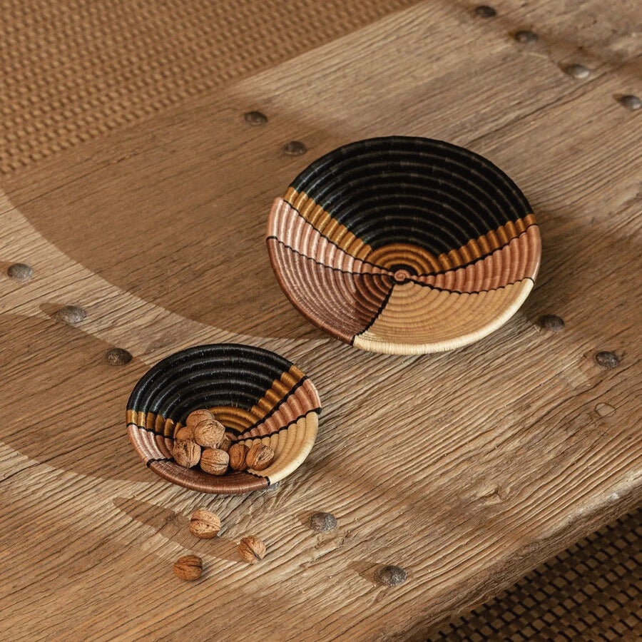 One of our best-selling signature plateaus baskets made in Rwanda with a one-of-a-kind handwoven design. 12" W x 3" H Hand-dyed in a variety of colors including dark blue, tan, and blush Made from strands of sisal and raffia wrapped around bunches of sweetgrass Includes a loop on the back for hanging Made from locally sourced fibers The ideal housewarming gift and the perfect shape and size to be used as a fruit basket hung in a cluster on a gallery wall or simply placed as an accent piece in your favorite nook around the house or office. *Due to the handmade quality, some size and color variation may occur. Impact The artisan sector is the second largest employer in the developing world. Yet the majority of artisans are women who lack access to export markets, business skills, and the financial tools needed to run successful global enterprises. We are dedicated to changing that by investing 100% of our profits into education programs for the women who handcraft our products and youth in their communities. Since 2007, we've provided over 1,100 artisans and 250 young people in Rwanda & Ghana with employment opportunities, entrepreneurship training, and consistent access to the global export market. That's Impact. Care Instructions spot clean bright colors will fade in direct sunlight