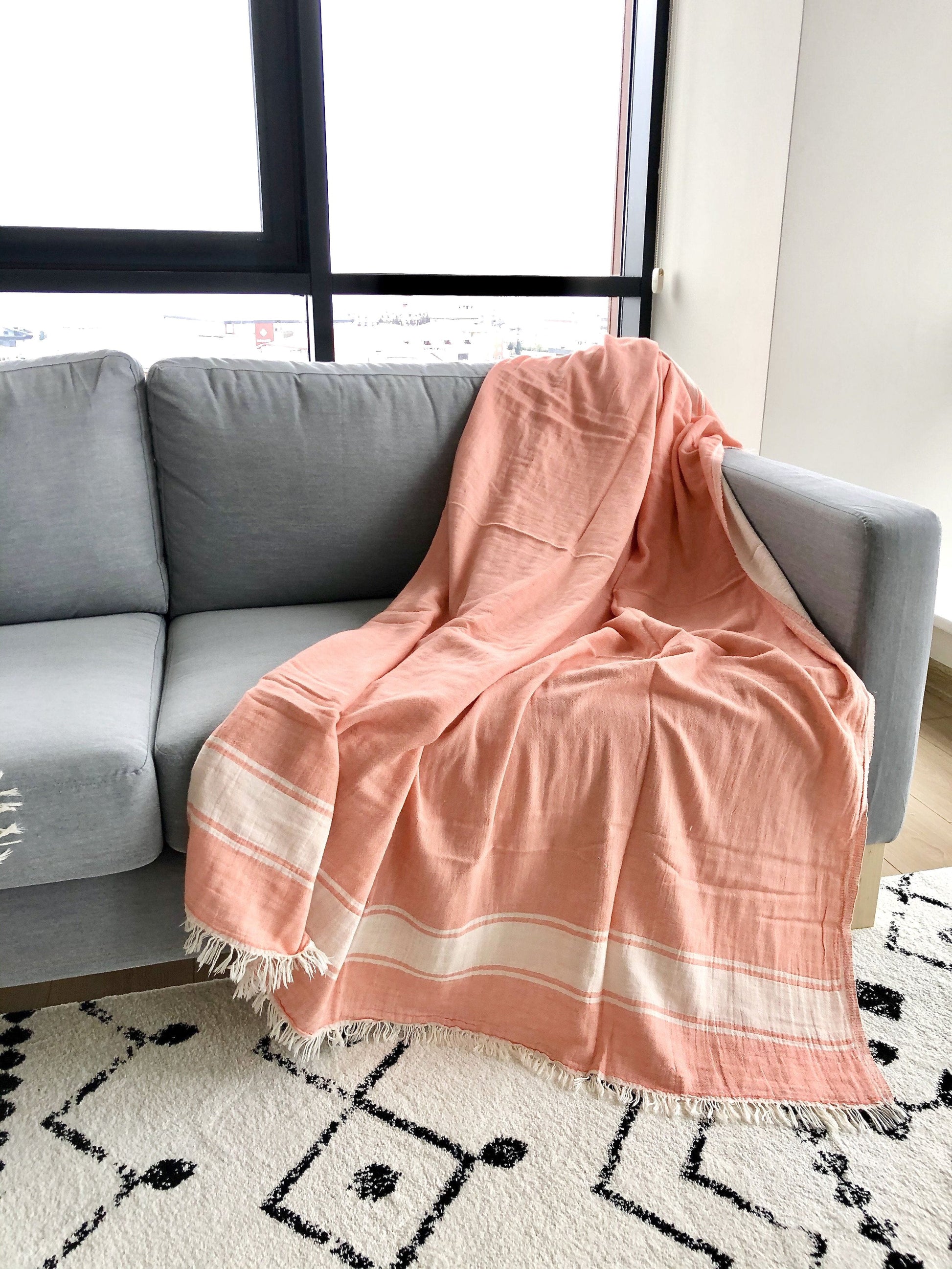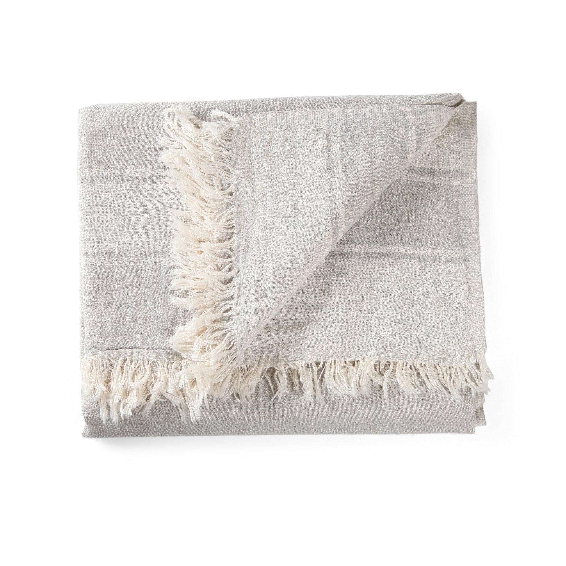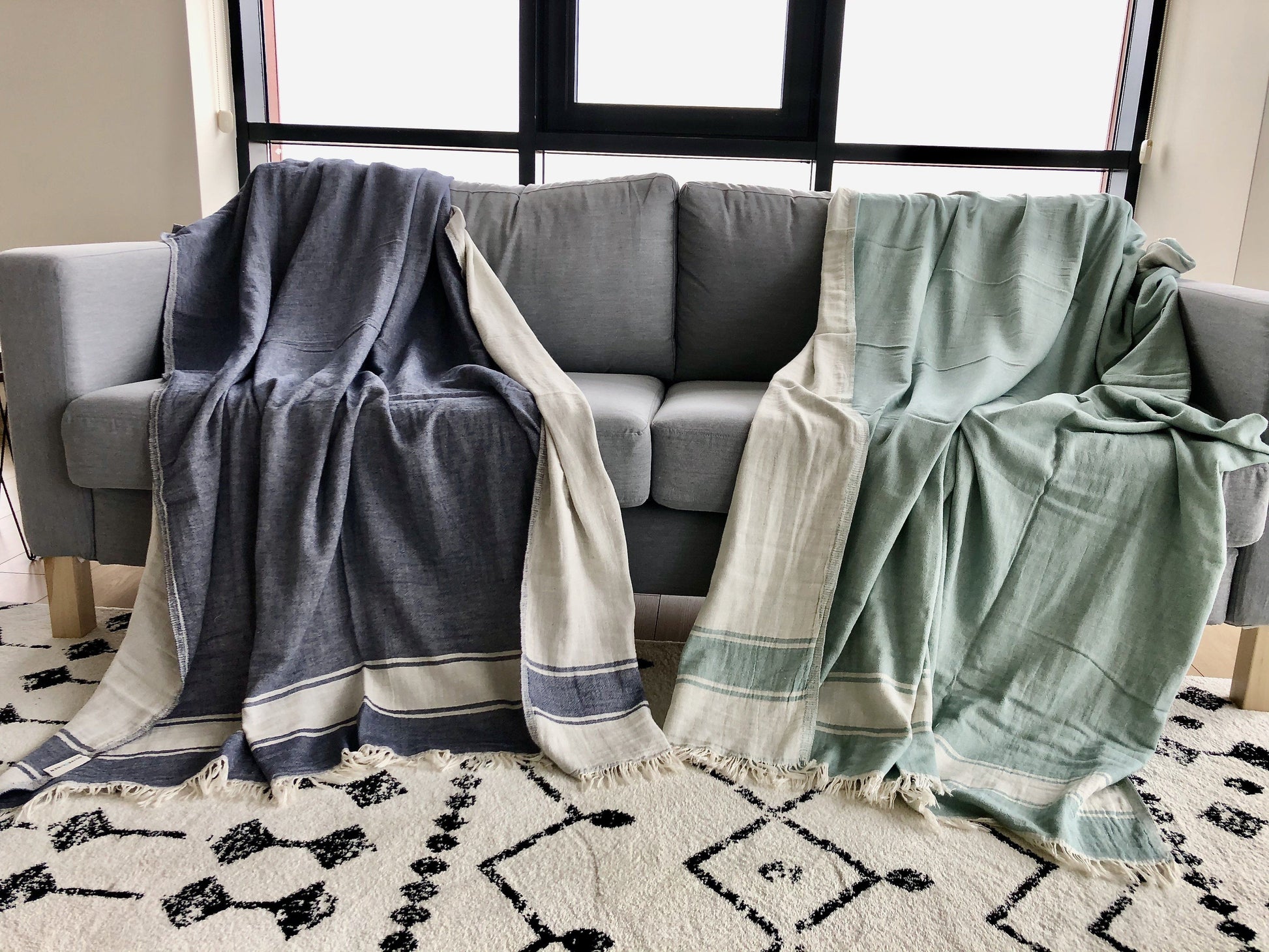 Expertly hand crafted from 2 ply gauze fabric woven from premium long-staple Turkish cotton, the Summer Throw is reversible with contrasting colors on each side. 2 ply gauze construction from 100% long-staple Turkish cotton Yarn died and garment washed for added softness Naturally soft texture and frayed edges add a relaxed appeal Super soft, breathable and luxurious Feels fresh and cool for summer yet substantial enough for winter Double-sided for added color options Perfect addition for your sofa, bed or baby's nursery OEKO-TEX® STANDARD 100 certified, IS025 168850 OETI Free of harmful chemicals and dyes – good for you and the environment Made in Turkey ______________________________________________ Materials: 100% Premium Turkish Cotton Size: 59"X72" Weight: 500g/17.6oz Care: Hand wash in cold water, hang to dry Handcrafted by Olive and Linen ______________________________________________