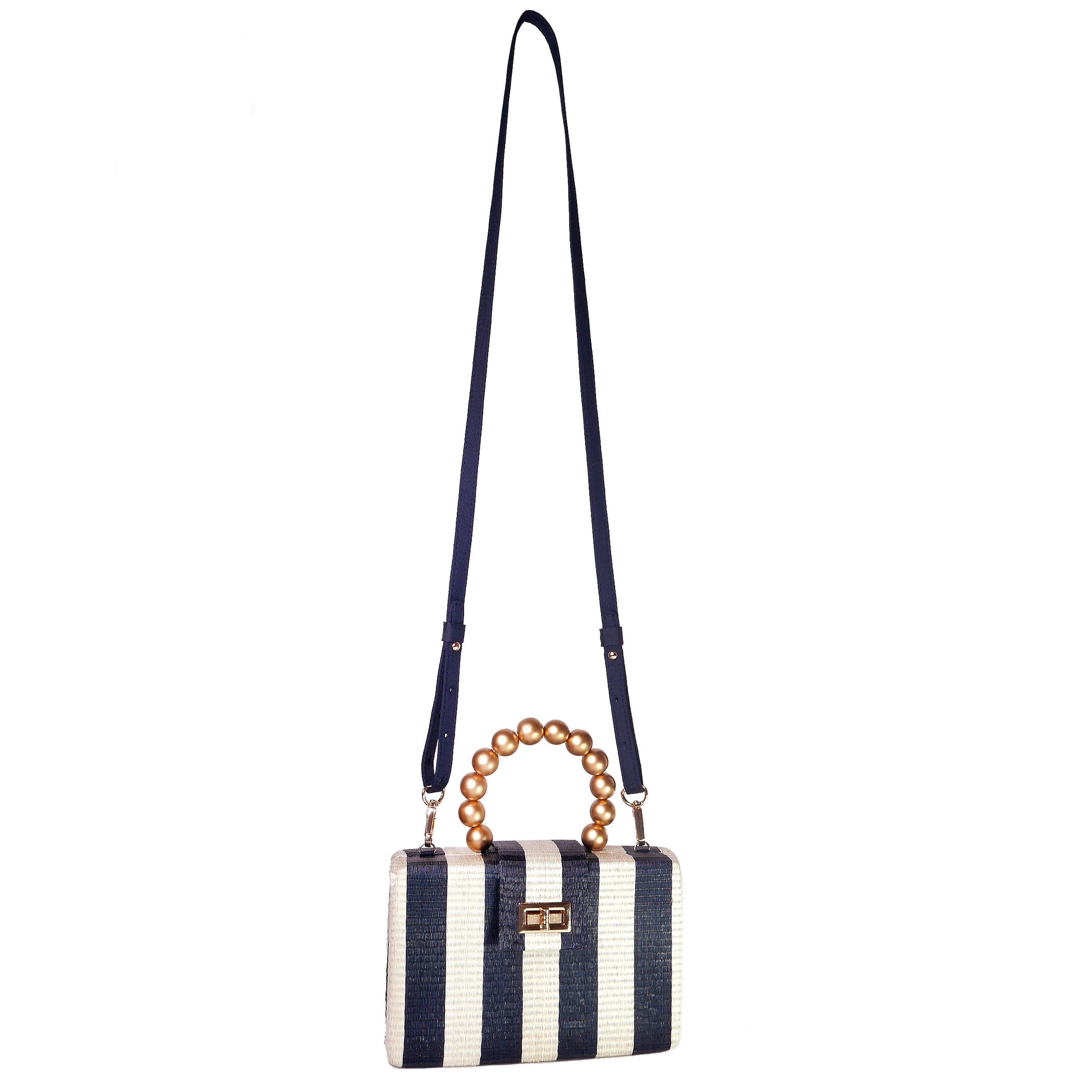 PRE ORDER NOW FOR DELIVERY END OF JULY Introducing the Louisa Clutch in a sophisticated navy and cream colorway. This elegant accessory effortlessly blends nautical luxe with timeless resort elegance. Key features: - Handcrafted from premium buntal straw in a striking navy blue and cream stripe pattern - Statement gold wooden bead top handle for effortless carrying - Versatile design suitable for both daytime adventures and evening soirées - Adjustable crossbody strap The Louisa Clutch in navy and cream showcases the intricate beauty of buntal straw weaving, a traditional Filipino craft elevated to new heights with its sophisticated striped design. The alternating navy and cream stripes evoke images of crisp sailing uniform and sun-bleached deck chairs. It effortlessly transitions from daytime yacht excursions to elegant evening soirées. Its generous size accommodates all necessary items without compromising on style, making it the perfect companion for any upscale vacation activity. Size: 8.5" x 9" x 2.5"