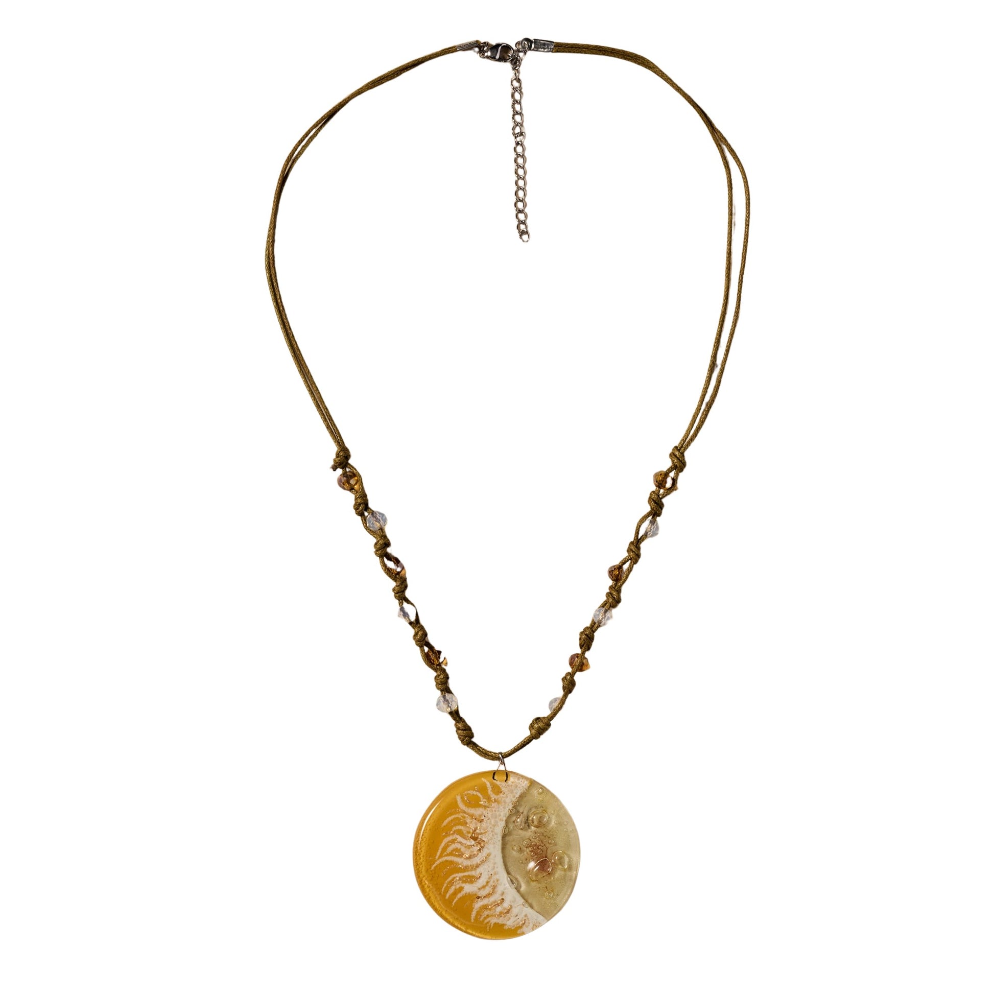Rise with purpose and shine with subtle elegance. This stunning necklace captures the quiet beauty of a setting sun with a handcrafted glass pendant that fades from brilliant yellow to soft white and crystal-clear transparency. Suspended from a cotton cord adorned with knotted brown and opalescent glass beads, this piece radiates warmth and artistry in every detail. An adjustable steel cable chain with a lobster clasp offers a comfortable fit for any neckline. A Ten Thousand Villages Exclusive handcrafted in Chile. Coordinates with 8703200.