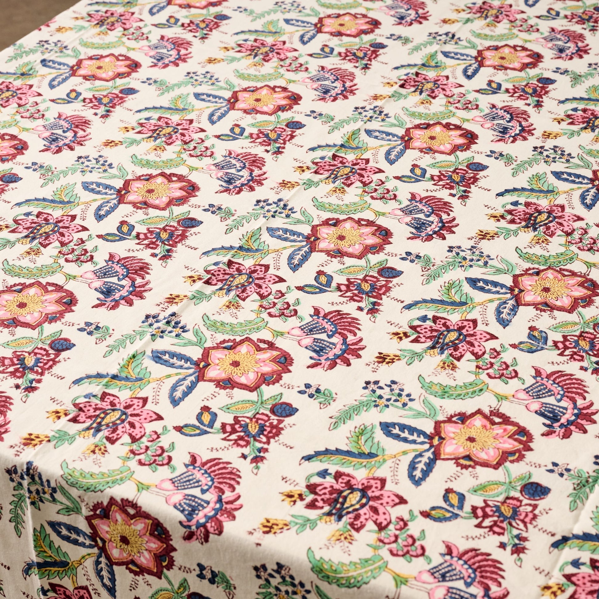 Whether entertaining or enjoying an everyday meal, this stunning hand block-printed tablecloth elevates any dining experience. Made of soft cotton, its vibrant floral center echoes the twin vine borders in rich red, blue, green and yellow. A crisp white background completes the look making it the perfect elegant touch for weekday dinners or festive special occasions. Handcrafted in India by the artisans of Craft Resource Center Pvt. Ltd. (CRC), a guaranteed Fair Trade Organization creating sustainable income opportunities for marginalized communities by blending traditional skills and ethical practices with globally competitive design, quality and innovation while preserving the dignity of labor and empowering artisans through fair trade, technology and skill development. Coordinates with 6896570.